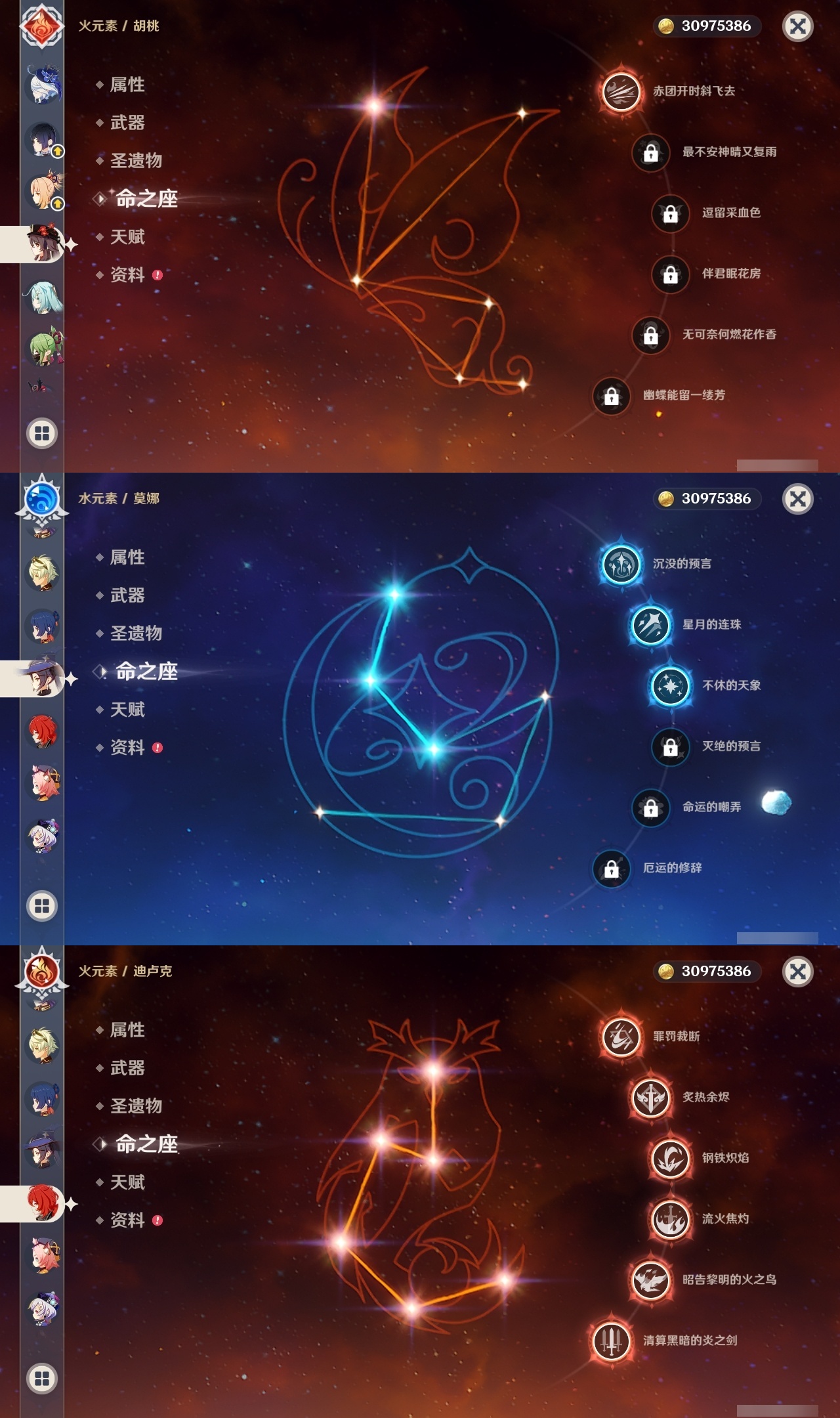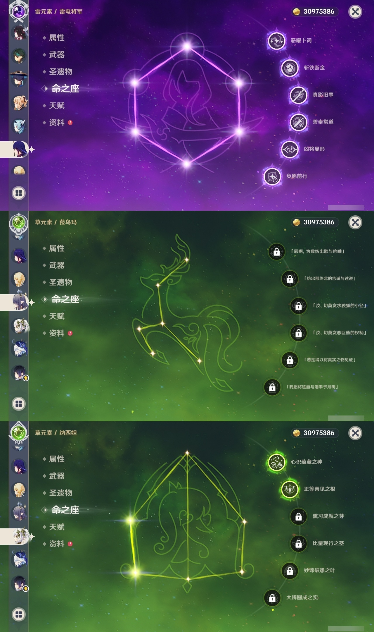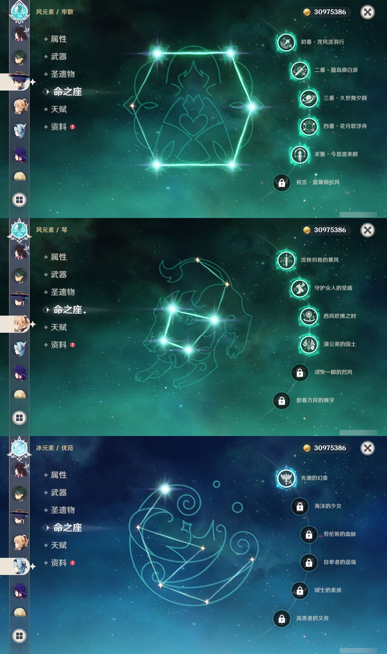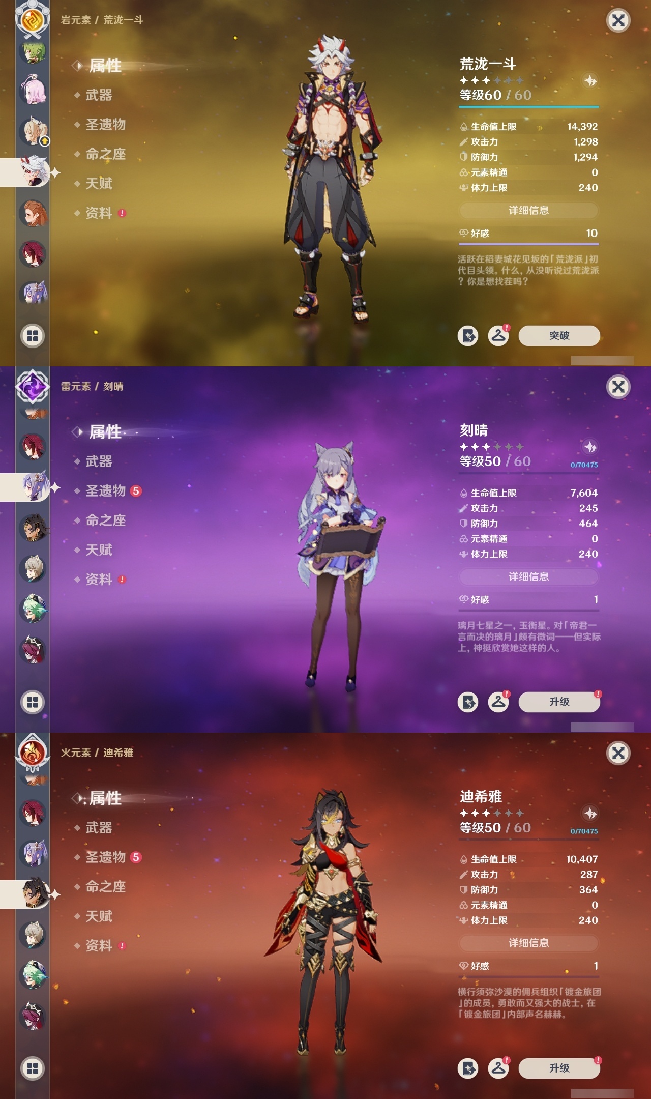 【原神】满命,冒险等级:60,五星数量:46,五星角色:迪卢克 6命魈 6命雷电将军 6命七七 6命夜兰 6命流浪者 5命琴 4命莫娜 3命提纳里 3命枫原万叶 2命纳西妲 2命甘雨 1命胡桃 1命刻晴 1命优菈 1命神里绫华宵宫迪希雅钟离荒泷一斗芙宁娜菈乌玛哥伦比娅可莉__五星武器:阿莫斯之弓 3精静水流涌之辉血染荒城裁叶萃光风鹰剑护摩之杖狼的末路松籁响起之时天空之傲天空之脊天空之卷天空之刃无工之剑雾切之回光薙草之稻光终末嗟叹之诗息灾神乐之真意若水千夜浮梦__四星角色:班尼特 6命行秋 6命九条裟罗 6命香菱 6命鹿野院平藏 6命珐露珊 6命凝光 6命迪奥娜 6命砂糖 6命瑶瑶 6命莱依拉 6命多莉 6命卡维 6命芭芭拉 6命云堇 6命烟绯 6命辛焱 6命诺艾尔 6命罗莎莉亚 6命雷泽 6命菲谢尔 6命北斗 6命夏沃蕾 6命嘉明 6命伊法 6命柯莱 5命早柚 5命五郎 5命重云 5命爱诺 5命米卡 4命琳妮特 3命久岐忍 2命绮良良 2命托马 2命欧洛伦 1命夏洛蒂 1命赛索斯 1命埃洛伊奇偶·女性卡齐娜坎蒂丝菲米尼
