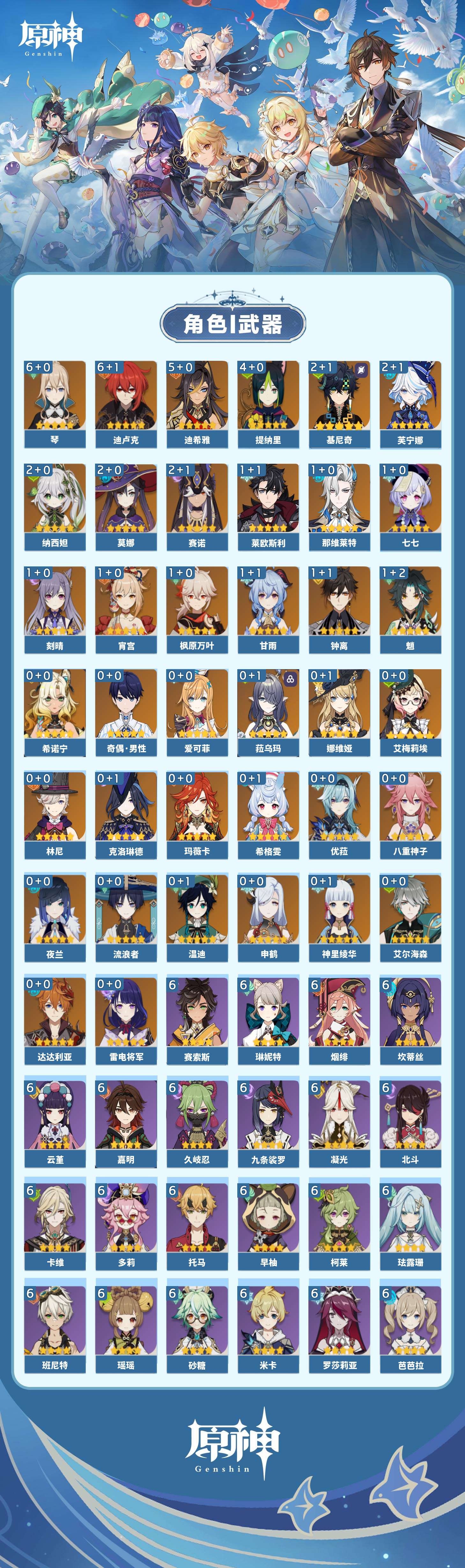 【原神】【lyys11388】冒险等级:60,五星数量:58,五星角色:迪卢克 6命琴 6命迪希雅 5命提纳里 4命基尼奇 2命芙宁娜 2命莫娜 2命赛诺 2命纳西妲 2命那维莱特 1命莱欧斯利 1命枫原万叶 1命甘雨 1命魈 1命刻晴 1命七七 1命宵宫 1命钟离 1命艾梅莉埃希诺宁神里绫华温迪玛薇卡优菈达达利亚申鹤八重神子林尼夜兰娜维娅爱可菲菈乌玛艾尔海森流浪者克洛琳德希格雯雷电将军__五星武器:天空之傲 3精和璞鸢 2精山王长牙金流监督静水流涌之辉裁断纺夜天镜阿莫斯之弓狼的末路天空之脊天空之卷天空之刃天空之翼雾切之回光终末嗟叹之诗赤角石溃杵贯虹之槊赤沙之杖赦罪白雨心弦__四星角色:班尼特 6命行秋 6命九条裟罗 6命香菱 6命久岐忍 6命鹿野院平藏 6命珐露珊 6命凝光 6命迪奥娜 6命砂糖 6命瑶瑶 6命米卡 6命坎蒂丝 6命多莉 6命柯莱 6命卡维 6命芭芭拉 6命云堇 6命早柚 6命托马 6命烟绯 6命重云 6命辛焱 6命诺艾尔 6命罗莎莉亚 6命雷泽 6命菲谢尔 6命北斗 6命琳妮特 6命嘉明 6命赛索斯 6命绮良良 5命莱依拉 5命五郎 5命卡齐娜 4命夏沃蕾 4命伊安珊 4命夏洛蒂 2命蓝砚 1命菲米尼 1命塔利雅 1命奇偶·男性欧洛伦伊法爱诺