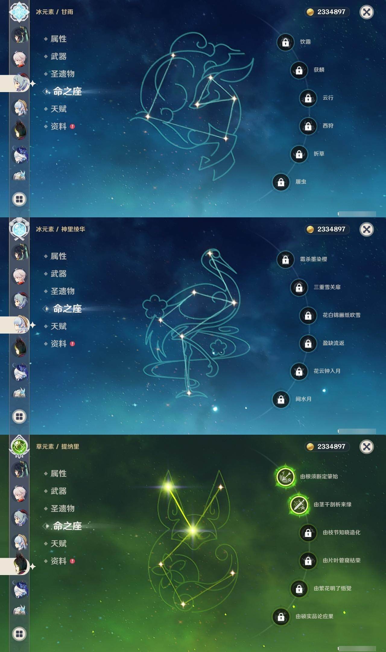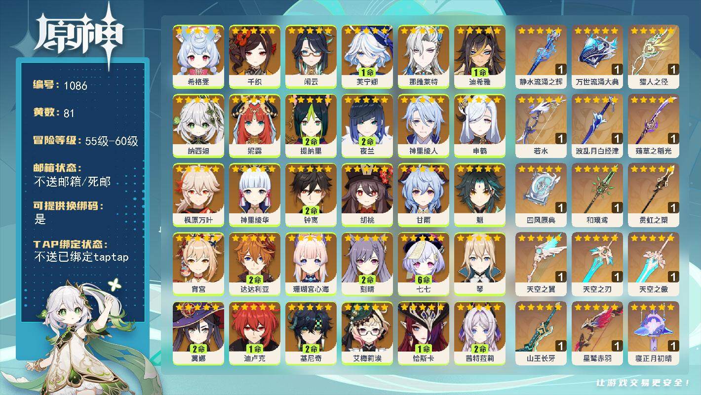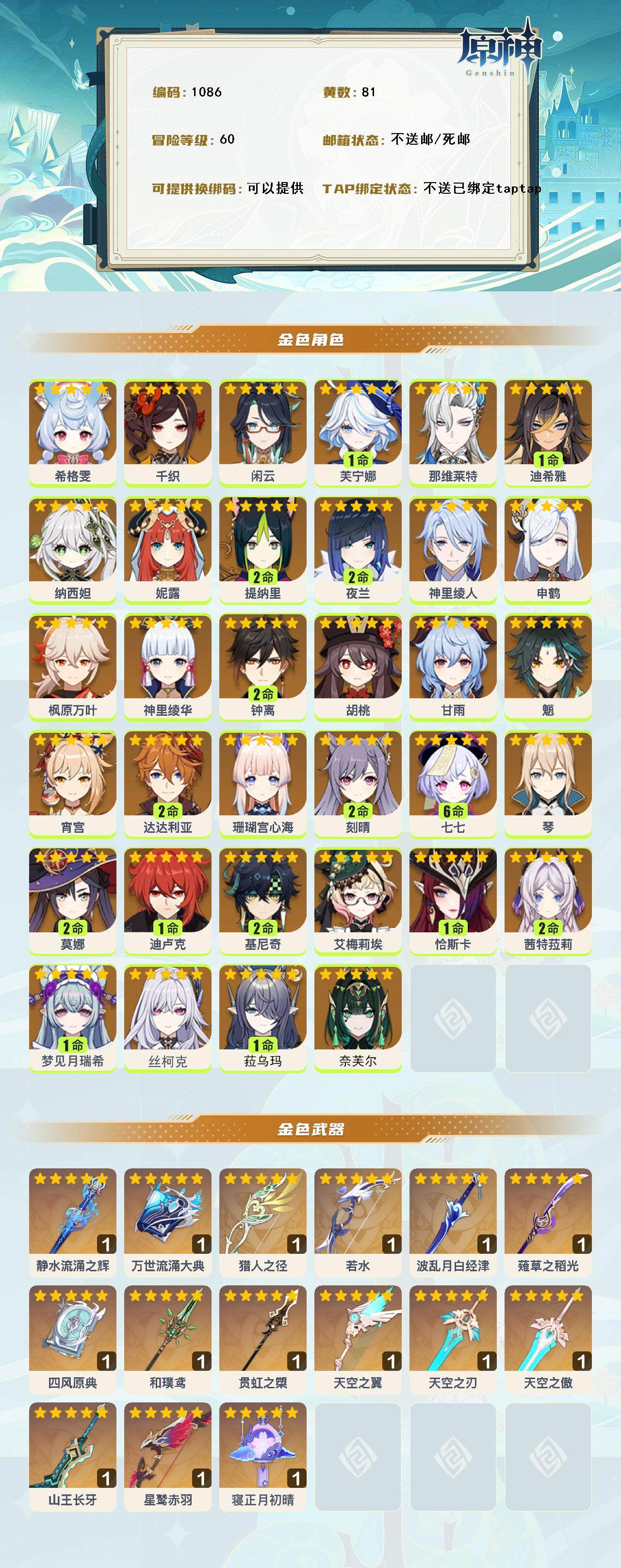 [14760831]60级/81黄/男主/34个五星角色/19个五星武器 0命希格雯0命千织0命闲云1命芙宁娜0命那维莱特1命迪希雅0命纳西妲0命妮露2命提纳里2命夜兰0命神里绫人0命申鹤0命枫原万叶0命神里绫华2命钟离0命胡桃0命甘雨0命魈0命宵宫2命达达利亚0命珊瑚宫心海2命刻晴满命七七0命琴2命莫娜1命迪卢克2命基尼奇0命艾梅莉埃1命恰斯卡2命茜特菈莉1命梦见月瑞希0命丝柯克1命菈乌玛0命奈芙尔精1静水流涌之辉精1万世流涌大典精1猎人之径精1若水精1波乱月白经津精1薙草之稻光精1四风原典精1和璞鸢精1贯虹之槊精1天空之翼精1天空之刃精1天空之傲精1山王长牙精1星鹫赤羽精1寝正月初晴