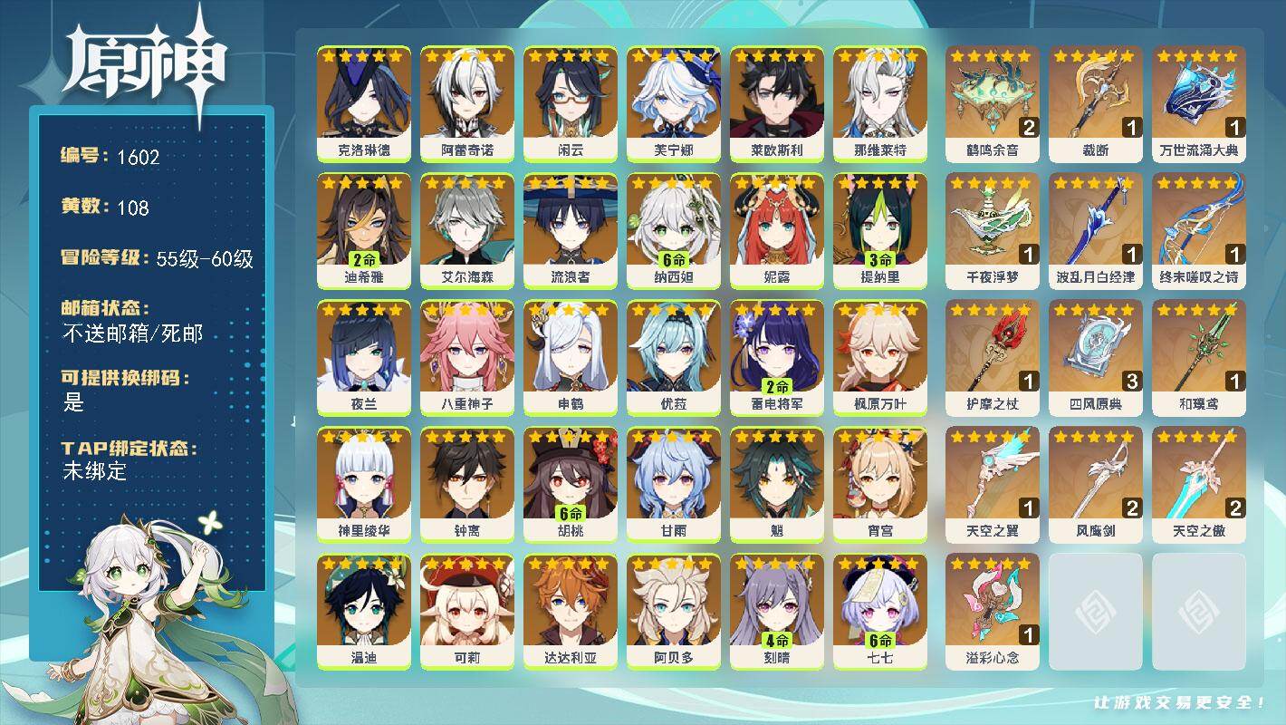 [15850413]60级/108黄/女主/38个五星角色/15个五星武器 0命克洛琳德0命阿蕾奇诺0命闲云0命芙宁娜0命莱欧斯利0命那维莱特2命迪希雅0命艾尔海森0命流浪者满命纳西妲0命妮露3命提纳里0命夜兰0命八重神子0命申鹤0命优菈2命雷电将军0命枫原万叶0命神里绫华0命钟离满命胡桃0命甘雨0命魈0命宵宫0命温迪0命可莉0命达达利亚0命阿贝多4命刻晴满命七七4命琴5命莫娜5命迪卢克0命玛拉妮满命瓦雷莎0命爱可菲0命丝柯克1命杜林精2鹤鸣余音精1裁断精1万世流涌大典精1千夜浮梦精1波乱月白经津精1终末嗟叹之诗精1护摩之杖精3四风原典精1和璞鸢精1天空之翼精2风鹰剑精2天空之傲精1溢彩心念