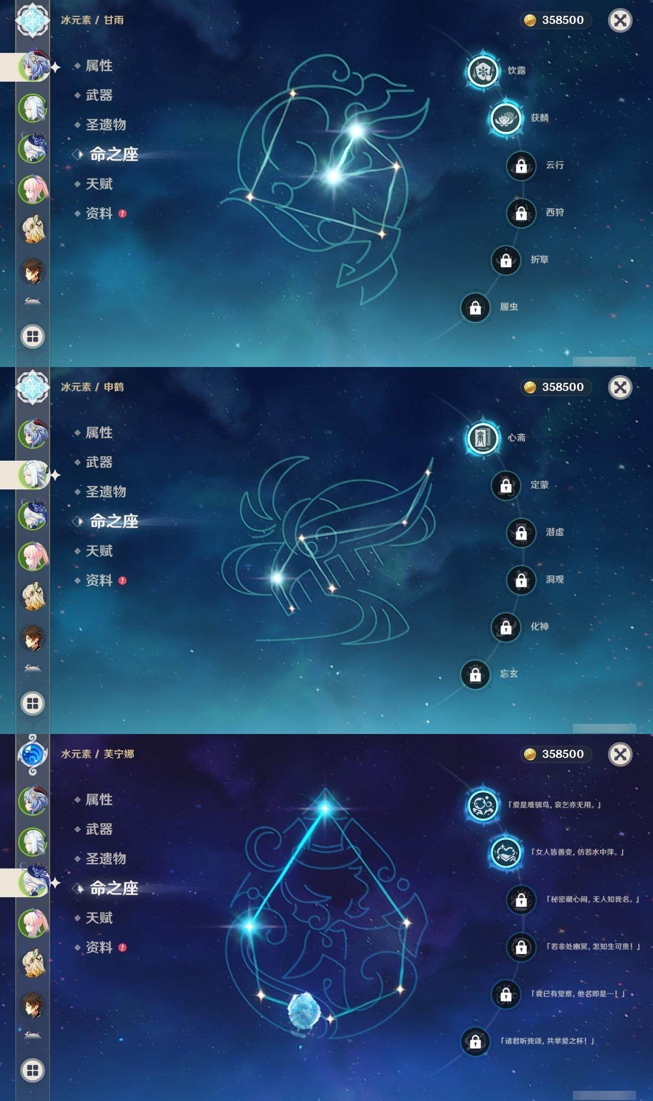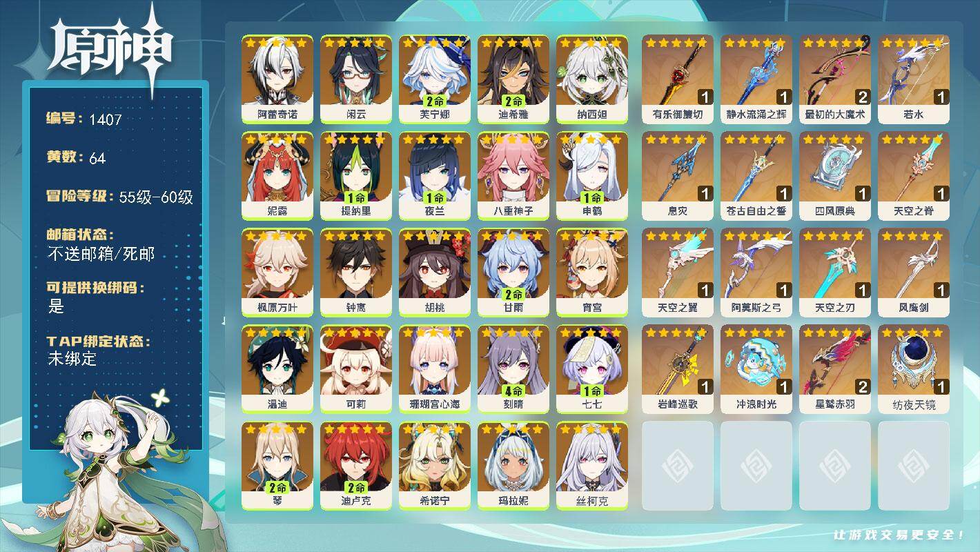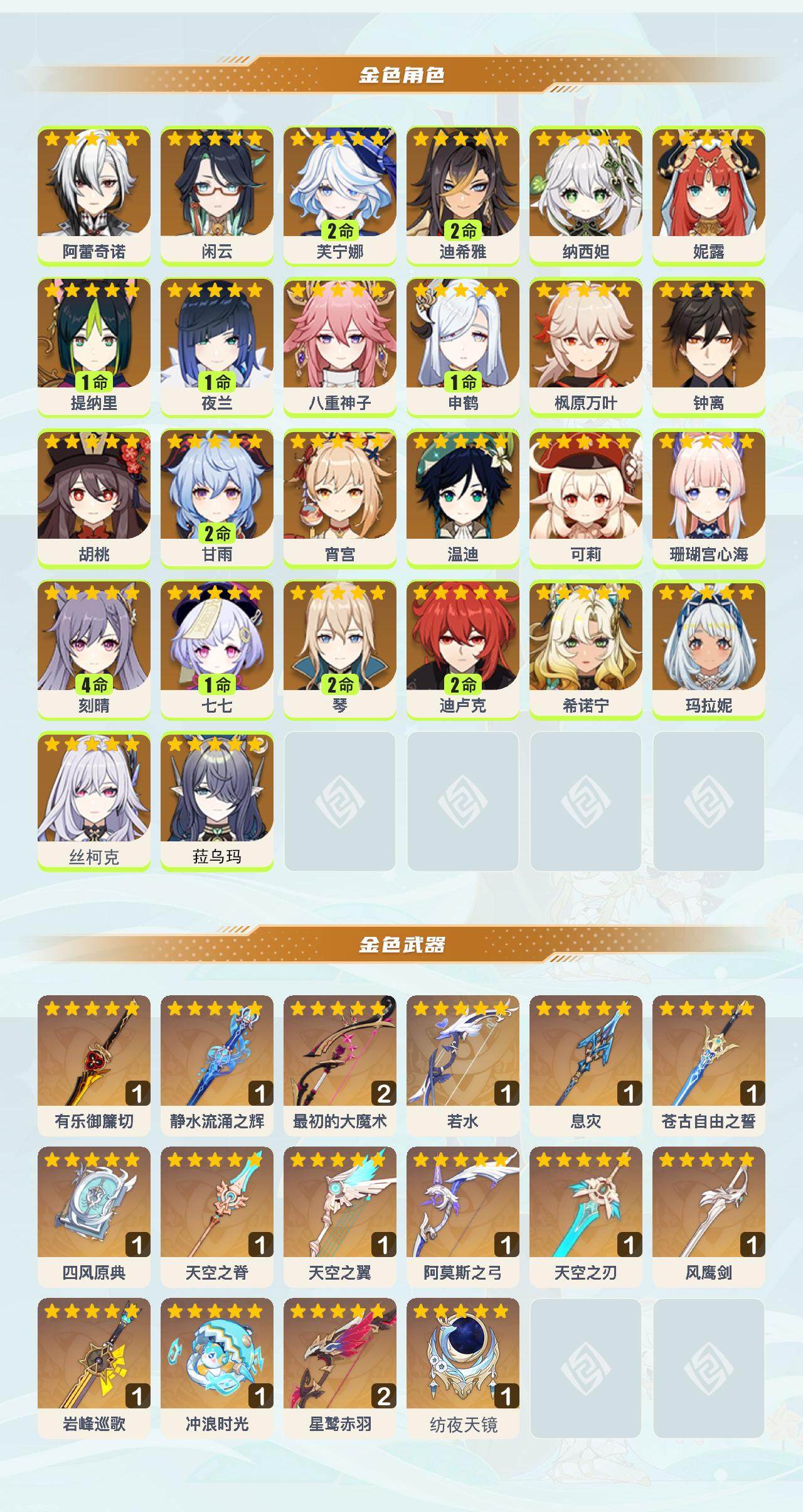 [15435549]60级/64黄/女主/26个五星角色/18个五星武器 0命阿蕾奇诺0命闲云2命芙宁娜2命迪希雅0命纳西妲0命妮露1命提纳里1命夜兰0命八重神子1命申鹤0命枫原万叶0命钟离0命胡桃2命甘雨0命宵宫0命温迪0命可莉0命珊瑚宫心海4命刻晴1命七七2命琴2命迪卢克0命希诺宁0命玛拉妮0命丝柯克0命菈乌玛精1有乐御簾切精1静水流涌之辉精2最初的大魔术精1若水精1息灾精1苍古自由之誓精1四风原典精1天空之脊精1天空之翼精1阿莫斯之弓精1天空之刃精1风鹰剑精1岩峰巡歌精1冲浪时光精2星鹫赤羽精1纺夜天镜