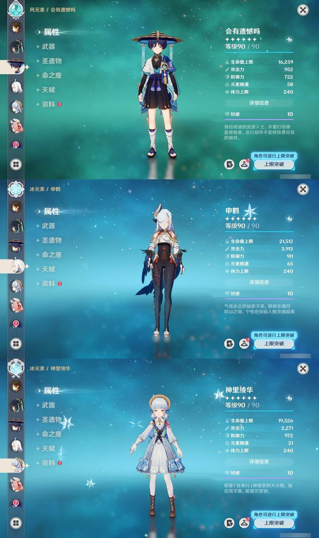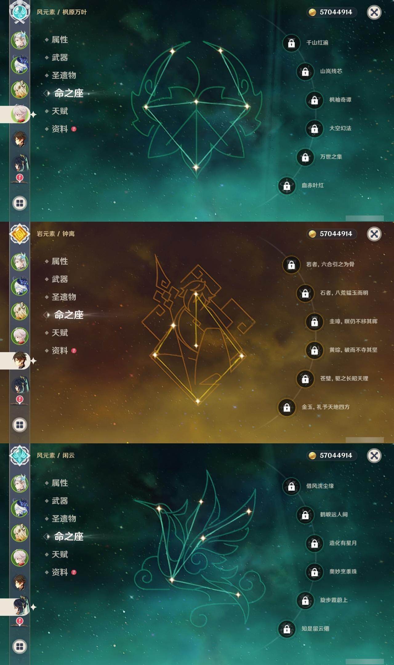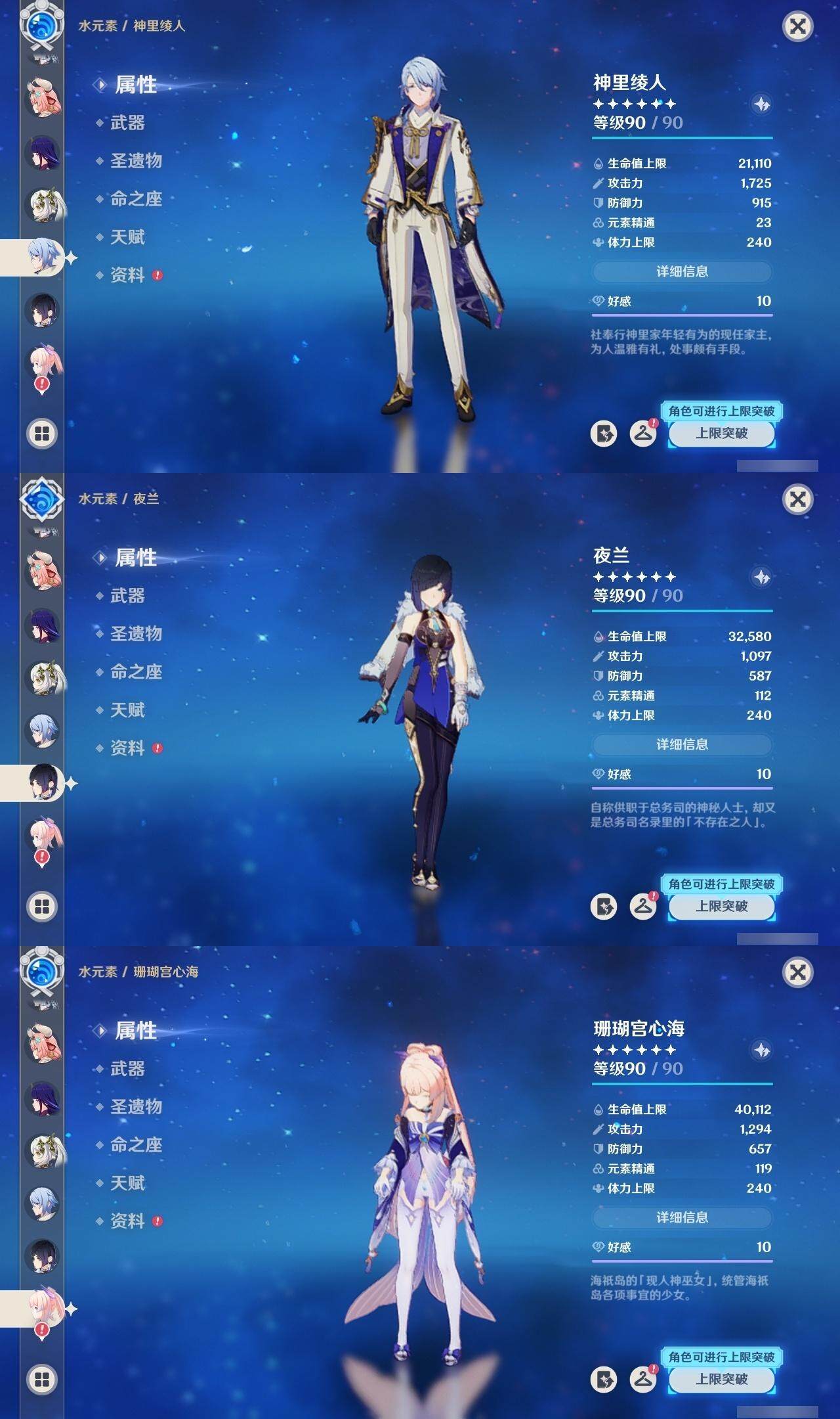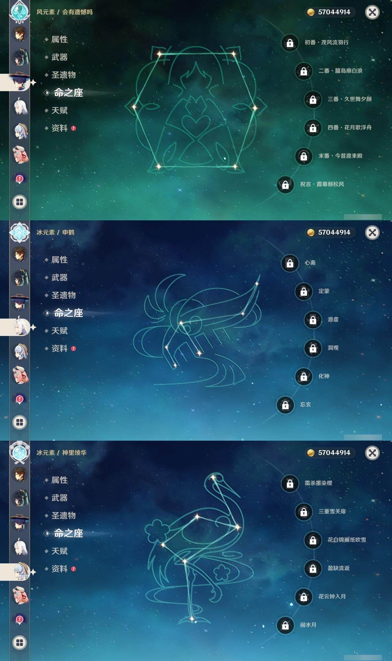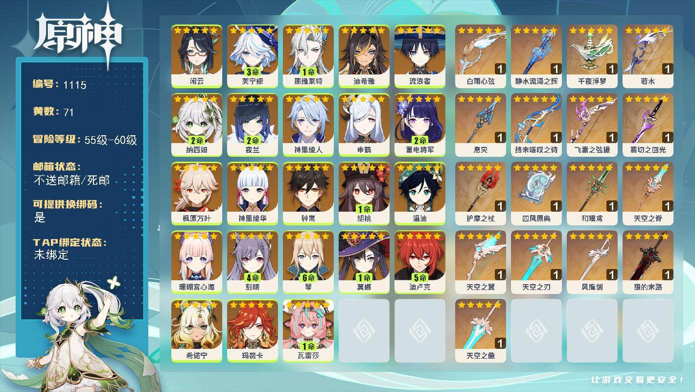 [14792876]60级/71黄/女主/23个五星角色/20个五星武器 0命闲云3命芙宁娜1命那维莱特0命迪希雅0命流浪者2命纳西妲2命夜兰0命神里绫人0命申鹤2命雷电将军0命枫原万叶0命神里绫华0命钟离1命胡桃0命温迪0命珊瑚宫心海4命刻晴满命琴1命莫娜5命迪卢克0命希诺宁0命玛薇卡1命瓦雷莎精1白雨心弦精1静水流涌之辉精1千夜浮梦精1若水精1息灾精1终末嗟叹之诗精1飞雷之弦振精1雾切之回光精1护摩之杖精1四风原典精1和璞鸢精1天空之脊精1天空之翼精1天空之刃精1风鹰剑精1狼的末路精1天空之傲