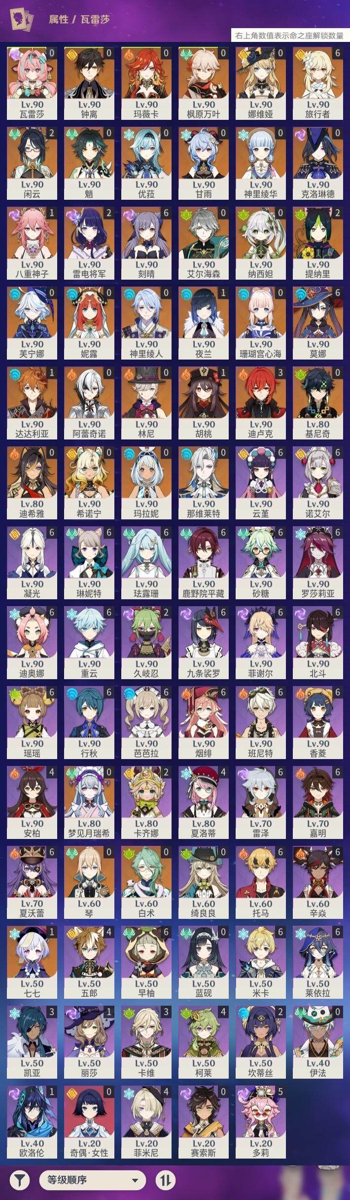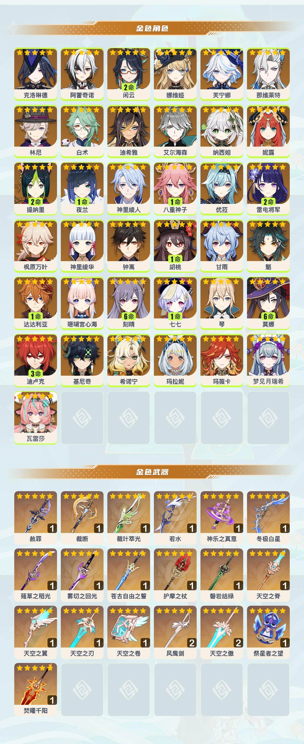 [15205527]60级/85黄/女主/37个五星角色/20个五星武器 0命克洛琳德0命阿蕾奇诺2命闲云0命娜维娅0命芙宁娜0命那维莱特0命林尼0命白术0命迪希雅0命艾尔海森0命纳西妲0命妮露2命提纳里1命夜兰0命神里绫人1命八重神子0命优菈2命雷电将军0命枫原万叶0命神里绫华0命钟离1命胡桃0命甘雨0命魈1命达达利亚0命珊瑚宫心海满命刻晴1命七七0命琴满命莫娜3命迪卢克0命基尼奇0命希诺宁0命玛拉妮0命玛薇卡0命梦见月瑞希0命瓦雷莎精1赦罪精1裁断精1裁叶萃光精1若水精1神乐之真意精1冬极白星精1薙草之稻光精1雾切之回光精1苍古自由之誓精1护摩之杖精1磐岩结绿精1天空之脊精1天空之翼精1天空之刃精1天空之卷精2风鹰剑精2天空之傲精1祭星者之望精1焚曜千阳