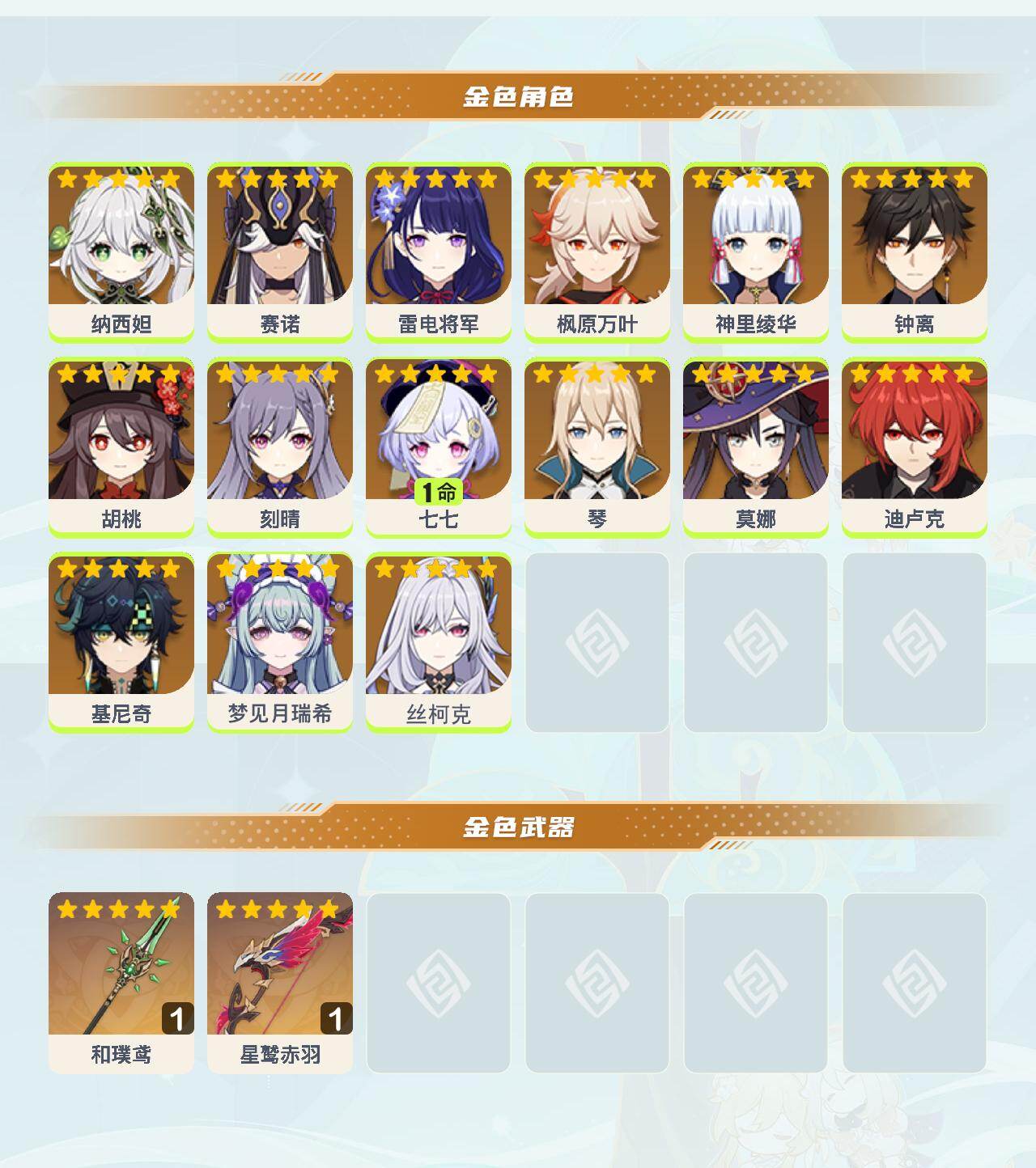 【ysn2319】56级/18黄/女主/15个五星角色/2个五星武器/0命丝柯克/0命雷电将军/0命胡桃/0命钟离/0命枫原万叶/0命神里绫华/0命莫娜/0命赛诺/0命纳西妲/0命梦见月瑞希/0命琴/1命七七/0命刻晴/0命基尼奇/0命迪卢克/精1和璞鸢/精1星鹫赤羽