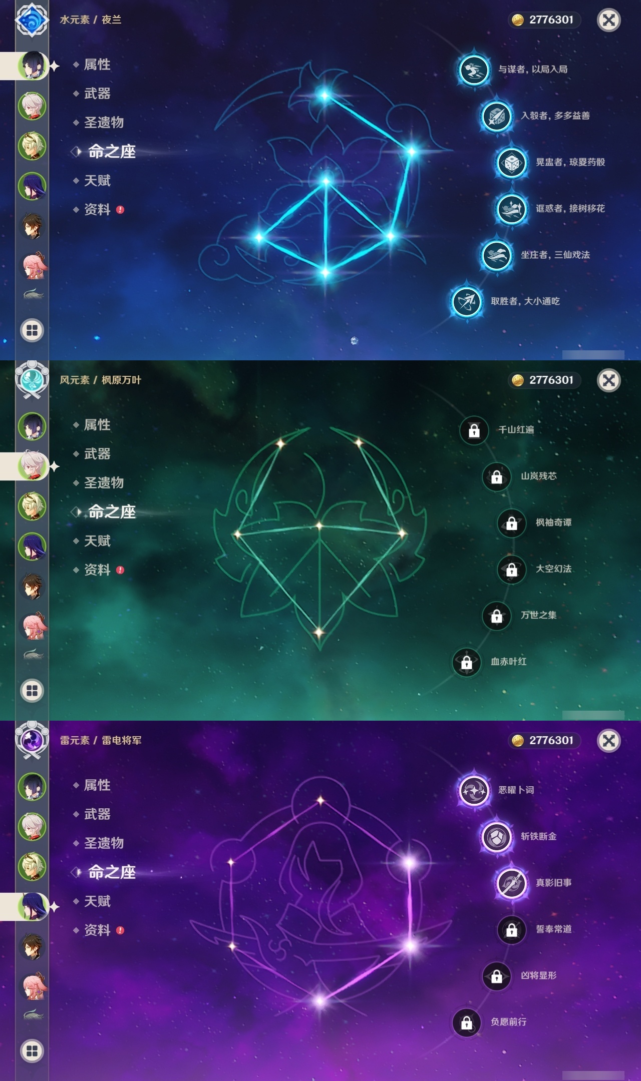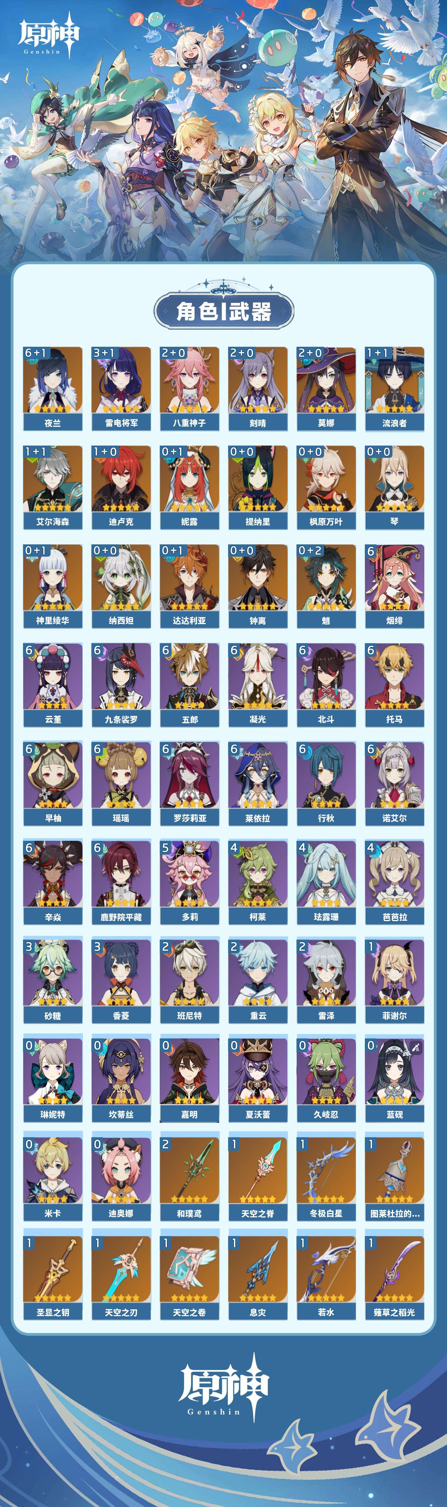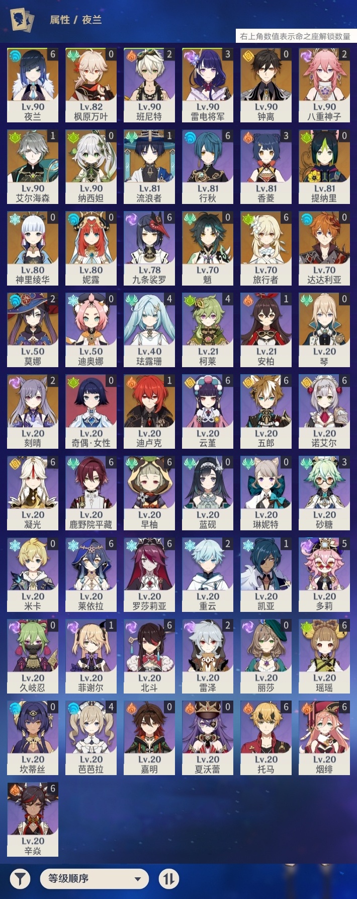 【原神】【lyys10128】冒险等级:56,五星数量:32,五星角色:夜兰 6命雷电将军 3命刻晴 2命莫娜 2命八重神子 2命迪卢克 1命艾尔海森 1命流浪者 1命琴神里绫华钟离达达利亚提纳里妮露纳西妲枫原万叶魈__五星武器:和璞鸢 2精裁叶萃光图莱杜拉的回忆阿莫斯之弓天空之脊天空之卷天空之刃雾切之回光薙草之稻光赤角石溃杵冬极白星息灾若水圣显之钥__四星角色:行秋 6命九条裟罗 6命鹿野院平藏 6命凝光 6命瑶瑶 6命莱依拉 6命云堇 6命早柚 6命托马 6命五郎 6命烟绯 6命辛焱 6命诺艾尔 6命罗莎莉亚 6命北斗 6命多莉 5命珐露珊 4命柯莱 4命芭芭拉 4命香菱 3命砂糖 3命班尼特 2命重云 2命雷泽 2命菲谢尔 1命奇偶·女性久岐忍迪奥娜米卡坎蒂丝蓝砚琳妮特夏沃蕾嘉明