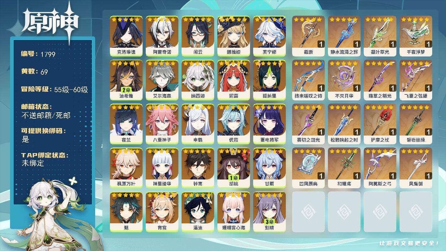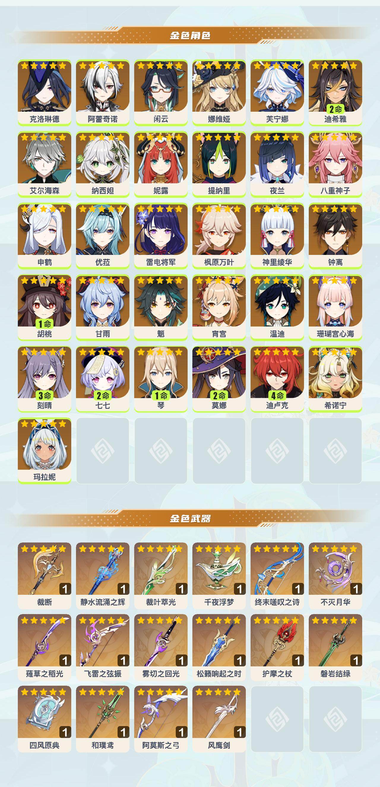 [16357545]60级/69黄/女主/31个五星角色/23个五星武器 0命克洛琳德0命阿蕾奇诺0命闲云0命娜维娅0命芙宁娜2命迪希雅0命艾尔海森0命纳西妲0命妮露0命提纳里0命夜兰0命八重神子0命申鹤0命优菈0命雷电将军0命枫原万叶0命神里绫华0命钟离1命胡桃0命甘雨0命魈0命宵宫0命温迪0命珊瑚宫心海3命刻晴2命七七1命琴2命莫娜4命迪卢克0命希诺宁0命玛拉妮精1裁断精1静水流涌之辉精1裁叶萃光精1千夜浮梦精1终末嗟叹之诗精1不灭月华精1薙草之稻光精1飞雷之弦振精1雾切之回光精1松籁响起之时精1护摩之杖精1磐岩结绿精1四风原典精1和璞鸢精1阿莫斯之弓精1风鹰剑