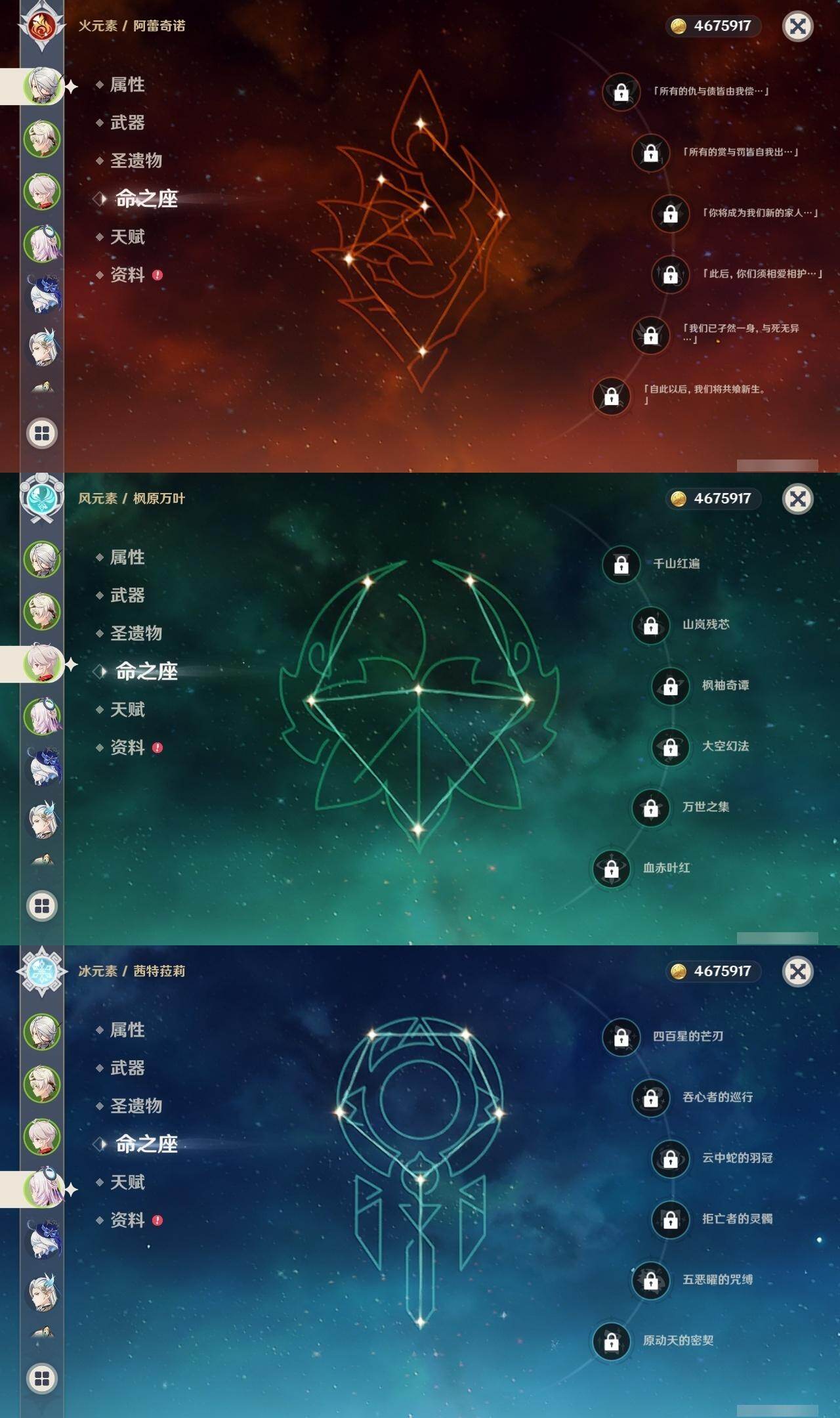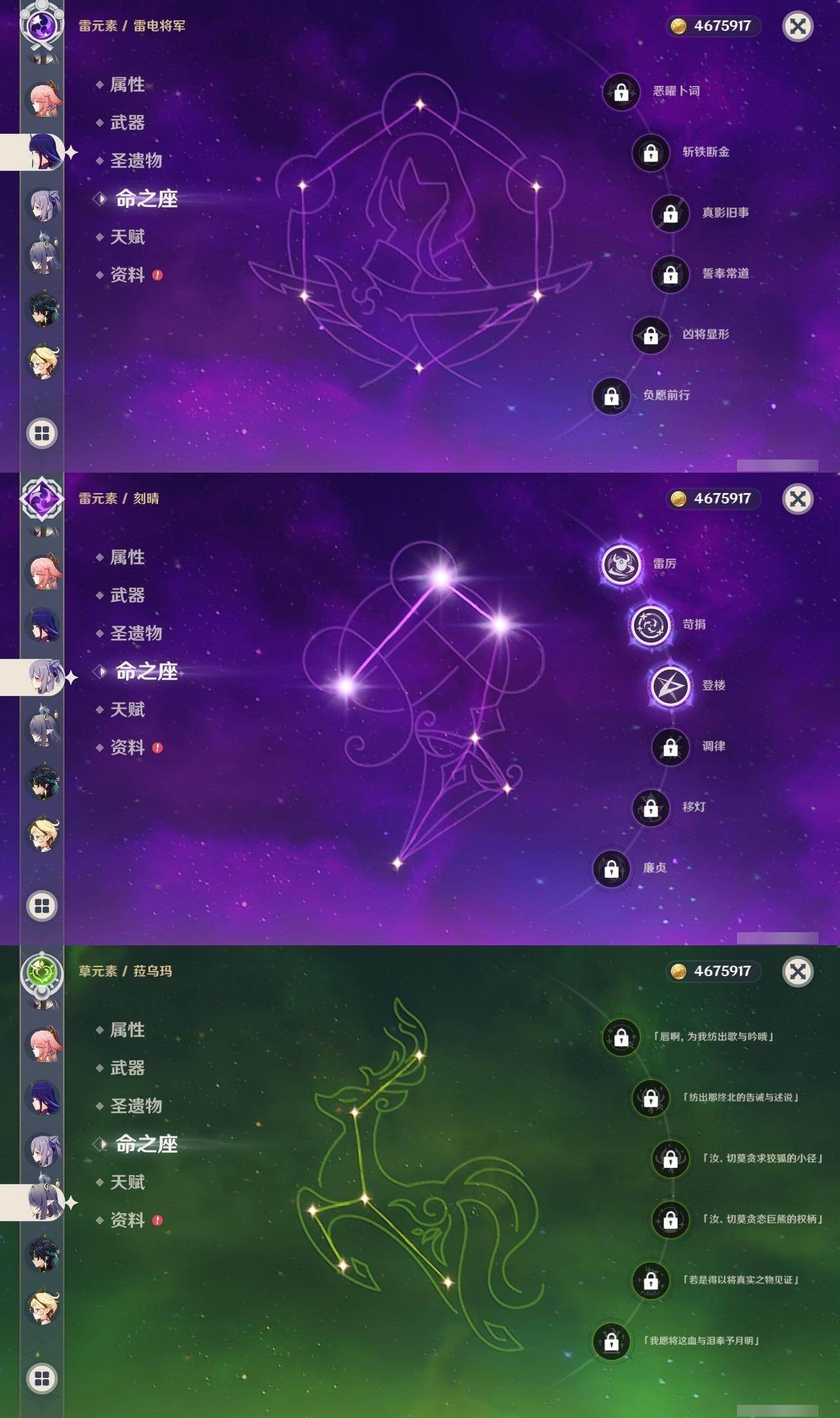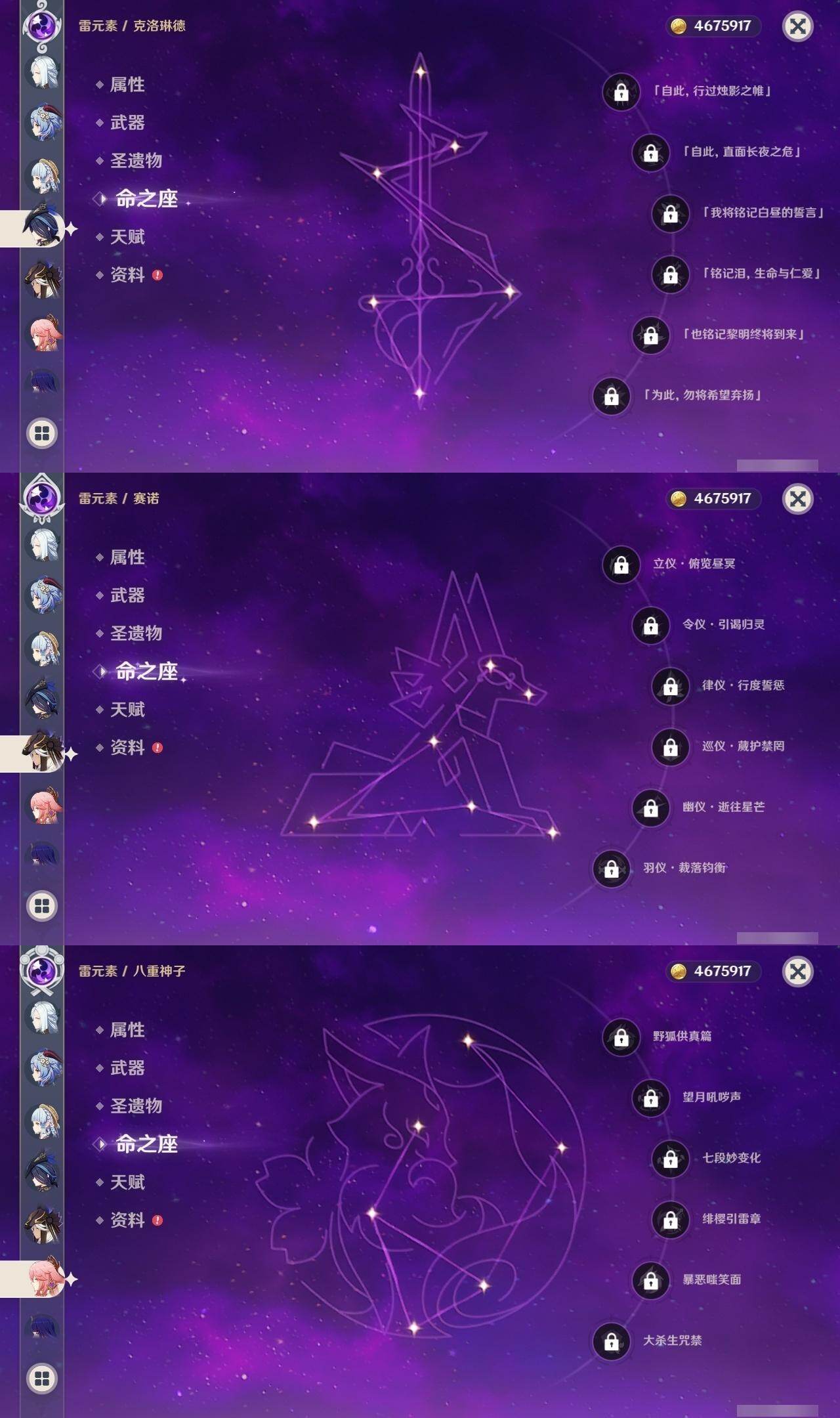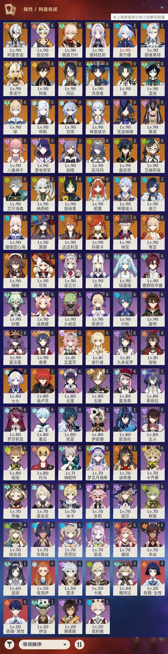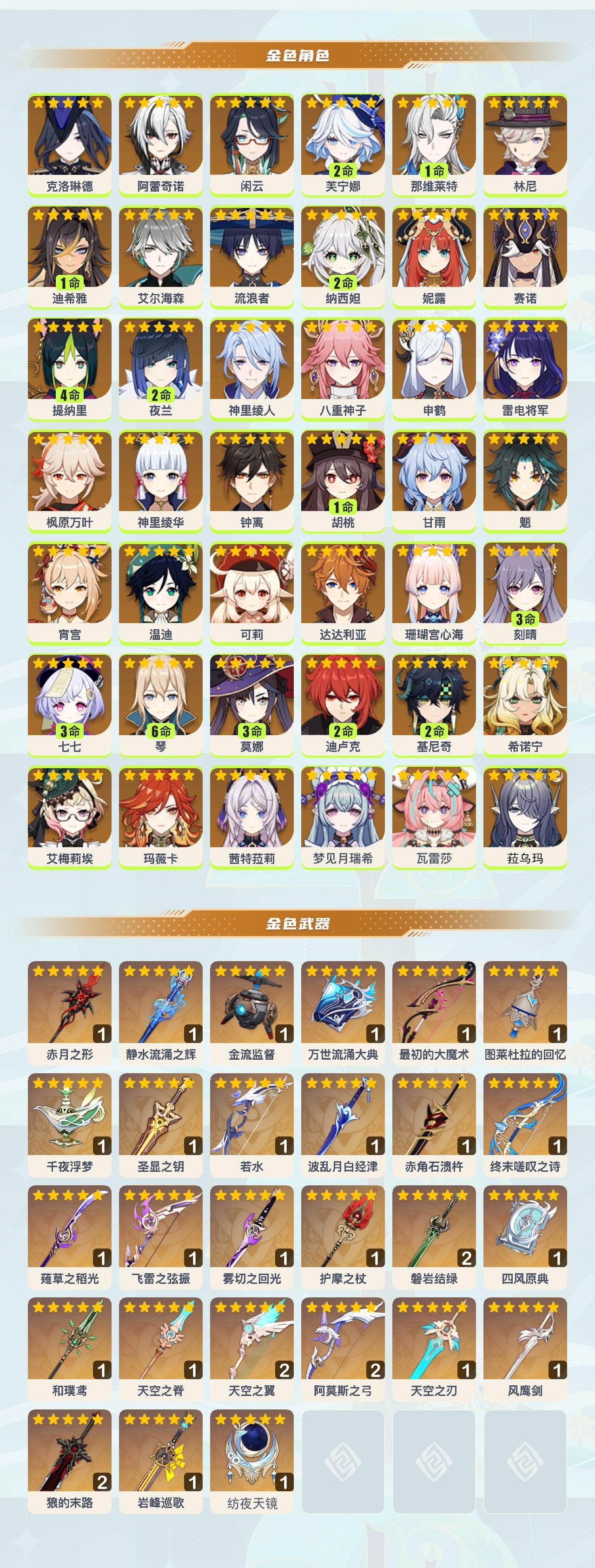 [16357937]60级/111黄/女主/42个五星角色/33个五星武器 0命克洛琳德0命阿蕾奇诺0命闲云2命芙宁娜1命那维莱特0命林尼1命迪希雅0命艾尔海森0命流浪者2命纳西妲0命妮露0命赛诺4命提纳里2命夜兰0命神里绫人0命八重神子0命申鹤0命雷电将军0命枫原万叶0命神里绫华0命钟离1命胡桃0命甘雨0命魈0命宵宫0命温迪0命可莉0命达达利亚0命珊瑚宫心海3命刻晴3命七七满命琴3命莫娜2命迪卢克2命基尼奇0命希诺宁0命艾梅莉埃0命玛薇卡0命茜特菈莉0命梦见月瑞希0命瓦雷莎0命菈乌玛精1赤月之形精1静水流涌之辉精1金流监督精1万世流涌大典精1最初的大魔术精1图莱杜拉的回忆精1千夜浮梦精1圣显之钥精1若水精1波乱月白经津精1赤角石溃杵精1终末嗟叹之诗精1薙草之稻光精1飞雷之弦振精1雾切之回光精1护摩之杖精2磐岩结绿精1四风原典精1和璞鸢精1天空之脊精2天空之翼精2阿莫斯之弓精1天空之刃精1风鹰剑精2狼的末路精1岩峰巡歌精1纺夜天镜