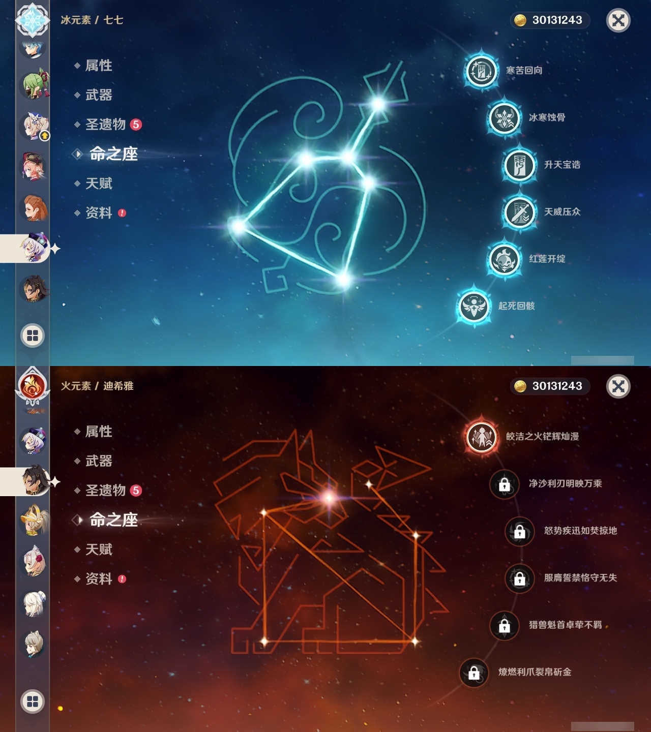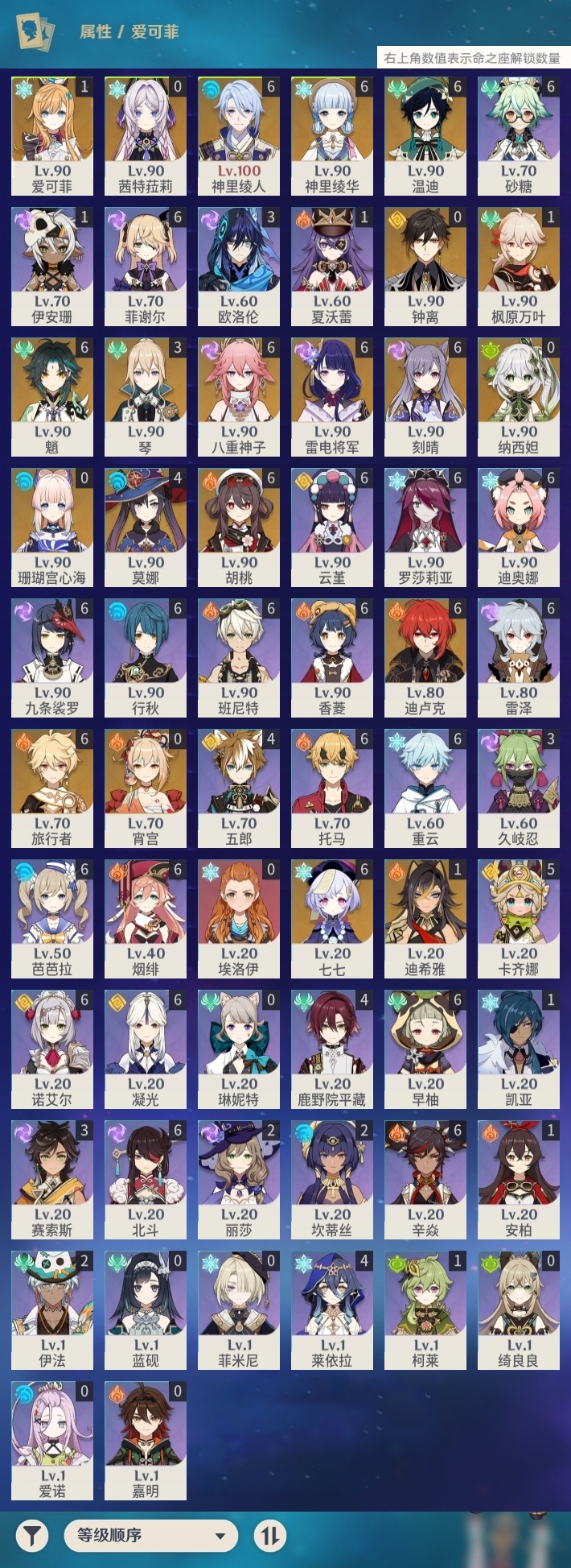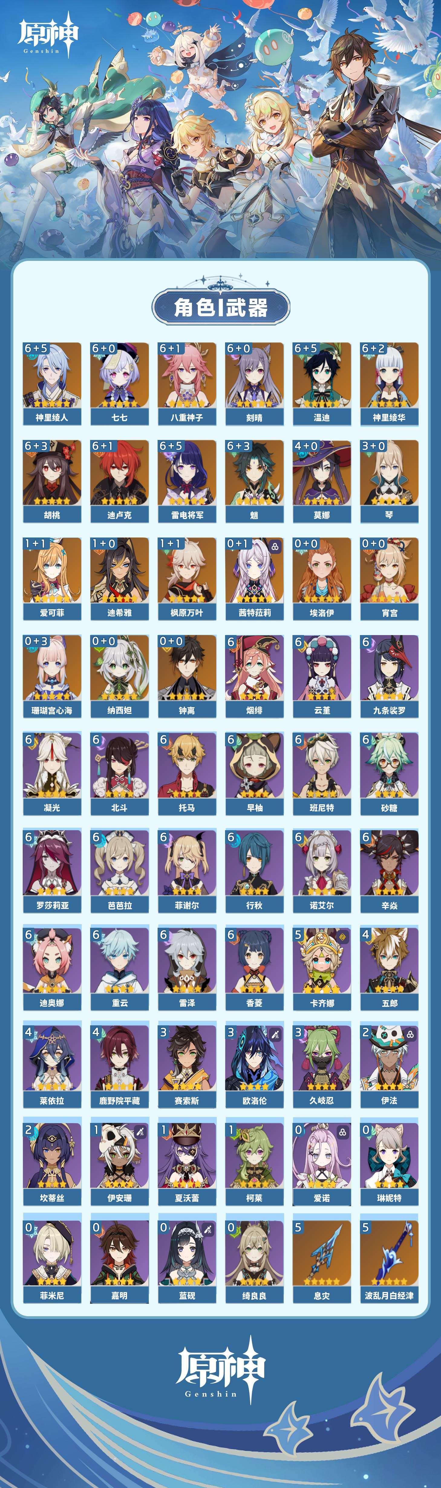 【原神】0满命,冒险等级:60,五星数量:40,五星角色:迪卢克 6命魈 6命胡桃 6命刻晴 6命雷电将军 6命七七 6命神里绫华 6命温迪 6命八重神子 6命神里绫人 6命莫娜 4命琴 3命迪希雅 1命爱可菲 1命枫原万叶 1命珊瑚宫心海茜特菈莉宵宫钟离纳西妲__五星武器:薙草之稻光 5精终末嗟叹之诗 5精息灾 5精波乱月白经津 5精不灭月华 3精和璞鸢 3精护摩之杖 3精天空之傲 3精雾切之回光 2精祭星者之望香韵奏者阿莫斯之弓苍古自由之誓风鹰剑狼的末路天空之脊天空之刃斫峰之刃神乐之真意__四星角色:班尼特 6命行秋 6命九条裟罗 6命香菱 6命凝光 6命迪奥娜 6命砂糖 6命芭芭拉 6命云堇 6命早柚 6命托马 6命烟绯 6命重云 6命辛焱 6命诺艾尔 6命罗莎莉亚 6命雷泽 6命菲谢尔 6命北斗 6命卡齐娜 5命鹿野院平藏 4命莱依拉 4命五郎 4命久岐忍 3命欧洛伦 3命赛索斯 3命坎蒂丝 2命伊法 2命柯莱 1命夏沃蕾 1命伊安珊 1命埃洛伊绮良良蓝砚菲米尼琳妮特嘉明爱诺102抽