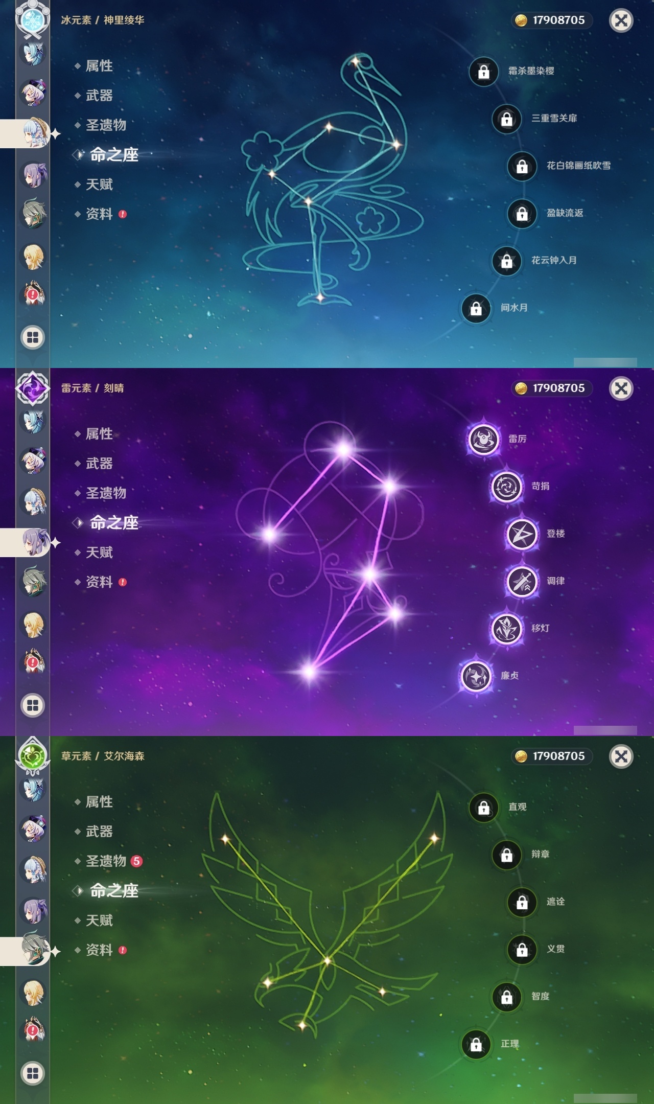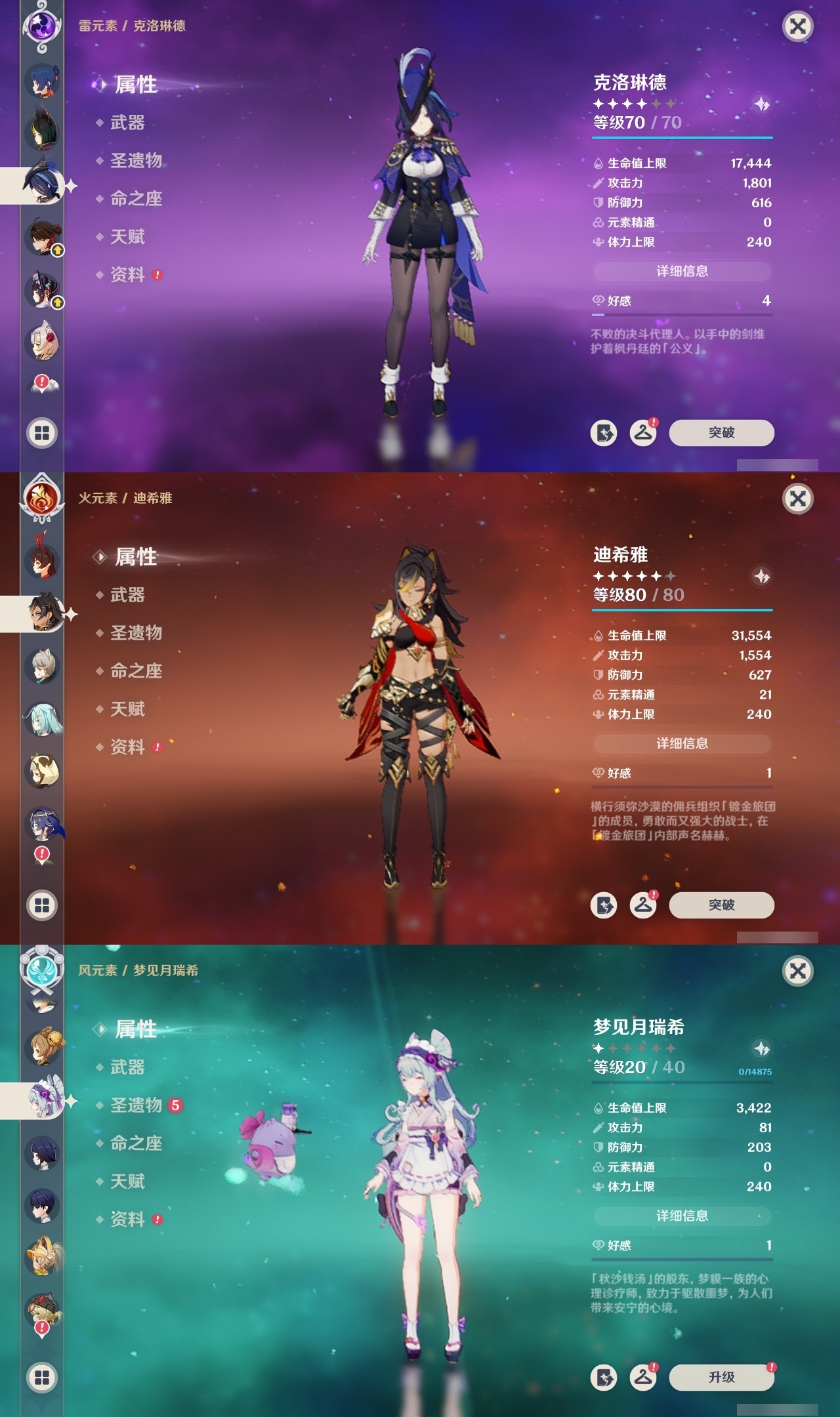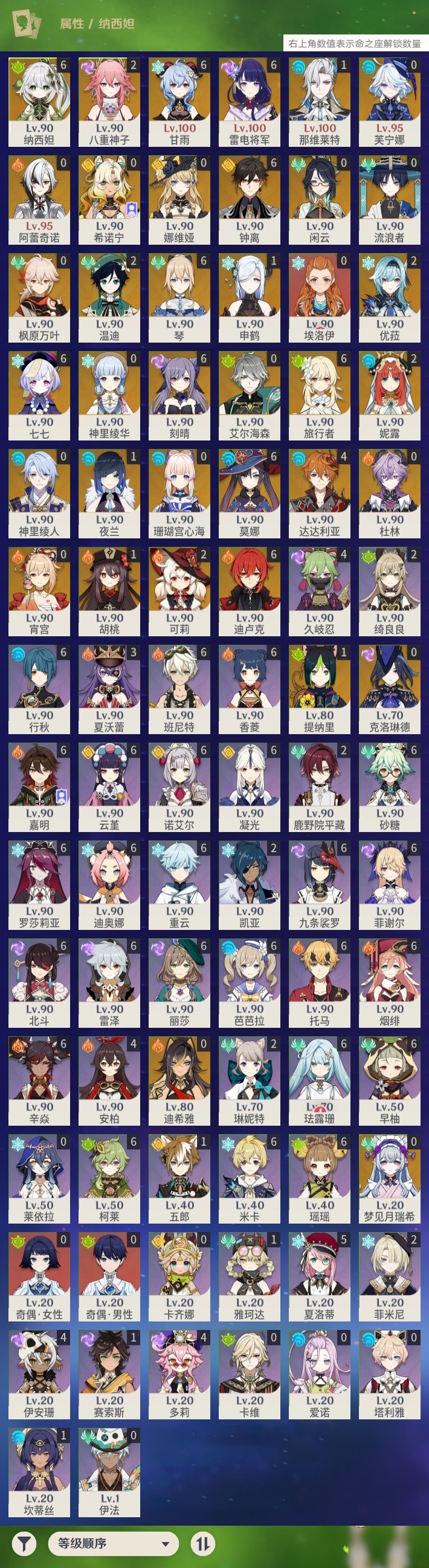 【原神】满命,冒险等级:60,五星数量:70,五星角色:迪卢克 6命甘雨 6命刻晴 6命雷电将军 6命莫娜 6命七七 6命琴 6命钟离 6命纳西妲 6命达达利亚 4命可莉 2命温迪 2命优菈 2命八重神子 2命妮露 2命那维莱特 1命胡桃 1命申鹤 1命夜兰 1命提纳里 1命珊瑚宫心海希诺宁神里绫华宵宫迪希雅梦见月瑞希神里绫人芙宁娜娜维娅闲云阿蕾奇诺艾尔海森流浪者杜林枫原万叶克洛琳德__五星武器:风鹰剑 5精天空之翼 5精薙草之稻光 5精天空之脊 4精阿莫斯之弓 3精和璞鸢 3精狼的末路 3精磐岩结绿 3精天空之傲 3精无工之剑 3精万世流涌大典黎明破晓之史裁叶萃光苍古自由之誓尘世之锁飞雷之弦振护摩之杖四风原典松籁响起之时天空之卷天空之刃雾切之回光终末嗟叹之诗赤角石溃杵冬极白星息灾神乐之真意贯虹之槊波乱月白经津千夜浮梦白雨心弦__四星角色:班尼特 6命行秋 6命九条裟罗 6命香菱 6命珐露珊 6命凝光 6命迪奥娜 6命砂糖 6命瑶瑶 6命米卡 6命柯莱 6命芭芭拉 6命云堇 6命早柚 6命托马 6命烟绯 6命重云 6命辛焱 6命诺艾尔 6命罗莎莉亚 6命雷泽 6命菲谢尔 6命北斗 6命嘉明 6命夏洛蒂 5命久岐忍 4命多莉 4命伊安珊 4命夏沃蕾 3命鹿野院平藏 2命绮良良 2命菲米尼 2命琳妮特 2命坎蒂丝 1命五郎 1命赛索斯 1命埃洛伊奇偶·女性奇偶·男性卡齐娜莱依拉卡维伊法塔利雅爱诺