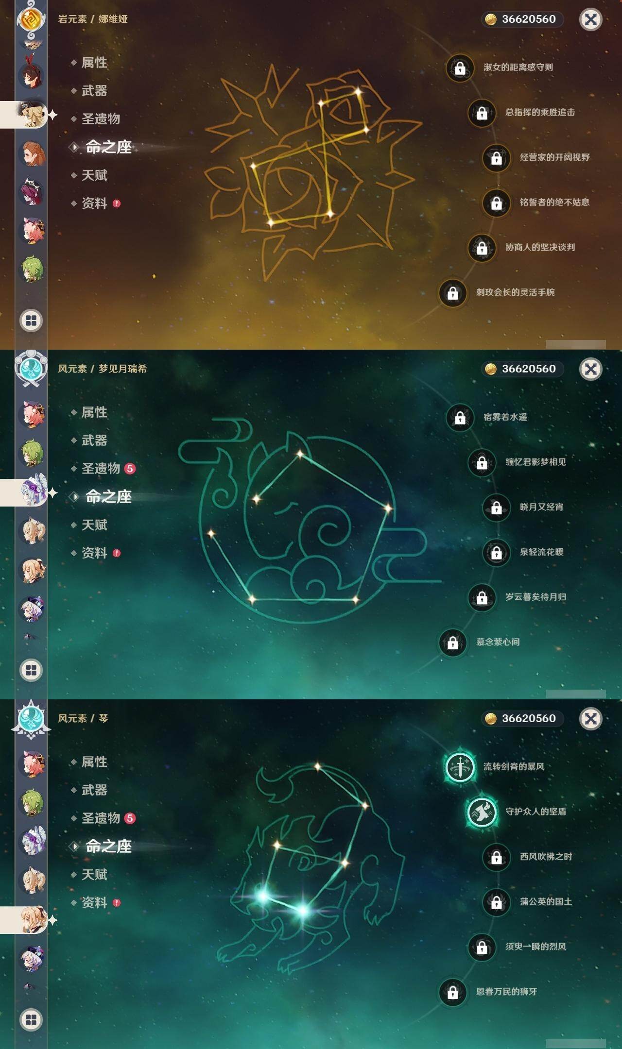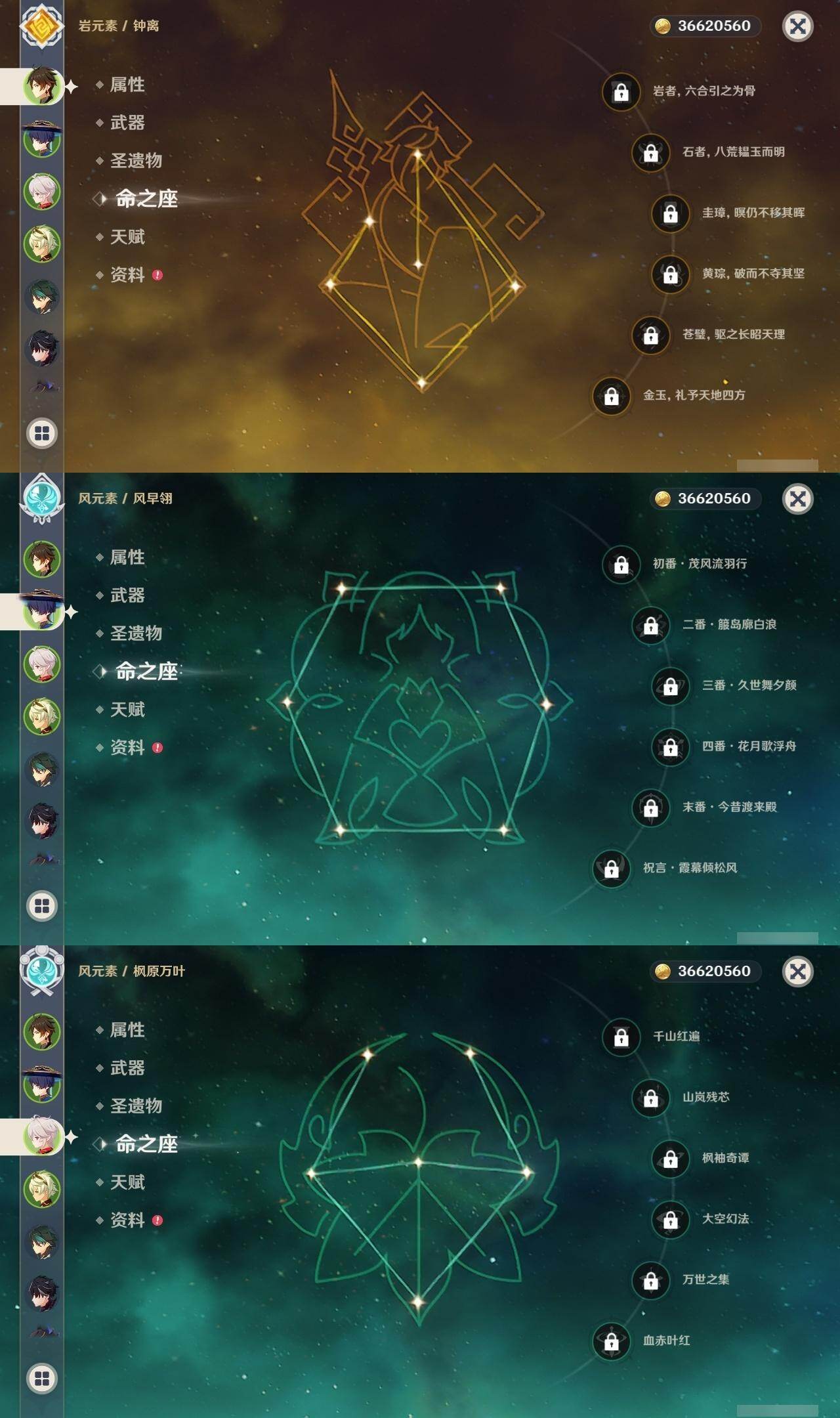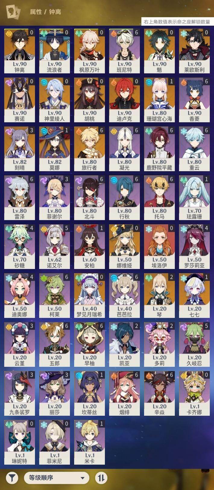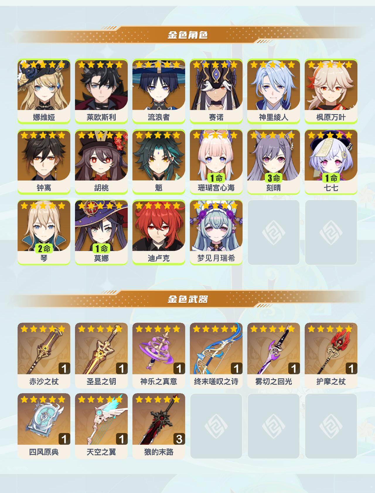 60级/35黄/男主/16个五星角色/9个五星武器 0命娜维娅0命莱欧斯利0命流浪者0命赛诺0命神里绫人0命枫原万叶0命钟离0命胡桃0命魈1命珊瑚宫心海3命刻晴1命七七2命琴1命莫娜0命迪卢克0命梦见月瑞希精1赤沙之杖精1圣显之钥精1神乐之真意精1终末嗟叹之诗精1雾切之回光精1护摩之杖精1四风原典精1天空之翼精3狼的末路