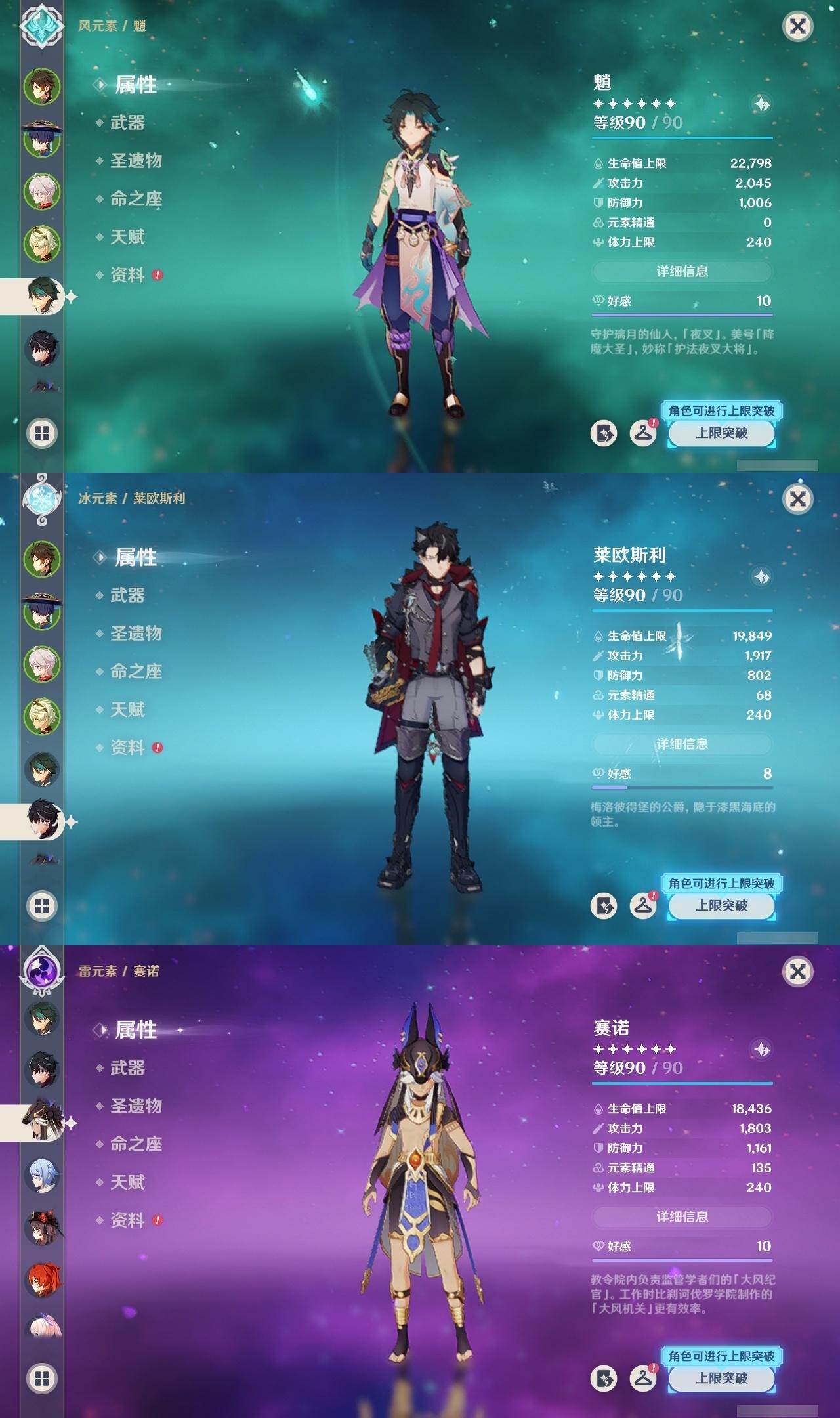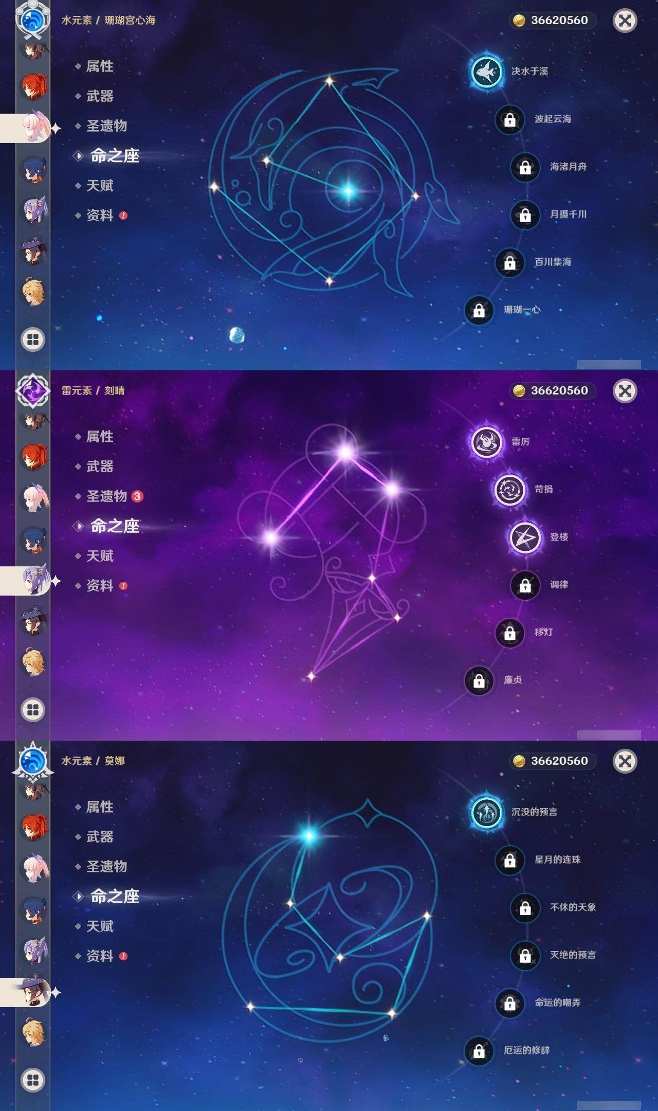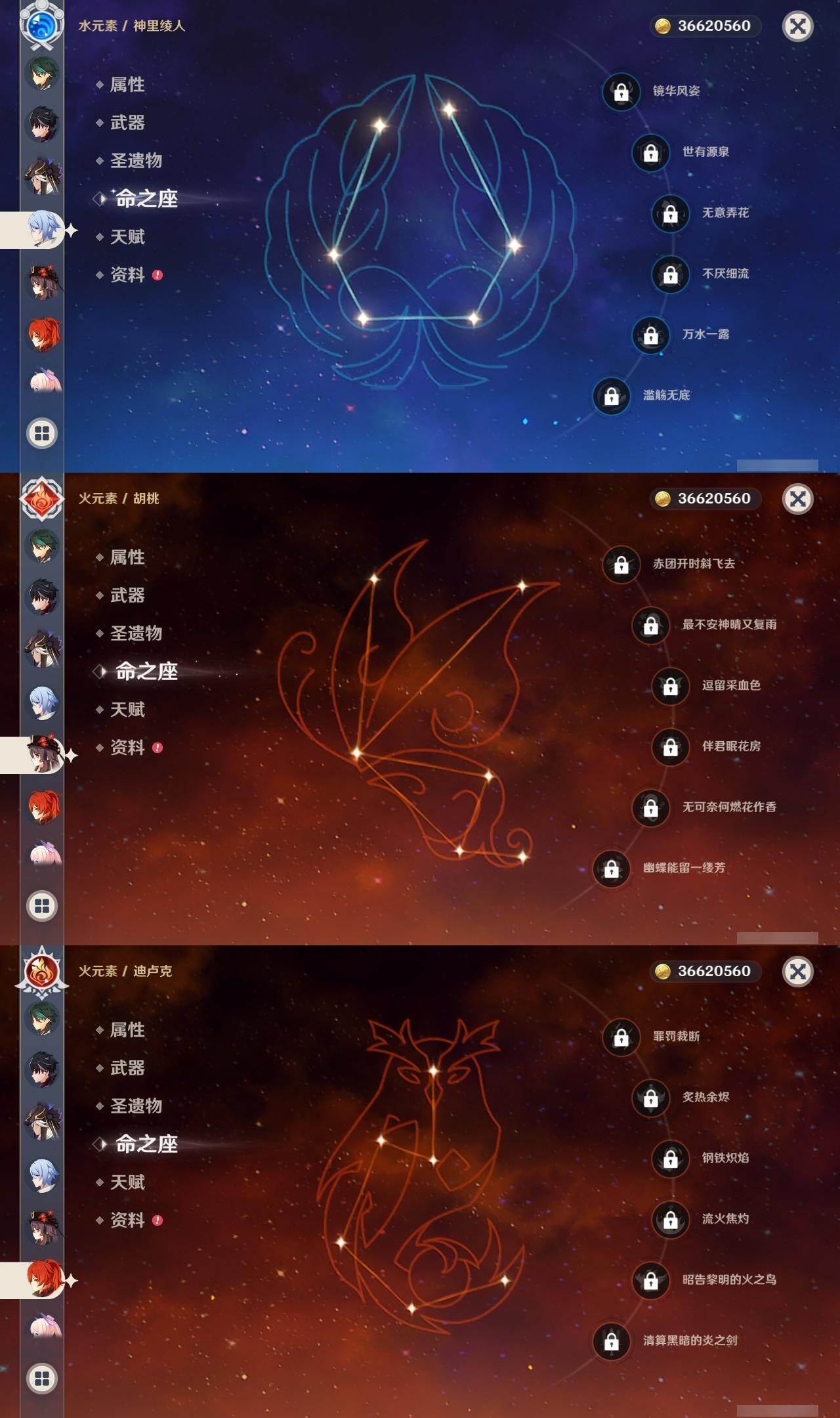 60级/35黄/男主/16个五星角色/9个五星武器 0命娜维娅0命莱欧斯利0命流浪者0命赛诺0命神里绫人0命枫原万叶0命钟离0命胡桃0命魈1命珊瑚宫心海3命刻晴1命七七2命琴1命莫娜0命迪卢克0命梦见月瑞希精1赤沙之杖精1圣显之钥精1神乐之真意精1终末嗟叹之诗精1雾切之回光精1护摩之杖精1四风原典精1天空之翼精3狼的末路