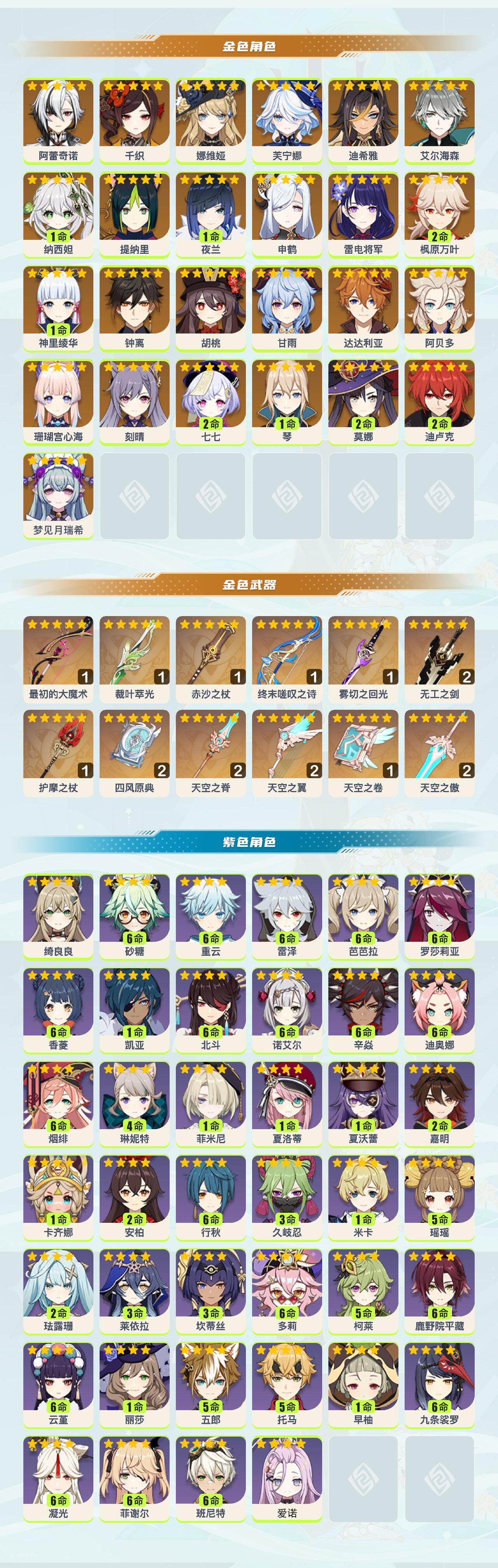 【金色角色】:梦见月瑞希0命,阿蕾奇诺0命,千织0命,娜维娅0命,芙宁娜0命,迪希雅0命,艾尔海森0命,纳西妲1命,提纳里0命,夜兰1命,申鹤0命,珊瑚宫心海0命,雷电将军0命,神里绫华1命,枫原万叶2命,胡桃0命,甘雨0命,阿贝多0命,钟离0命,达达利亚0命,琴1命,刻晴0命,迪卢克2命,莫娜2命,七七2命 【拥有武器】:最初的大魔术精1,裁叶萃光精1,赤沙之杖精1,雾切之回光精1,终末嗟叹之诗精1,护摩之杖精1,无工之剑精2,天空之傲精2,天空之卷精1,四风原典精2,天空之脊精2,天空之翼精2 【紫色角色】:爱诺0命,卡齐娜0命,嘉明2命,夏沃蕾1命,夏洛蒂0命,菲米尼1命,琳妮特4命,绮良良0命,米卡0命,瑶瑶5命,珐露珊2命,莱依拉3命,坎蒂丝3命,多莉满命,柯莱5命,鹿野院平藏满命,久岐忍3命,云堇满命,五郎5命,托马5命,九条裟罗满命,早柚1命,烟绯满命,罗莎莉亚满命,辛焱满命,迪奥娜满命,砂糖满命,雷泽满命,菲谢尔满命,丽莎1命,北斗满命,香菱满命,安柏2命,班尼特满命,行秋满命,芭芭拉满命,凝光满命,诺艾尔满命,凯亚1命,重云满命
