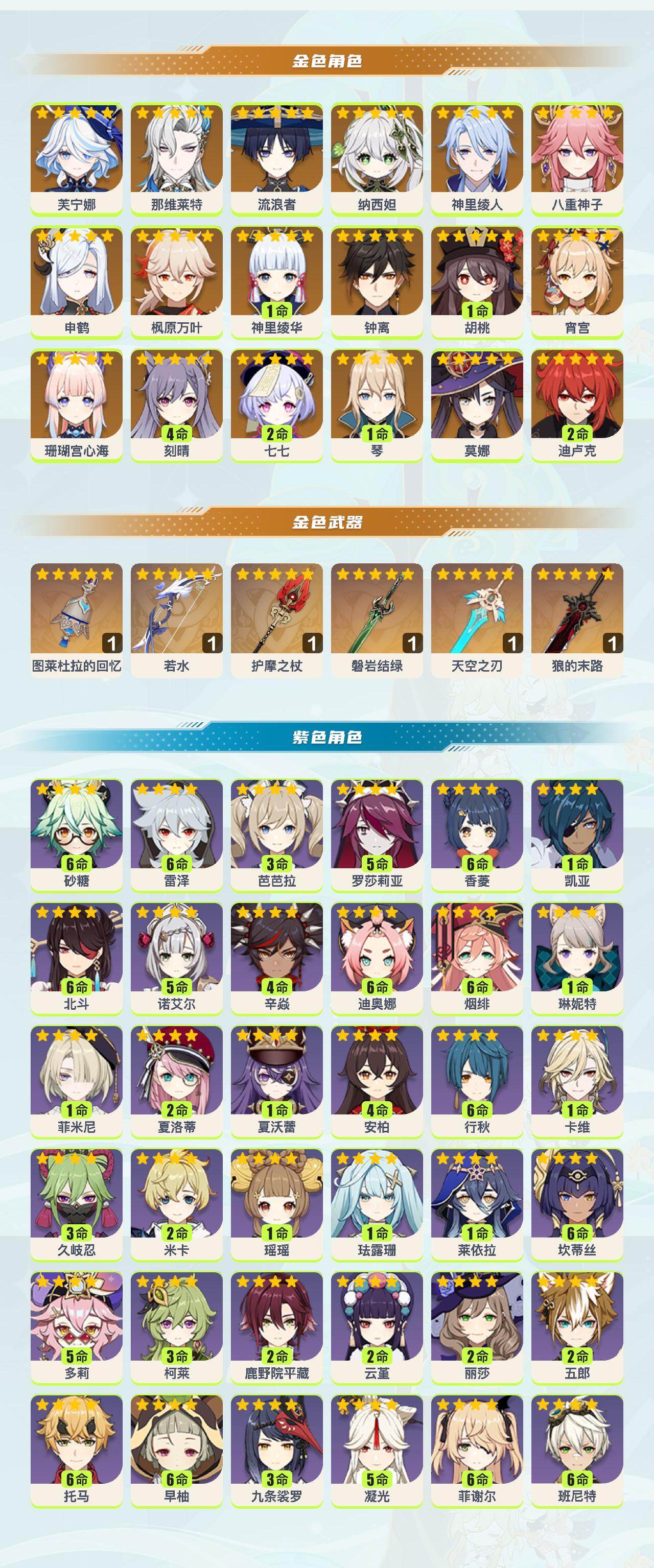 【金色角色】:芙宁娜0命,那维莱特0命,流浪者0命,纳西妲0命,神里绫人0命,八重神子0命,申鹤0命,珊瑚宫心海0命,宵宫0命,神里绫华1命,枫原万叶0命,胡桃1命,钟离0命,琴1命,刻晴4命,迪卢克2命,莫娜0命,七七2命 【拥有武器】:图莱杜拉的回忆精1,若水精1,护摩之杖精1,磐岩结绿精1,狼的末路精1,天空之刃精1 【紫色角色】:夏沃蕾1命,夏洛蒂2命,菲米尼0命,琳妮特1命,卡维1命,米卡2命,瑶瑶1命,珐露珊1命,莱依拉0命,坎蒂丝满命,多莉5命,柯莱3命,鹿野院平藏2命,久岐忍3命,云堇2命,五郎2命,托马满命,九条裟罗3命,早柚满命,烟绯满命,罗莎莉亚5命,辛焱4命,迪奥娜满命,砂糖满命,雷泽满命,菲谢尔满命,丽莎2命,北斗满命,香菱满命,安柏4命,班尼特满命,行秋满命,芭芭拉3命,凝光5命,诺艾尔5命,凯亚0命