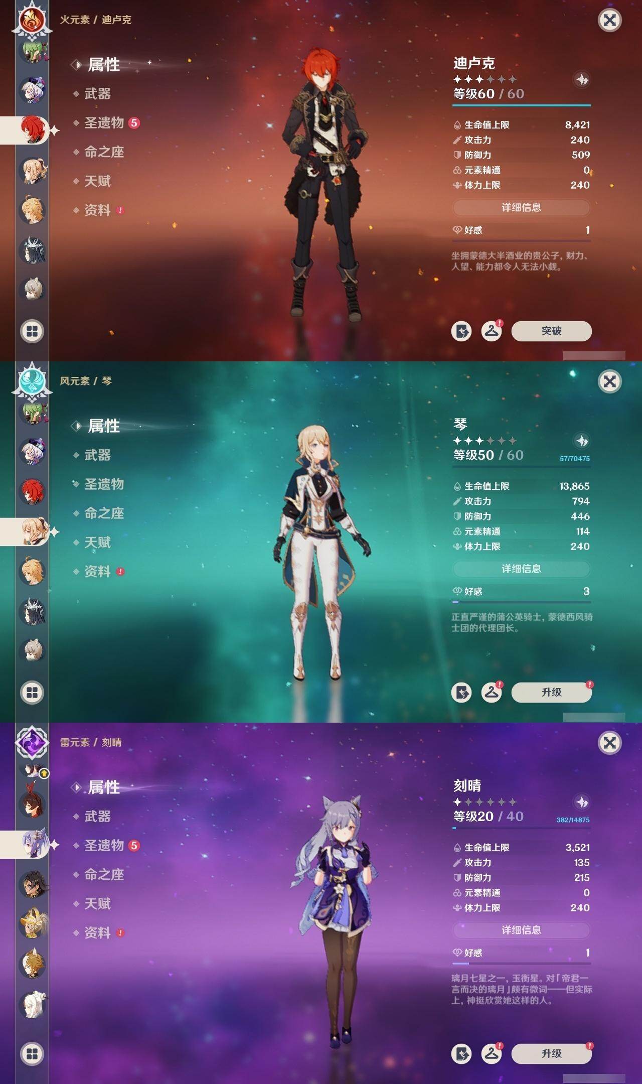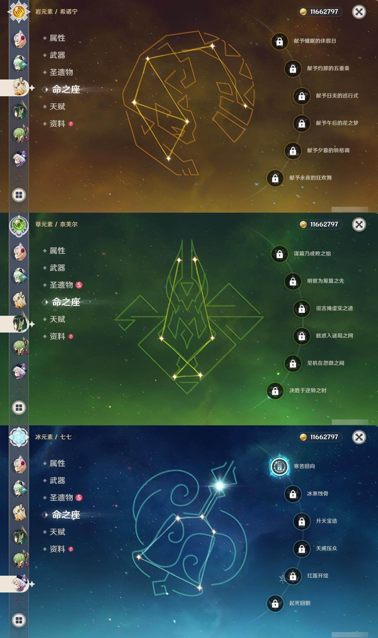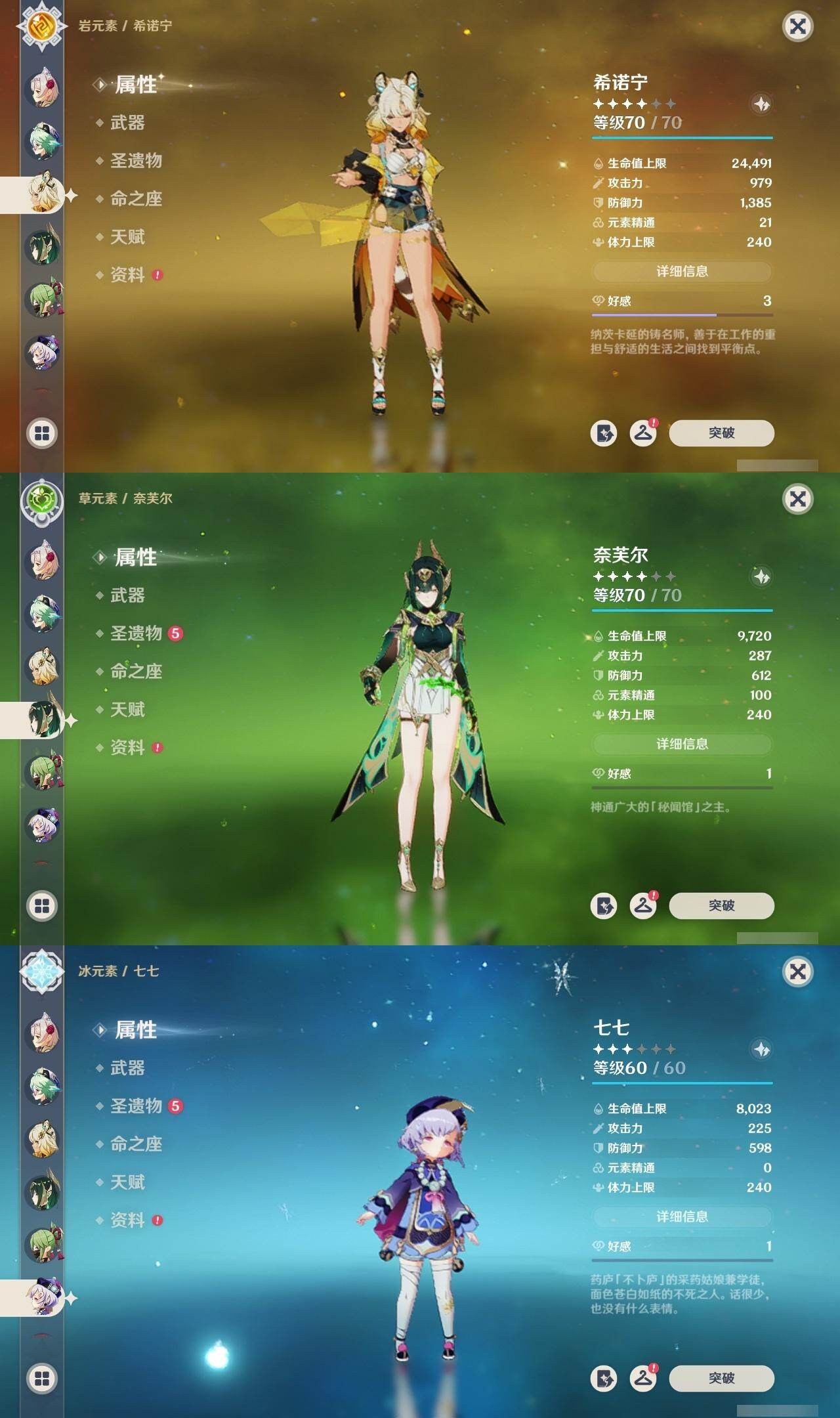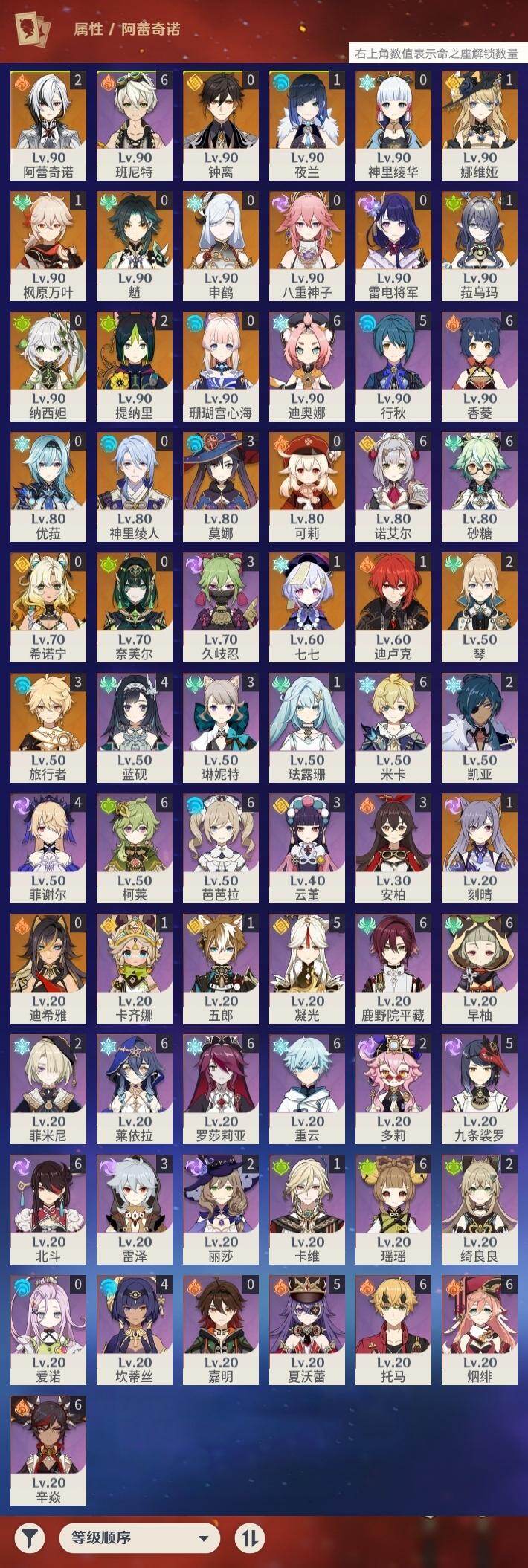 60级/51黄/男主/25个五星角色/10个五星武器 2命阿蕾奇诺1命娜维娅0命迪希雅0命纳西妲2命提纳里1命夜兰0命神里绫人0命八重神子0命申鹤0命优菈0命雷电将军1命枫原万叶0命神里绫华0命钟离0命魈0命可莉0命珊瑚宫心海1命刻晴1命七七2命琴3命莫娜1命迪卢克0命希诺宁1命菈乌玛0命奈芙尔精1有乐御簾切精1波乱月白经津精1神乐之真意精1雾切之回光精1护摩之杖精1天空之脊精1天空之翼精1阿莫斯之弓精1风鹰剑精1狼的末路