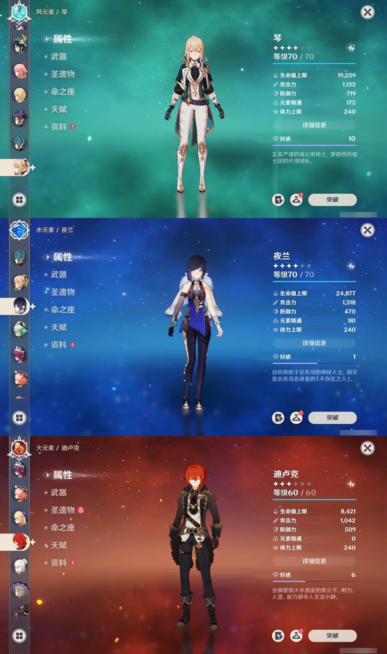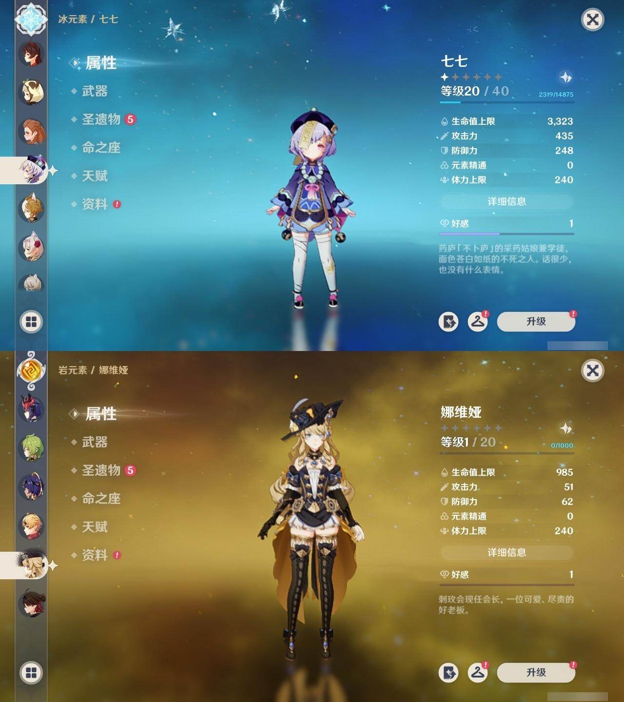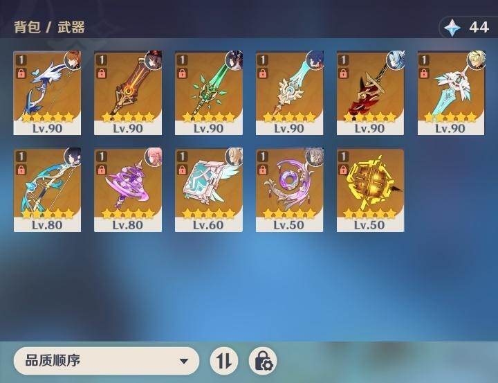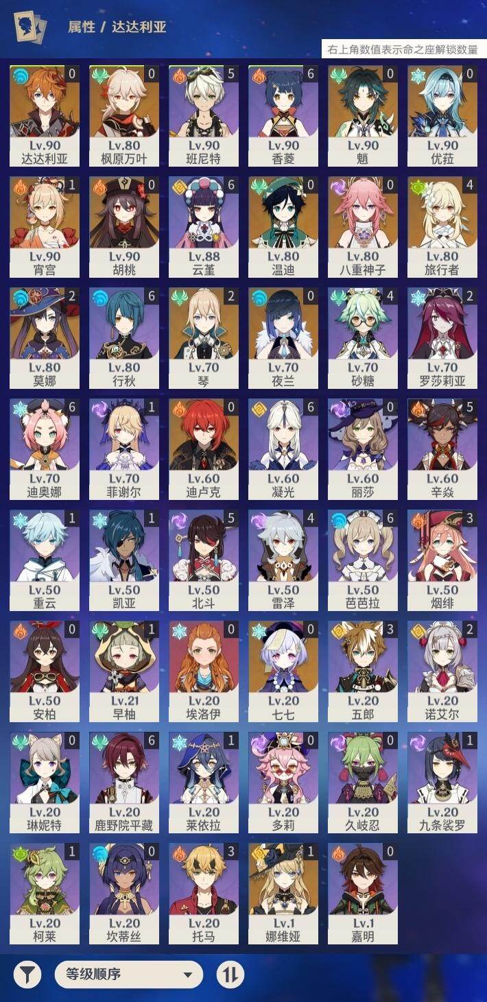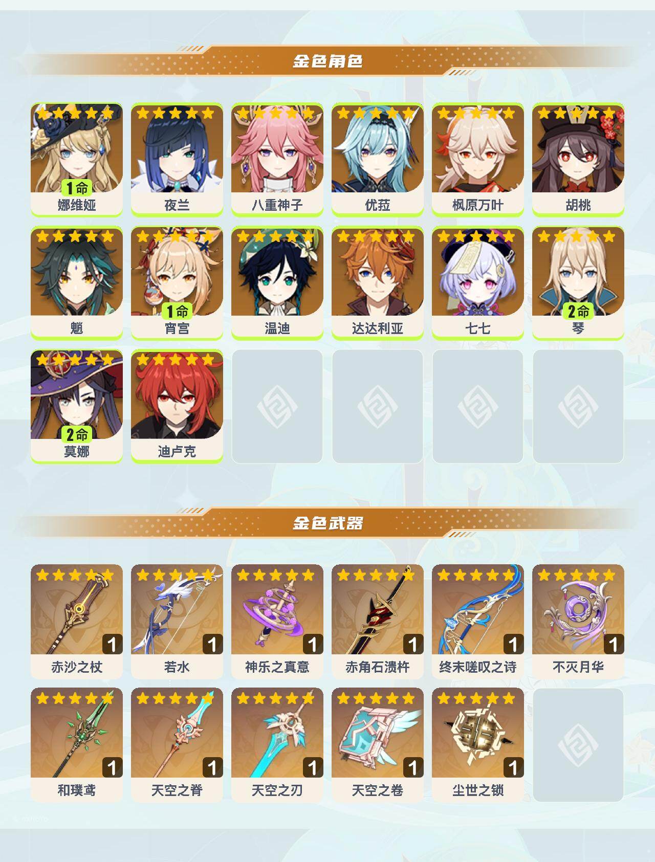 57级/31黄/女主/14个五星角色/11个五星武器 1命娜维娅0命夜兰0命八重神子0命优菈0命枫原万叶0命胡桃0命魈1命宵宫0命温迪0命达达利亚0命七七2命琴2命莫娜0命迪卢克精1赤沙之杖精1若水精1神乐之真意精1赤角石溃杵精1终末嗟叹之诗精1不灭月华精1和璞鸢精1天空之脊精1天空之刃精1天空之卷精1尘世之锁
