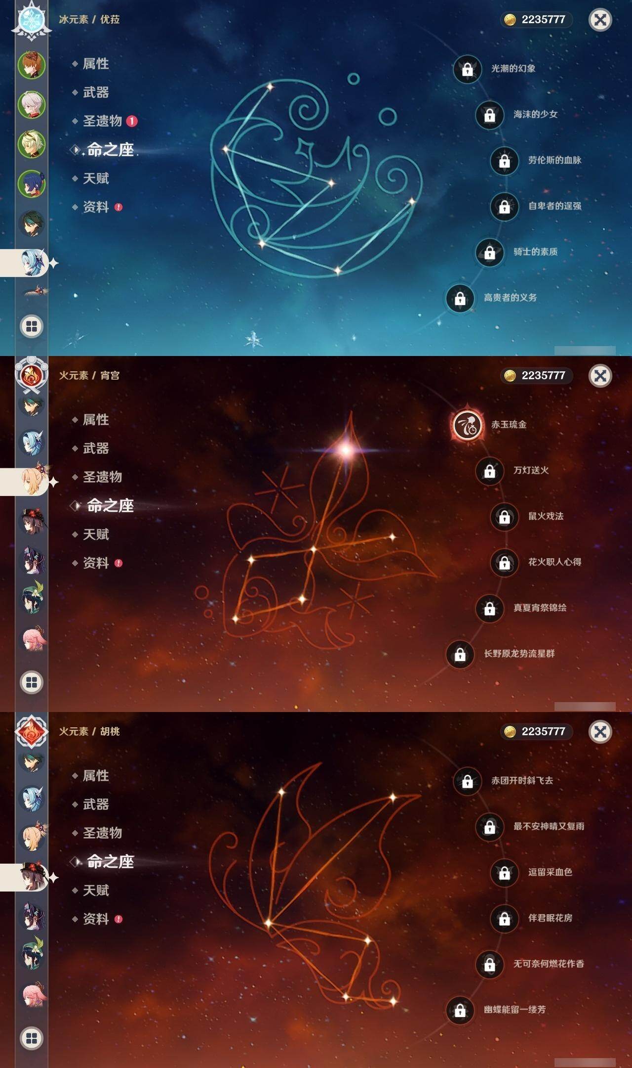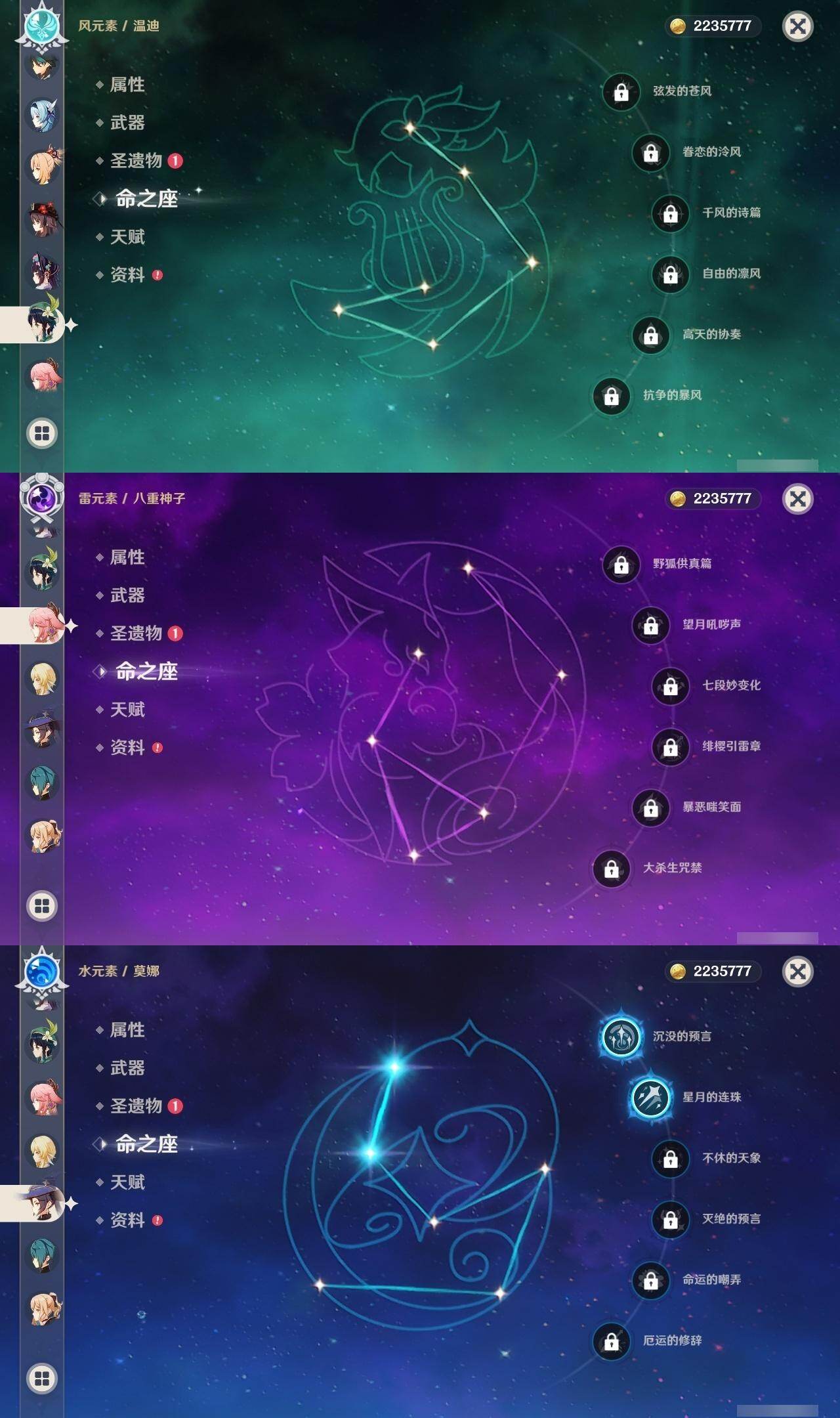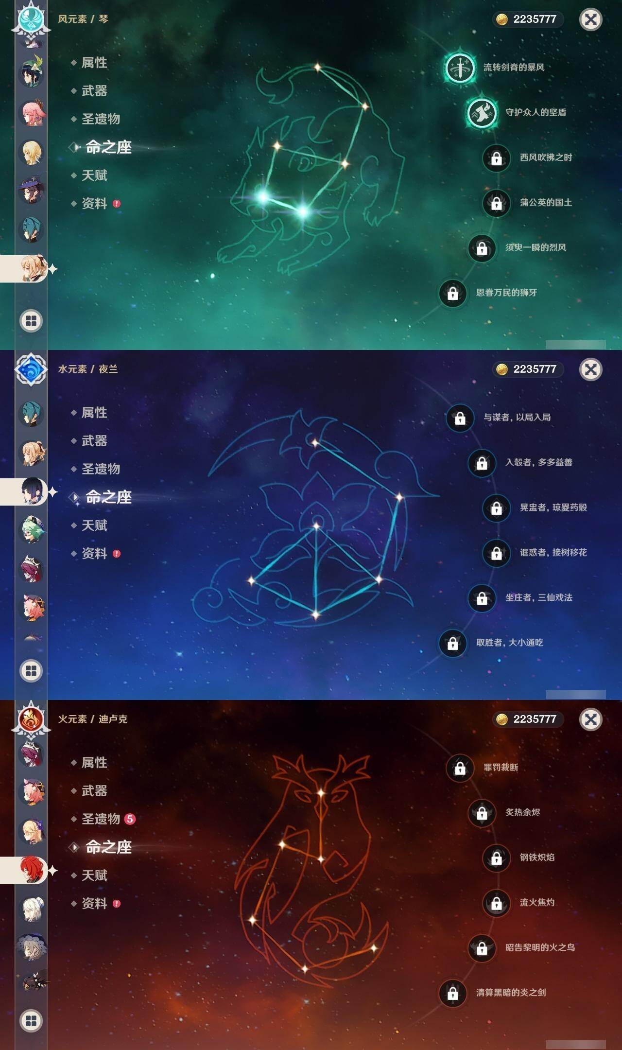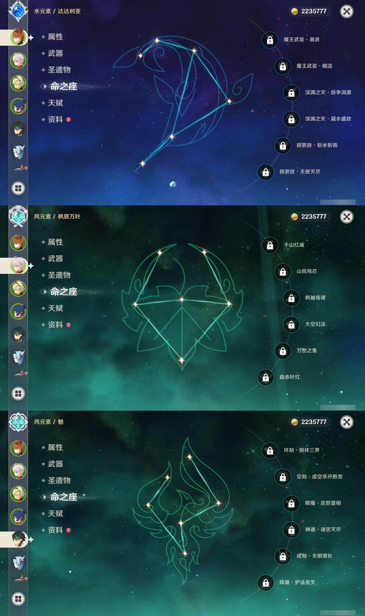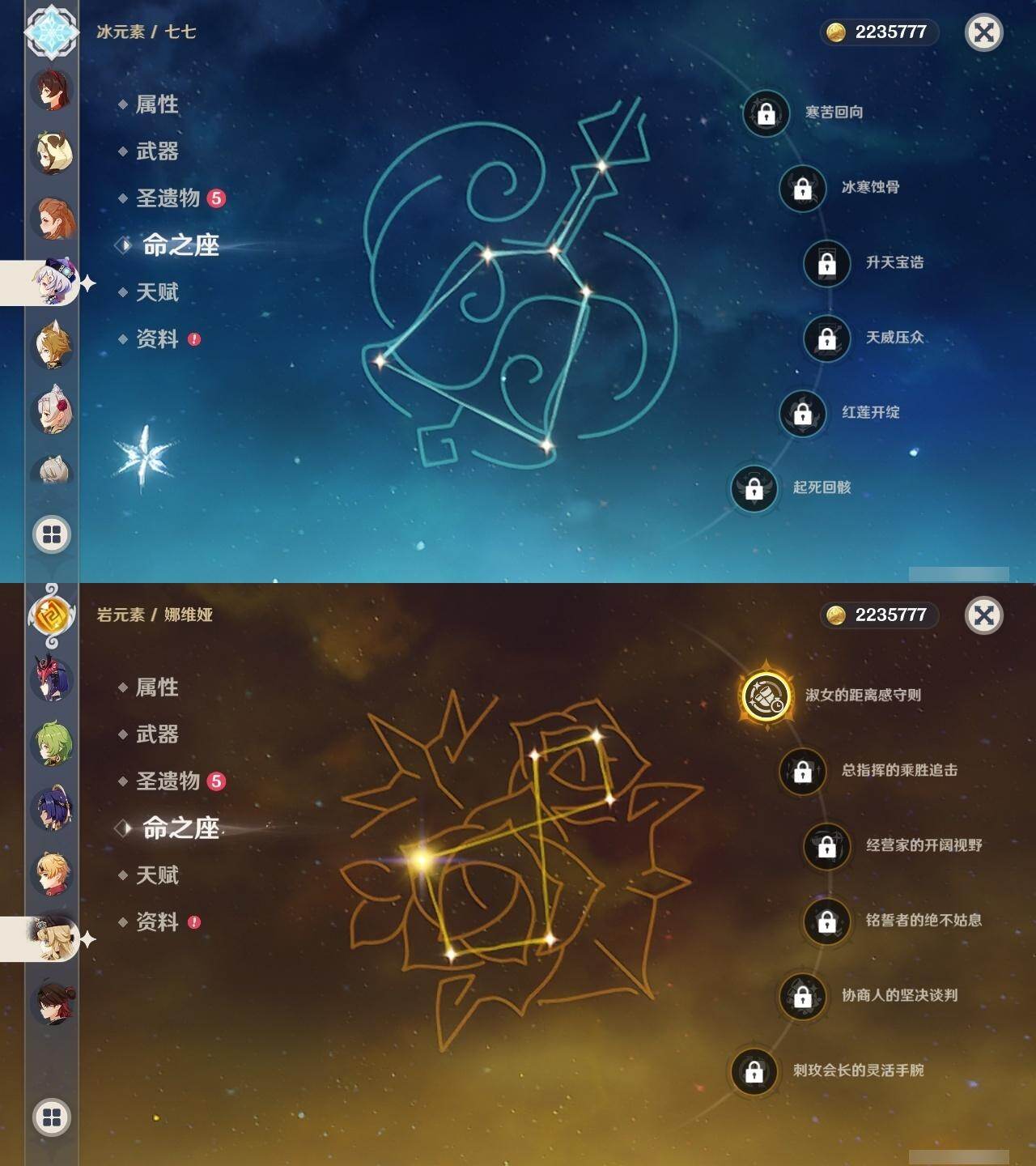 57级/31黄/女主/14个五星角色/11个五星武器 1命娜维娅0命夜兰0命八重神子0命优菈0命枫原万叶0命胡桃0命魈1命宵宫0命温迪0命达达利亚0命七七2命琴2命莫娜0命迪卢克精1赤沙之杖精1若水精1神乐之真意精1赤角石溃杵精1终末嗟叹之诗精1不灭月华精1和璞鸢精1天空之脊精1天空之刃精1天空之卷精1尘世之锁