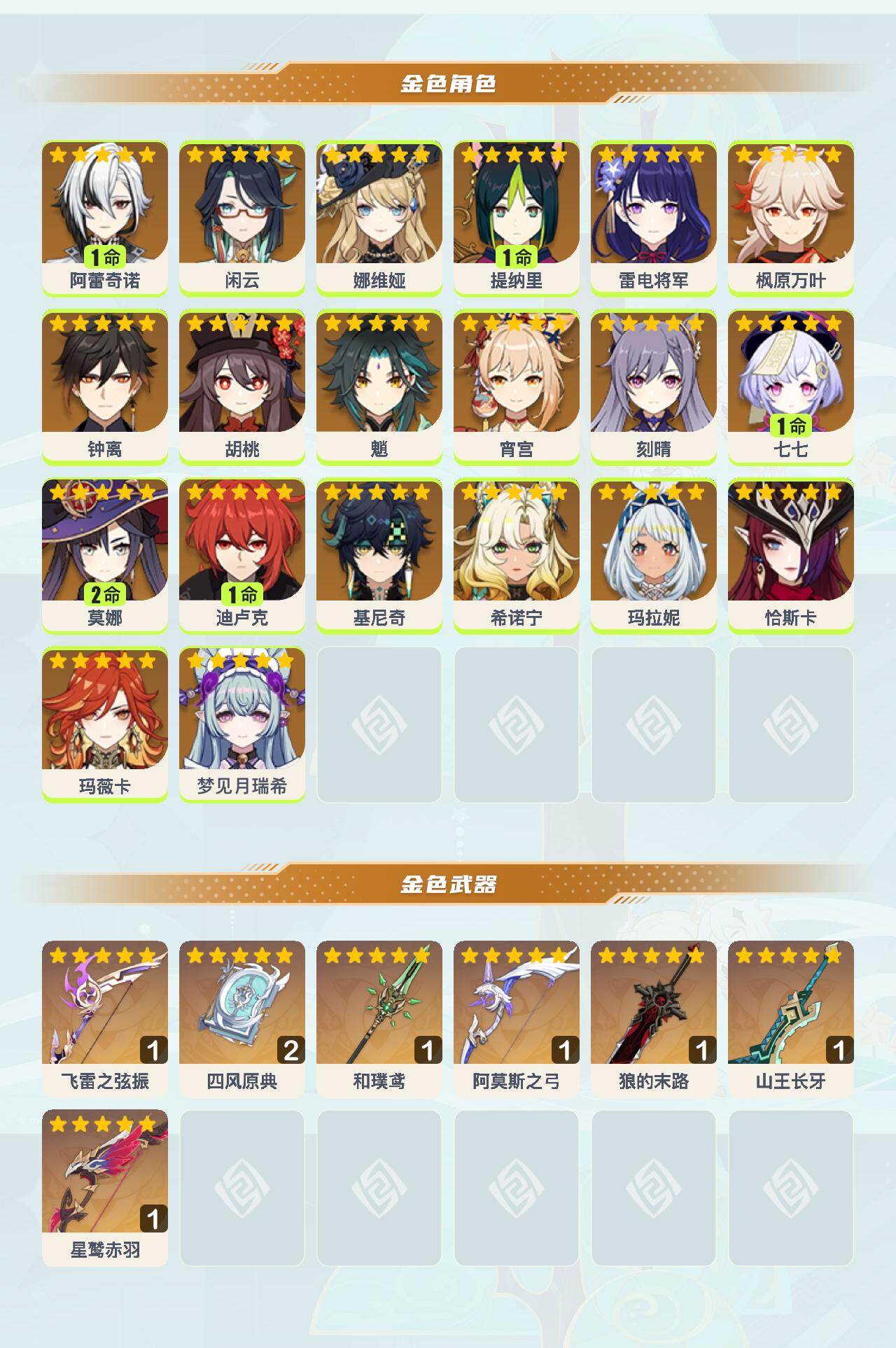 【ysx1621】58级/34黄/女主/20个五星角色/7个五星武器/0命钟离/0命玛拉妮/0命希诺宁/0命玛薇卡/0命恰斯卡/0命枫原万叶/0命魈/0命雷电将军/0命基尼奇/1命阿蕾奇诺/0命闲云/0命胡桃/0命宵宫/0命娜维娅/1命提纳里/1命七七/2命莫娜/1命迪卢克/0命梦见月瑞希/0命刻晴/精1山王长牙/精1星鹫赤羽/精2四风原典/精1和璞鸢/精1狼的末路/精1阿莫斯之弓/精1飞雷之弦振