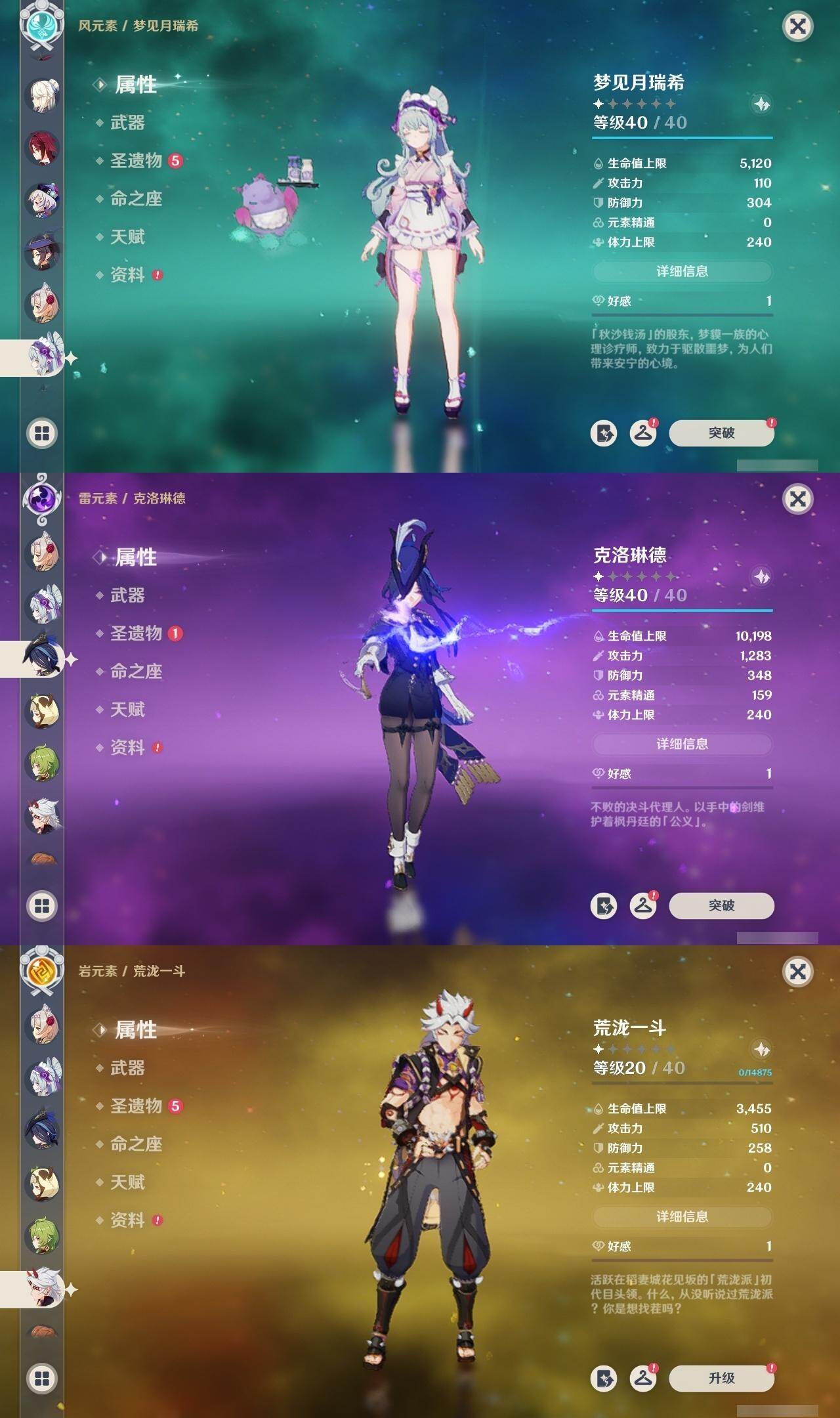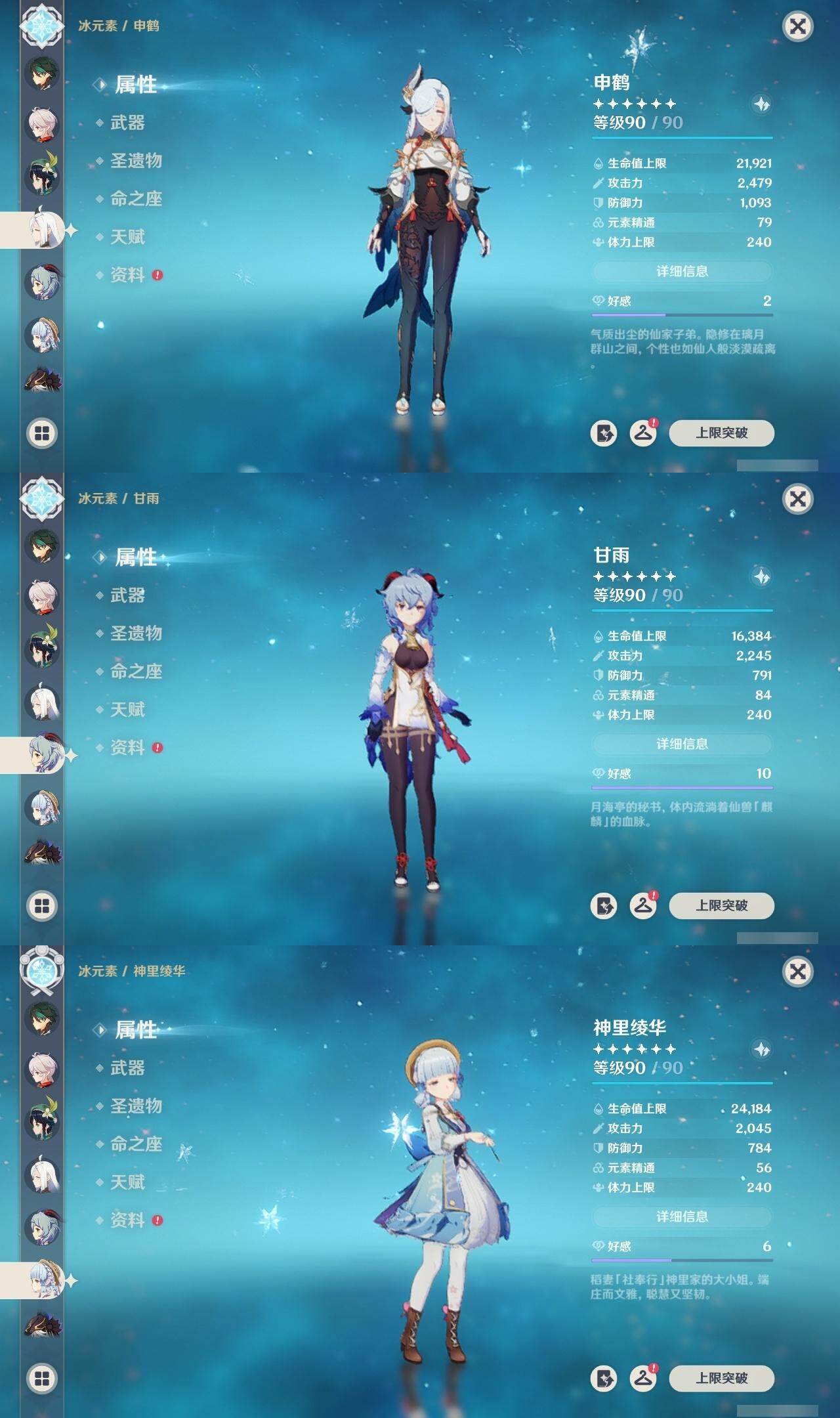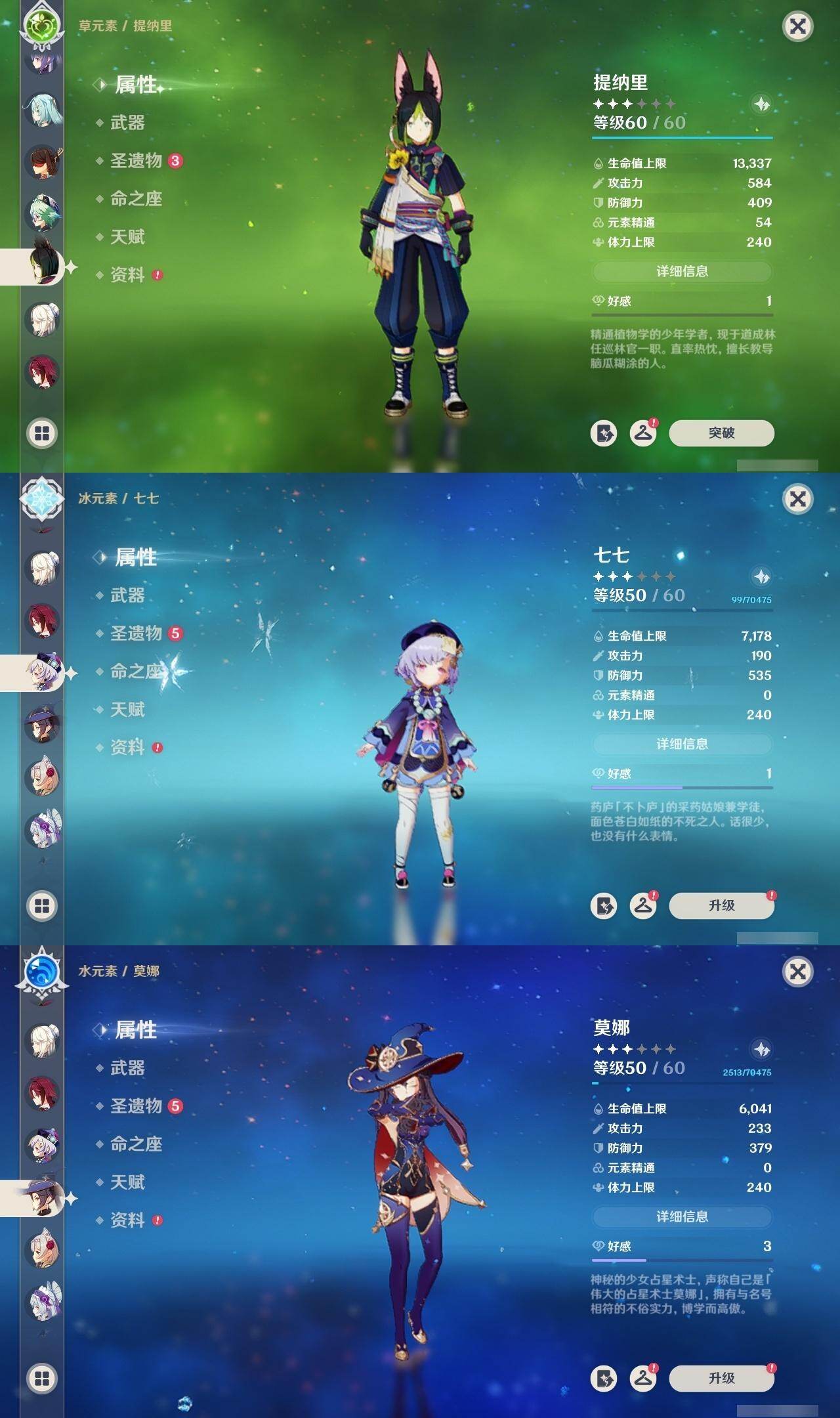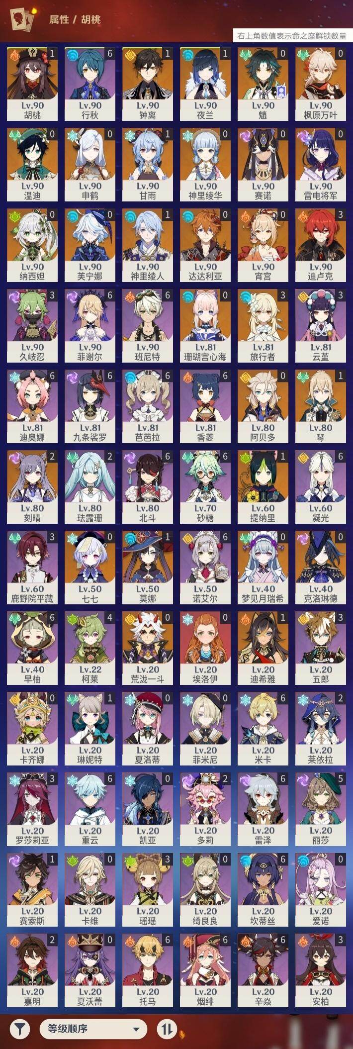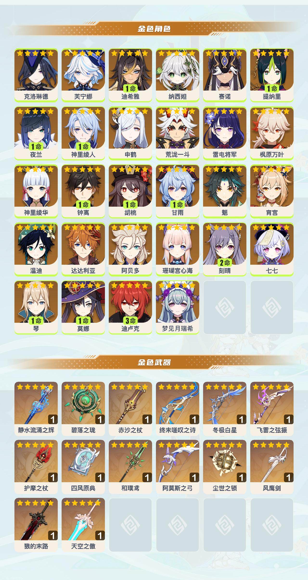 60级/62黄/女主/28个五星角色/20个五星武器 0命克洛琳德0命芙宁娜1命迪希雅0命纳西妲0命赛诺1命提纳里1命夜兰1命神里绫人0命申鹤0命荒泷一斗0命雷电将军0命枫原万叶0命神里绫华1命钟离1命胡桃1命甘雨0命魈0命宵宫0命温迪0命达达利亚0命阿贝多0命珊瑚宫心海2命刻晴0命七七1命琴1命莫娜3命迪卢克0命梦见月瑞希精1静水流涌之辉精1碧落之珑精1赤沙之杖精1终末嗟叹之诗精1冬极白星精1飞雷之弦振精1护摩之杖精1四风原典精1和璞鸢精1阿莫斯之弓精1尘世之锁精1风鹰剑精1狼的末路精1天空之傲