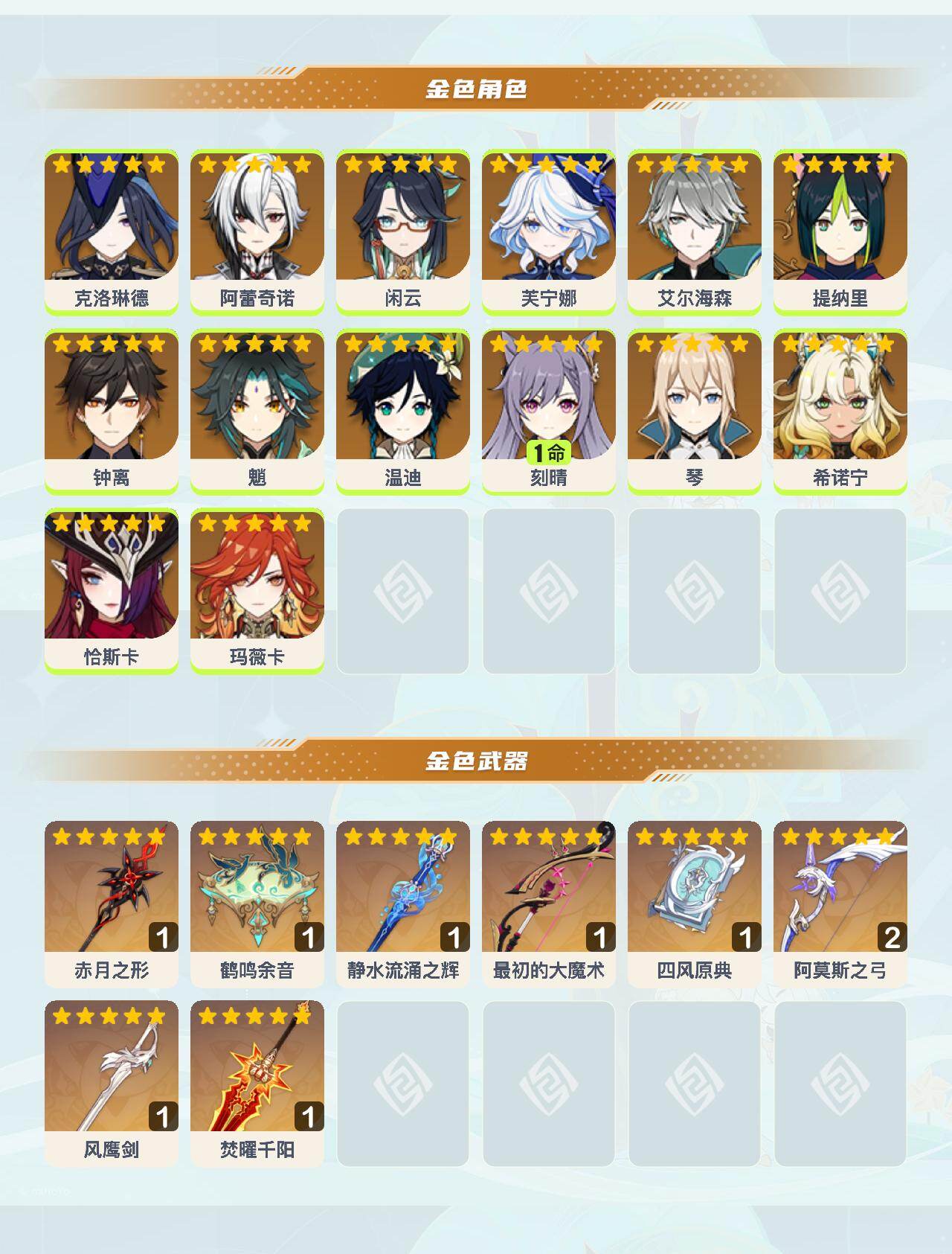 【ysyt760】57级/24黄/女主/14个五星角色/8个五星武器/0命玛薇卡/0命阿蕾奇诺/0命芙宁娜/0命钟离/0命魈/0命希诺宁/0命恰斯卡/0命克洛琳德/0命温迪/1命刻晴/0命艾尔海森/0命闲云/0命琴/0命提纳里/精1最初的大魔术/精1赤月之形/精1焚曜千阳/精1静水流涌之辉/精1风鹰剑/精2阿莫斯之弓/精1鹤鸣余音/精1四风原典