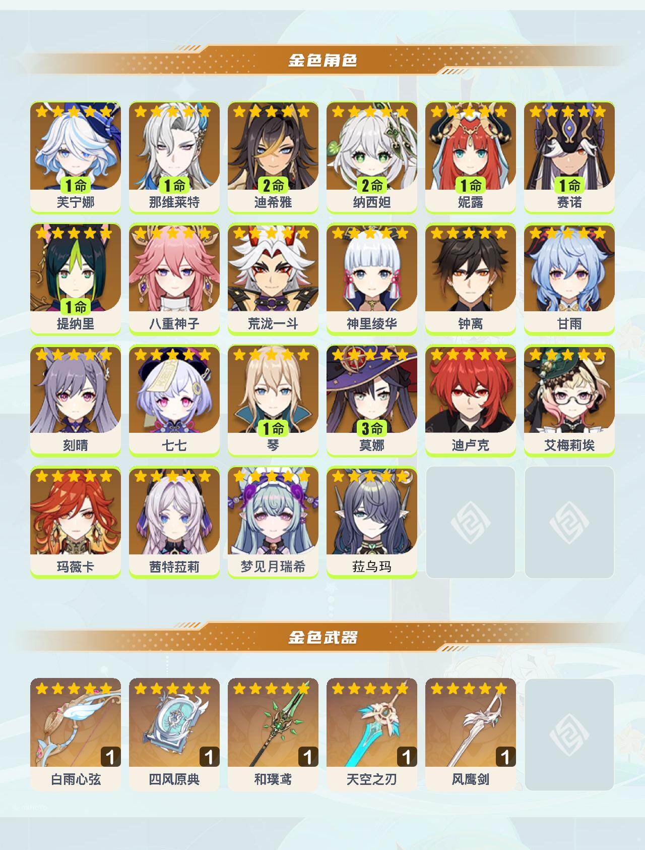 【ysyt763】60级/40黄/女主/22个五星角色/5个五星武器/1命那维莱特/1命芙宁娜/0命钟离/0命玛薇卡/1命琴/0命神里绫华/2命纳西妲/0命茜特菈莉/0命艾梅莉埃/0命甘雨/1命赛诺/0命八重神子/1命妮露/0命菈乌玛/0命梦见月瑞希/0命七七/0命刻晴/1命提纳里/3命莫娜/2命迪希雅/0命荒泷一斗/0命迪卢克/精1四风原典/精1和璞鸢/精1天空之刃/精1风鹰剑/精1白雨心弦