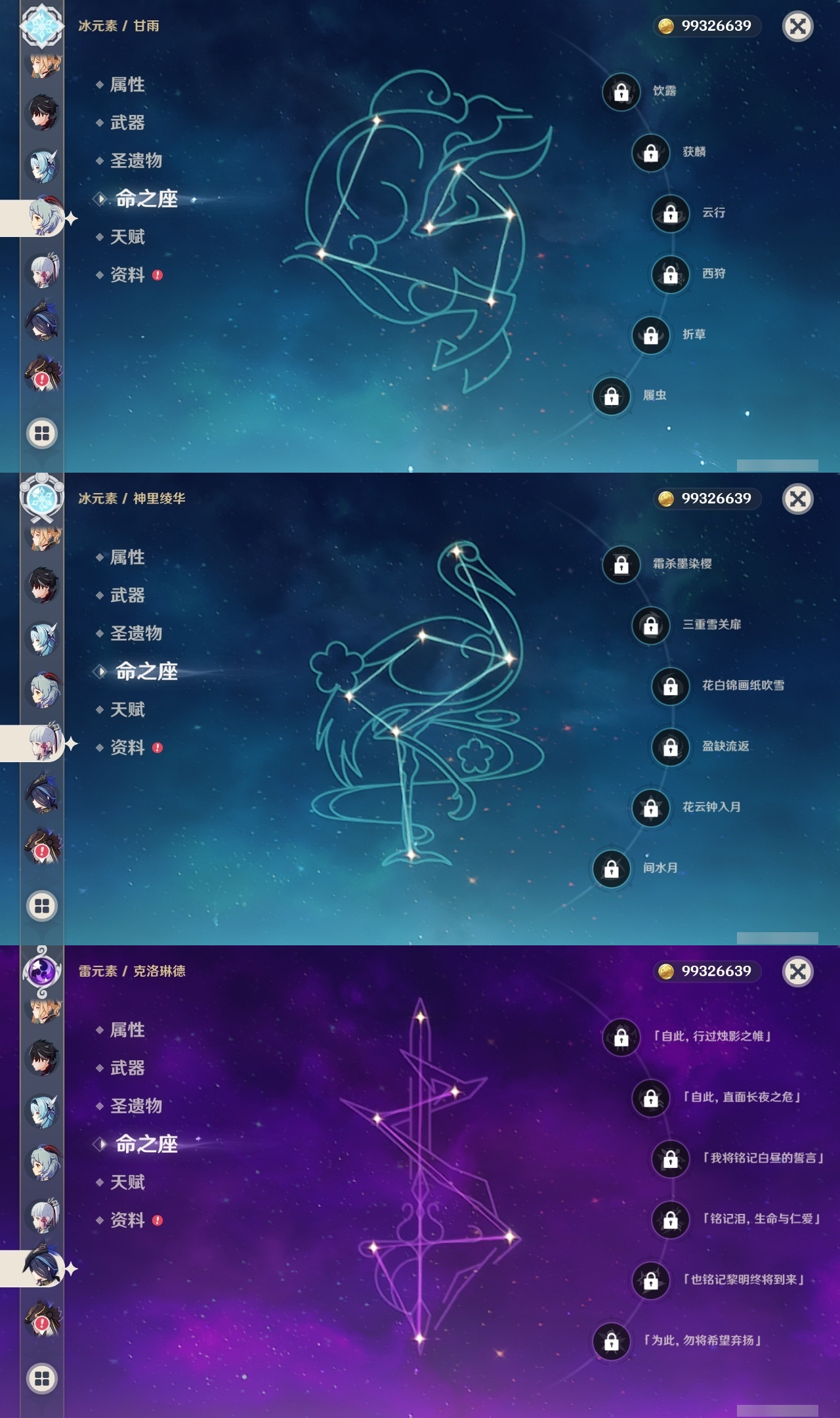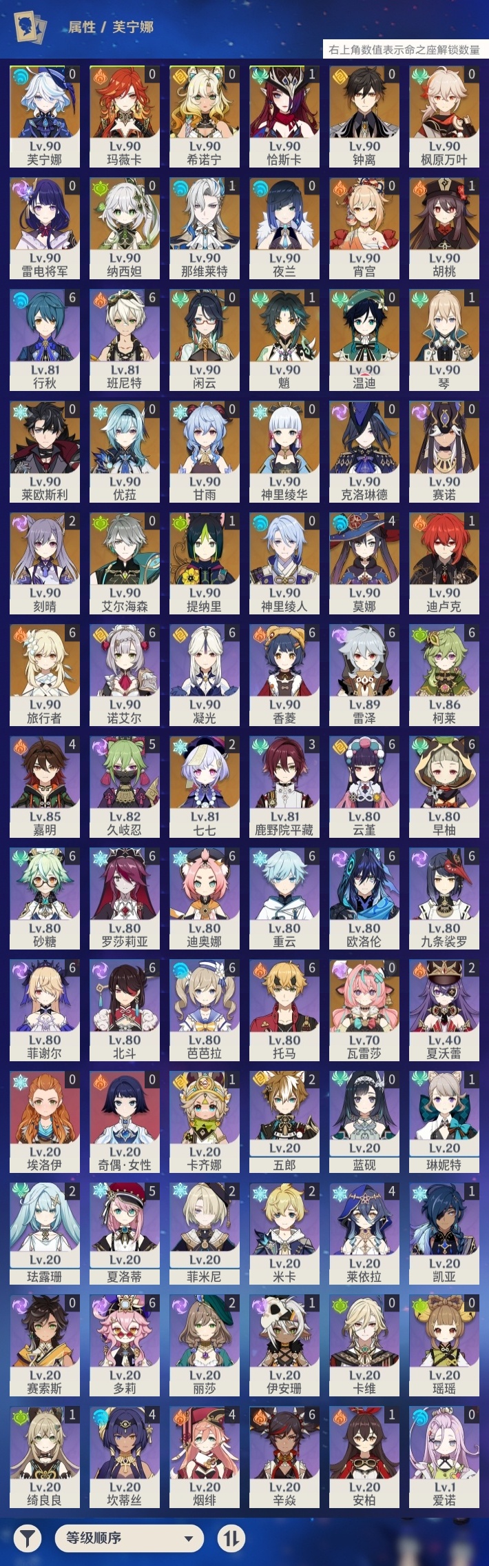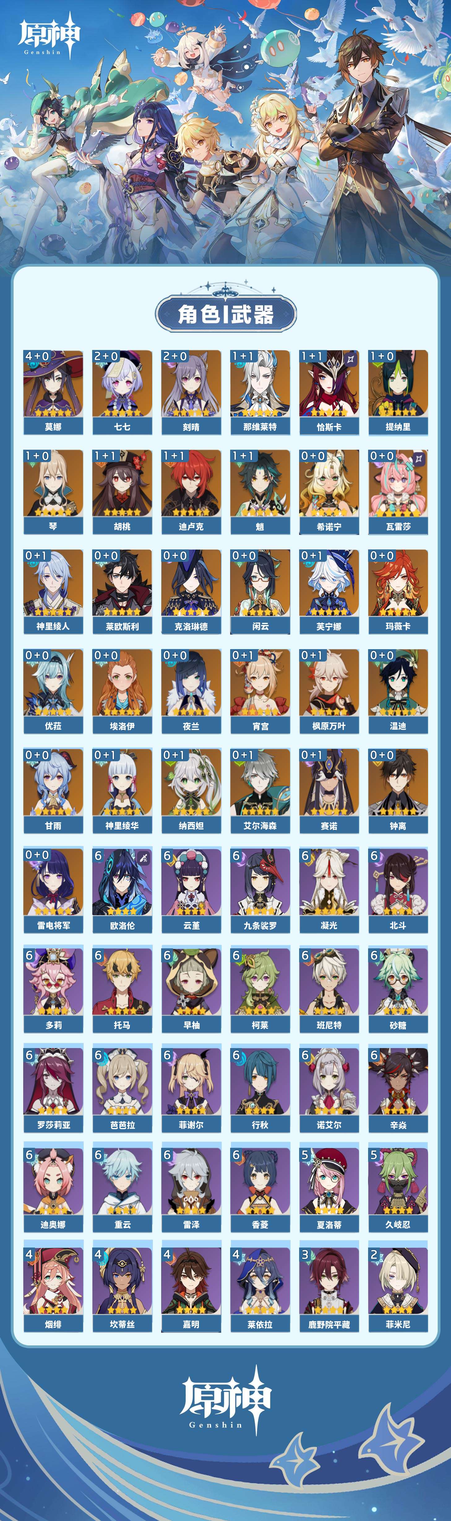 【原神】【lyys11432】冒险等级:60,五星数量:50,五星角色:莫娜 4命刻晴 2命七七 2命恰斯卡 1命那维莱特 1命迪卢克 1命魈 1命胡桃 1命琴 1命提纳里 1命希诺宁神里绫华温迪玛薇卡宵宫优菈钟离瓦雷莎神里绫人莱欧斯利夜兰芙宁娜闲云赛诺纳西妲艾尔海森枫原万叶甘雨克洛琳德雷电将军__五星武器:星鹫赤羽万世流涌大典静水流涌之辉裁叶萃光苍古自由之誓飞雷之弦振和璞鸢护摩之杖狼的末路磐岩结绿天空之傲天空之卷天空之刃天空之翼雾切之回光波乱月白经津赤沙之杖千夜浮梦__四星角色:班尼特 6命行秋 6命九条裟罗 6命香菱 6命凝光 6命迪奥娜 6命砂糖 6命多莉 6命柯莱 6命芭芭拉 6命欧洛伦 6命云堇 6命早柚 6命托马 6命重云 6命辛焱 6命诺艾尔 6命罗莎莉亚 6命雷泽 6命菲谢尔 6命北斗 6命久岐忍 5命夏洛蒂 5命莱依拉 4命坎蒂丝 4命烟绯 4命嘉明 4命鹿野院平藏 3命珐露珊 2命米卡 2命五郎 2命菲米尼 2命夏沃蕾 2命卡齐娜 1命绮良良 1命琳妮特 1命伊安珊 1命埃洛伊奇偶·女性瑶瑶卡维蓝砚爱诺赛索斯