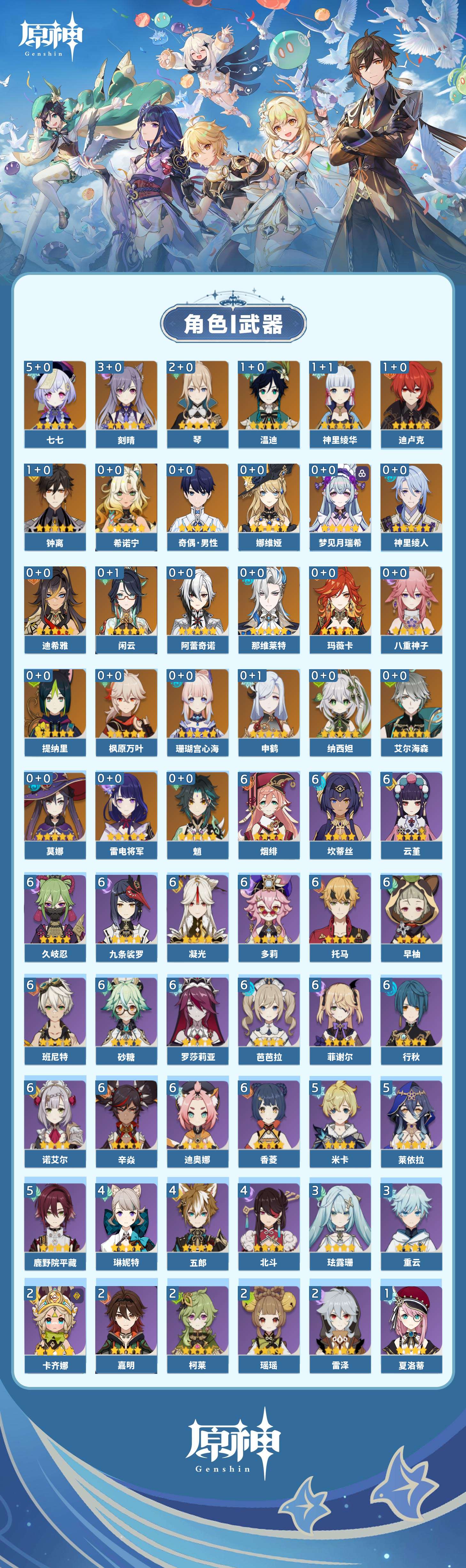 【原神】【lyys11427】冒险等级:60,五星数量:36,五星角色:七七 5命刻晴 3命琴 2命迪卢克 1命神里绫华 1命温迪 1命钟离 1命莫娜珊瑚宫心海希诺宁玛薇卡迪希雅梦见月瑞希申鹤八重神子神里绫人那维莱特娜维娅提纳里闲云阿蕾奇诺纳西妲艾尔海森枫原万叶魈雷电将军__五星武器:鹤鸣余音风鹰剑四风原典天空之脊天空之卷雾切之回光赤角石溃杵息灾赦罪__四星角色:班尼特 6命行秋 6命九条裟罗 6命香菱 6命久岐忍 6命凝光 6命迪奥娜 6命砂糖 6命坎蒂丝 6命多莉 6命芭芭拉 6命云堇 6命早柚 6命托马 6命烟绯 6命辛焱 6命诺艾尔 6命罗莎莉亚 6命菲谢尔 6命鹿野院平藏 5命莱依拉 5命米卡 5命五郎 4命北斗 4命琳妮特 4命珐露珊 3命重云 3命卡齐娜 2命瑶瑶 2命柯莱 2命雷泽 2命嘉明 2命卡维 1命夏洛蒂 1命塔利雅 1命奇偶·男性绮良良菲米尼夏沃蕾
