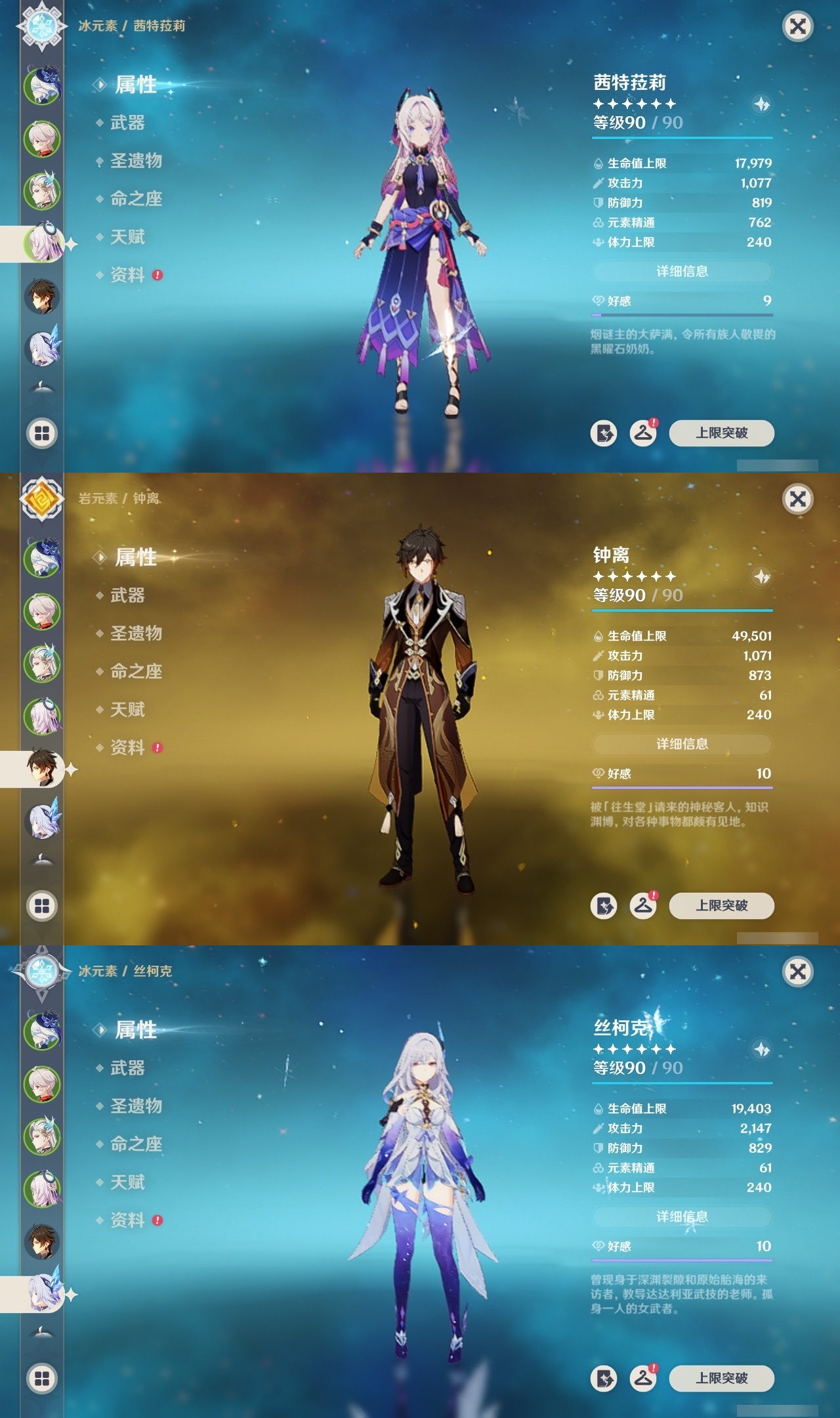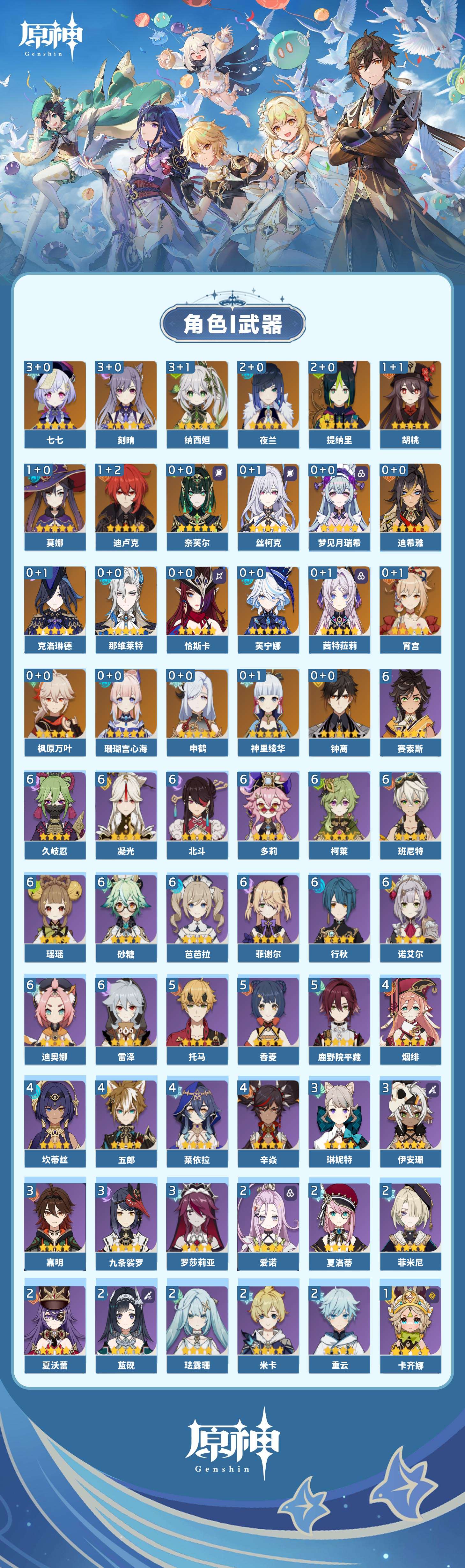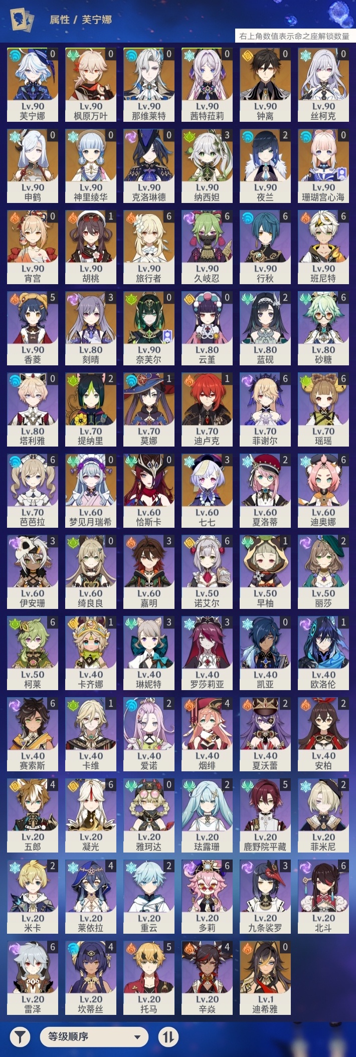 【原神】【lyys11438】冒险等级:60,五星数量:36,五星角色:刻晴 3命七七 3命纳西妲 3命夜兰 2命提纳里 2命迪卢克 1命胡桃 1命莫娜 1命珊瑚宫心海神里绫华恰斯卡茜特菈莉宵宫迪希雅钟离梦见月瑞希申鹤那维莱特芙宁娜丝柯克奈芙尔枫原万叶克洛琳德__五星武器:狼的末路 2精祭星者之望最初的大魔术苍耀飞雷之弦振护摩之杖天空之傲天空之卷天空之刃天空之翼雾切之回光千夜浮梦赦罪__四星角色:班尼特 6命行秋 6命久岐忍 6命凝光 6命迪奥娜 6命砂糖 6命瑶瑶 6命多莉 6命柯莱 6命芭芭拉 6命诺艾尔 6命雷泽 6命菲谢尔 6命北斗 6命赛索斯 6命香菱 5命鹿野院平藏 5命托马 5命莱依拉 4命坎蒂丝 4命五郎 4命烟绯 4命辛焱 4命九条裟罗 3命罗莎莉亚 3命琳妮特 3命嘉明 3命伊安珊 3命珐露珊 2命米卡 2命蓝砚 2命重云 2命菲米尼 2命夏洛蒂 2命夏沃蕾 2命爱诺 2命卡齐娜 1命卡维 1命欧洛伦 1命早柚 1命绮良良云堇塔利雅