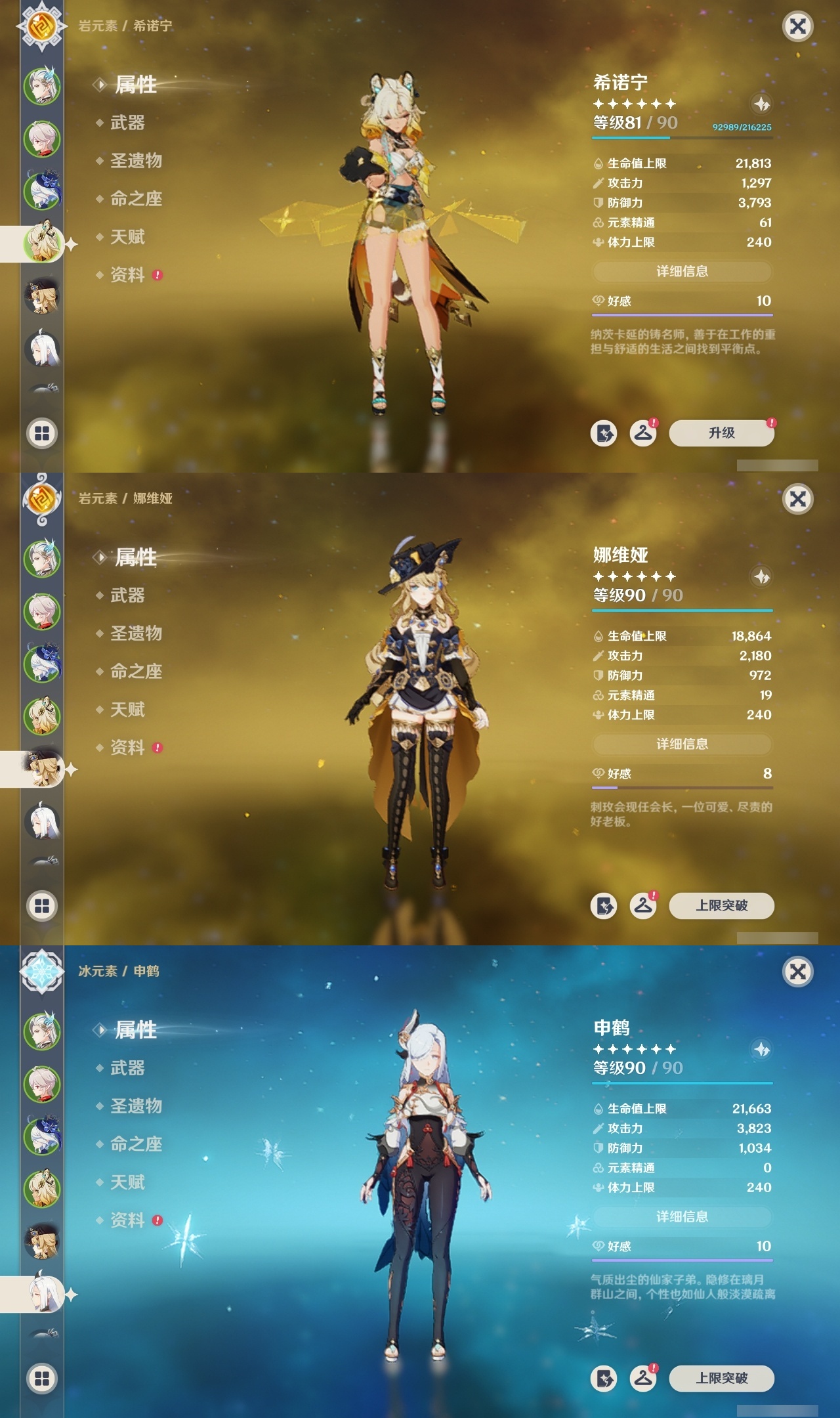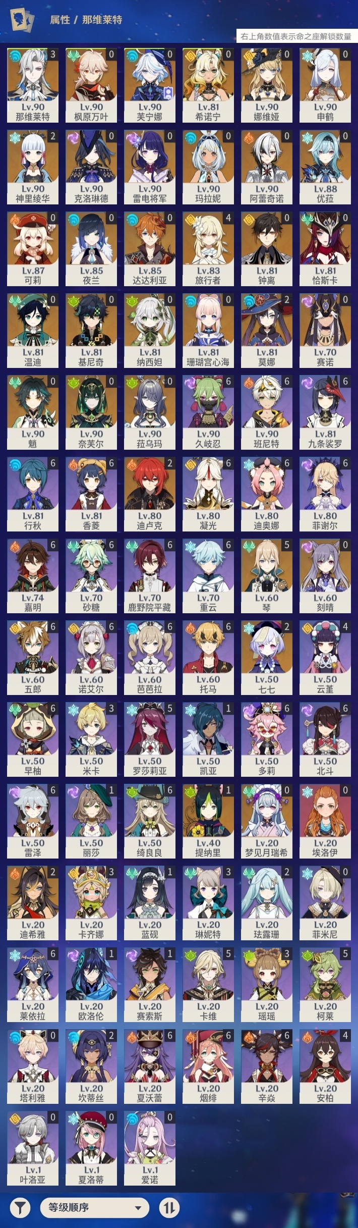 【原神】【lyys11434】冒险等级:60,五星数量:50,五星角色:琴 5命那维莱特 3命迪希雅 2命迪卢克 2命莫娜 2命七七 2命神里绫华 2命提纳里 1命玛拉妮基尼奇珊瑚宫心海希诺宁温迪恰斯卡优菈钟离达达利亚梦见月瑞希申鹤夜兰芙宁娜娜维娅赛诺阿蕾奇诺纳西妲菈乌玛奈芙尔枫原万叶魈克洛琳德可莉刻晴雷电将军__五星武器:狼的末路 2精冲浪时光岩峰巡歌星鹫赤羽苇海信标万世流涌大典有乐御簾切阿莫斯之弓飞雷之弦振四风原典天空之卷天空之刃赤角石溃杵息灾圣显之钥千夜浮梦__四星角色:班尼特 6命行秋 6命九条裟罗 6命香菱 6命久岐忍 6命鹿野院平藏 6命凝光 6命迪奥娜 6命砂糖 6命绮良良 6命莱依拉 6命多莉 6命芭芭拉 6命早柚 6命托马 6命五郎 6命烟绯 6命重云 6命辛焱 6命诺艾尔 6命雷泽 6命菲谢尔 6命北斗 6命夏沃蕾 6命嘉明 6命柯莱 5命卡维 5命罗莎莉亚 5命云堇 4命卡齐娜 3命瑶瑶 3命米卡 3命琳妮特 3命珐露珊 2命坎蒂丝 2命欧洛伦 1命蓝砚 1命赛索斯 1命埃洛伊菲米尼夏洛蒂塔利雅爱诺