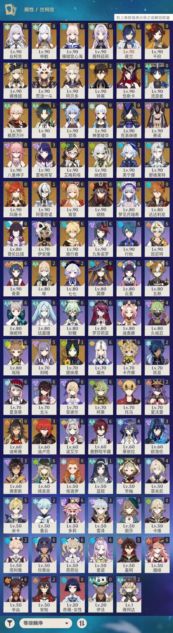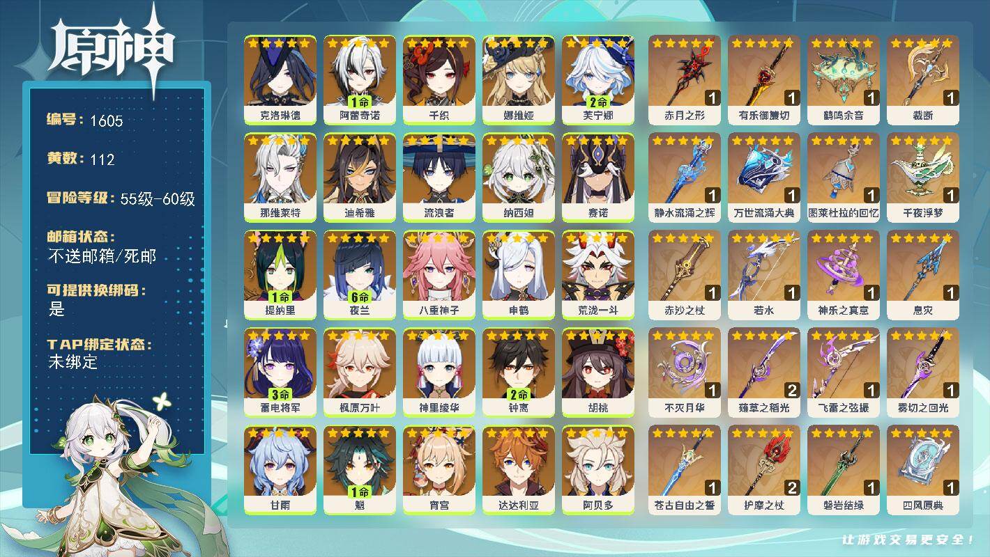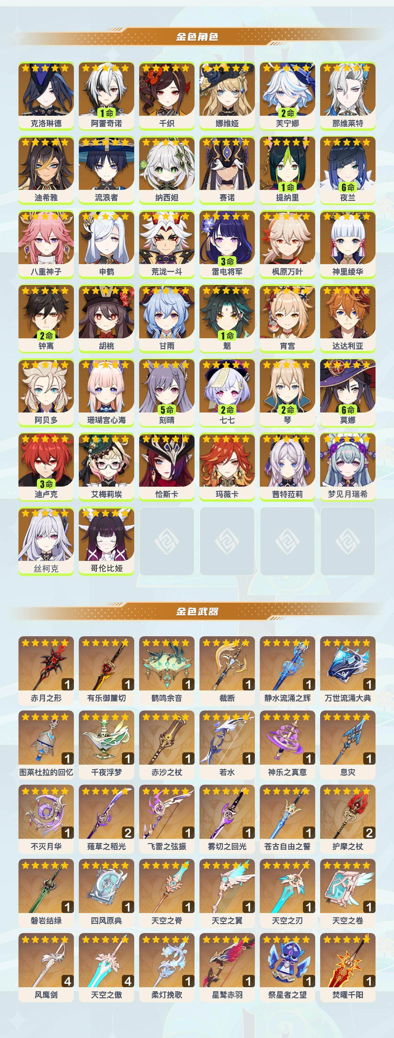 [15890666]60级/112黄/男主/38个五星角色/32个五星武器 0命克洛琳德1命阿蕾奇诺0命千织0命娜维娅2命芙宁娜0命那维莱特0命迪希雅0命流浪者0命纳西妲0命赛诺1命提纳里满命夜兰0命八重神子0命申鹤0命荒泷一斗3命雷电将军0命枫原万叶0命神里绫华2命钟离0命胡桃0命甘雨1命魈0命宵宫0命达达利亚0命阿贝多0命珊瑚宫心海5命刻晴2命七七2命琴满命莫娜3命迪卢克0命艾梅莉埃0命恰斯卡0命玛薇卡0命茜特菈莉0命梦见月瑞希0命丝柯克0命哥伦比娅精1赤月之形精1有乐御簾切精1鹤鸣余音精1裁断精1静水流涌之辉精1万世流涌大典精1图莱杜拉的回忆精1千夜浮梦精1赤沙之杖精1若水精1神乐之真意精1息灾精1不灭月华精2薙草之稻光精1飞雷之弦振精1雾切之回光精1苍古自由之誓精2护摩之杖精1磐岩结绿精1四风原典精1天空之脊精1天空之翼精1天空之刃精1天空之卷精4风鹰剑精4天空之傲精1柔灯挽歌精1星鹫赤羽精1祭星者之望精1焚曜千阳