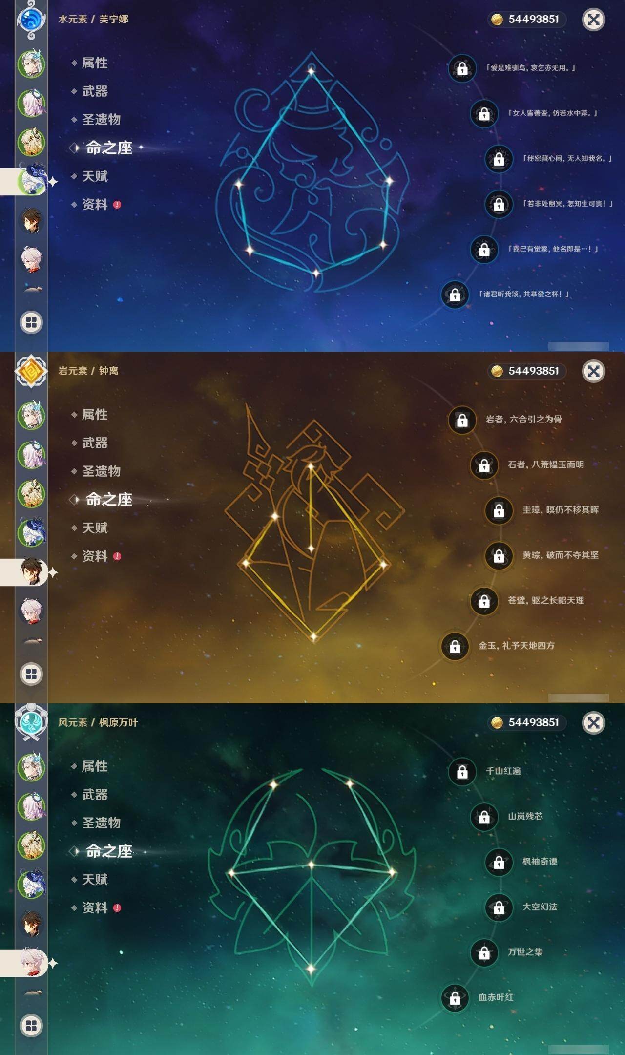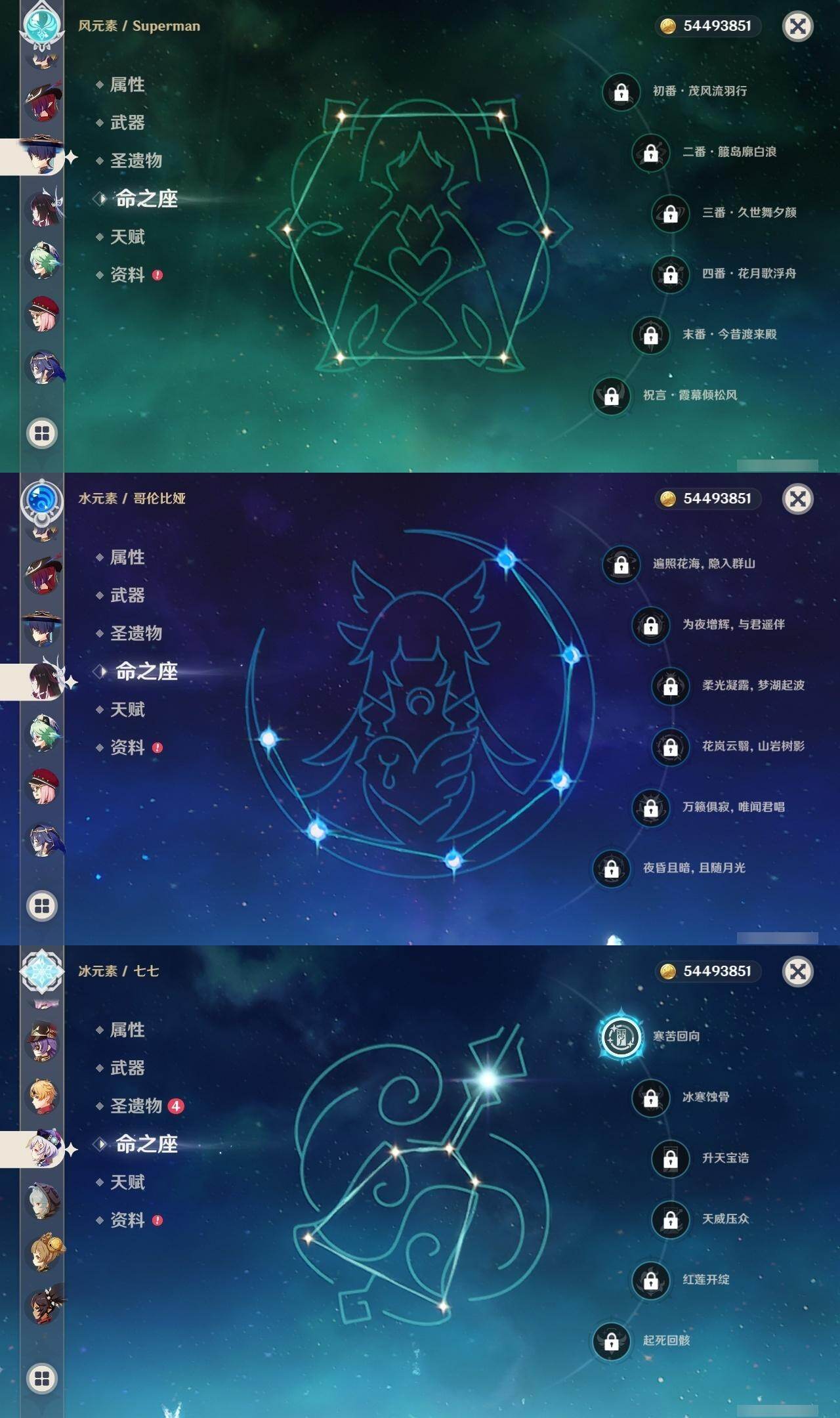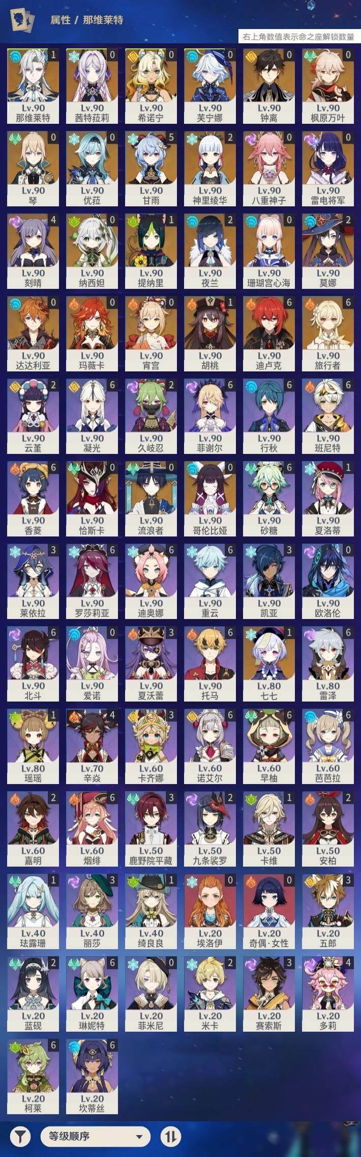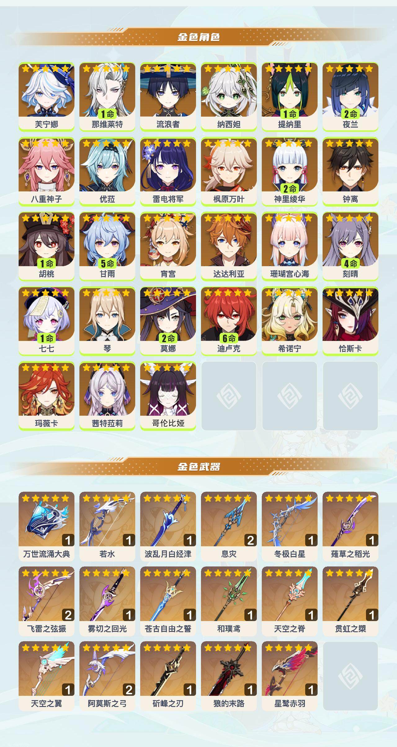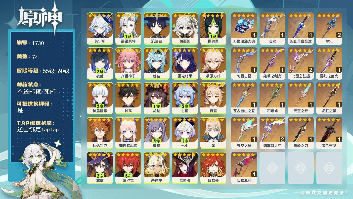 [16134392]60级/74黄/女主/27个五星角色/19个五星武器 0命芙宁娜1命那维莱特0命流浪者0命纳西妲1命提纳里2命夜兰0命八重神子0命优菈0命雷电将军0命枫原万叶2命神里绫华0命钟离1命胡桃5命甘雨0命宵宫0命达达利亚0命珊瑚宫心海4命刻晴1命七七0命琴2命莫娜满命迪卢克0命希诺宁0命恰斯卡0命玛薇卡0命茜特菈莉0命哥伦比娅精1万世流涌大典精1若水精1波乱月白经津精2息灾精1冬极白星精1薙草之稻光精2飞雷之弦振精1雾切之回光精1苍古自由之誓精1和璞鸢精1天空之脊精1贯虹之槊精1天空之翼精2阿莫斯之弓精1斫峰之刃精1狼的末路精1星鹫赤羽