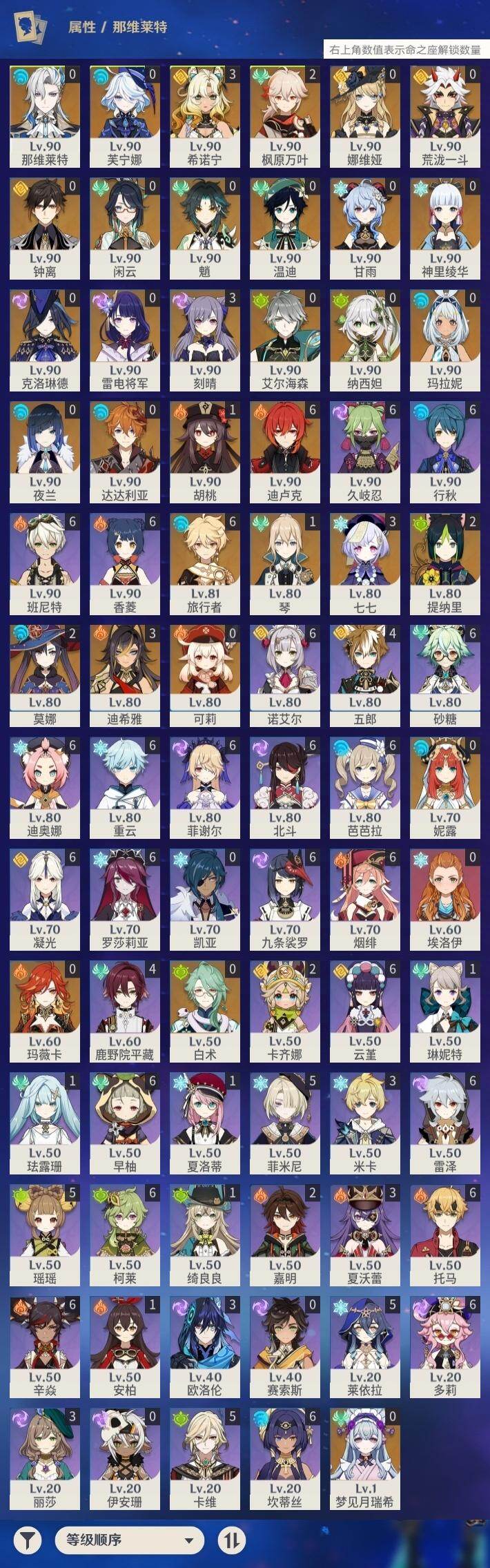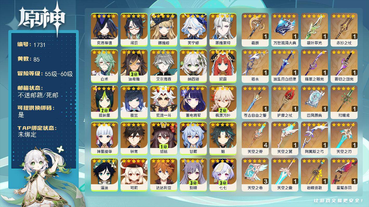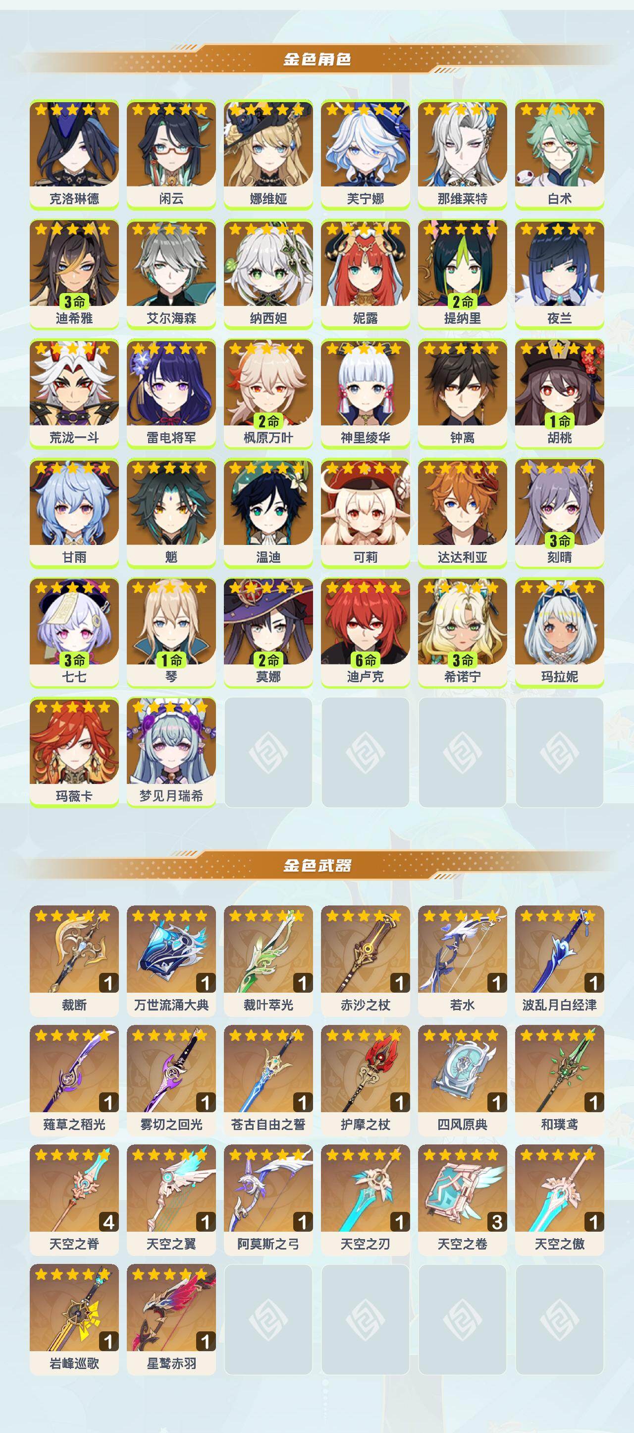 [16134564]60级/85黄/男主/32个五星角色/22个五星武器 0命克洛琳德0命闲云0命娜维娅0命芙宁娜0命那维莱特0命白术3命迪希雅0命艾尔海森0命纳西妲0命妮露2命提纳里0命夜兰0命荒泷一斗0命雷电将军2命枫原万叶0命神里绫华0命钟离1命胡桃0命甘雨0命魈0命温迪0命可莉0命达达利亚3命刻晴3命七七1命琴2命莫娜满命迪卢克3命希诺宁0命玛拉妮0命玛薇卡0命梦见月瑞希精1裁断精1万世流涌大典精1裁叶萃光精1赤沙之杖精1若水精1波乱月白经津精1薙草之稻光精1雾切之回光精1苍古自由之誓精1护摩之杖精1四风原典精1和璞鸢精4天空之脊精1天空之翼精1阿莫斯之弓精1天空之刃精3天空之卷精1天空之傲精1岩峰巡歌精1星鹫赤羽