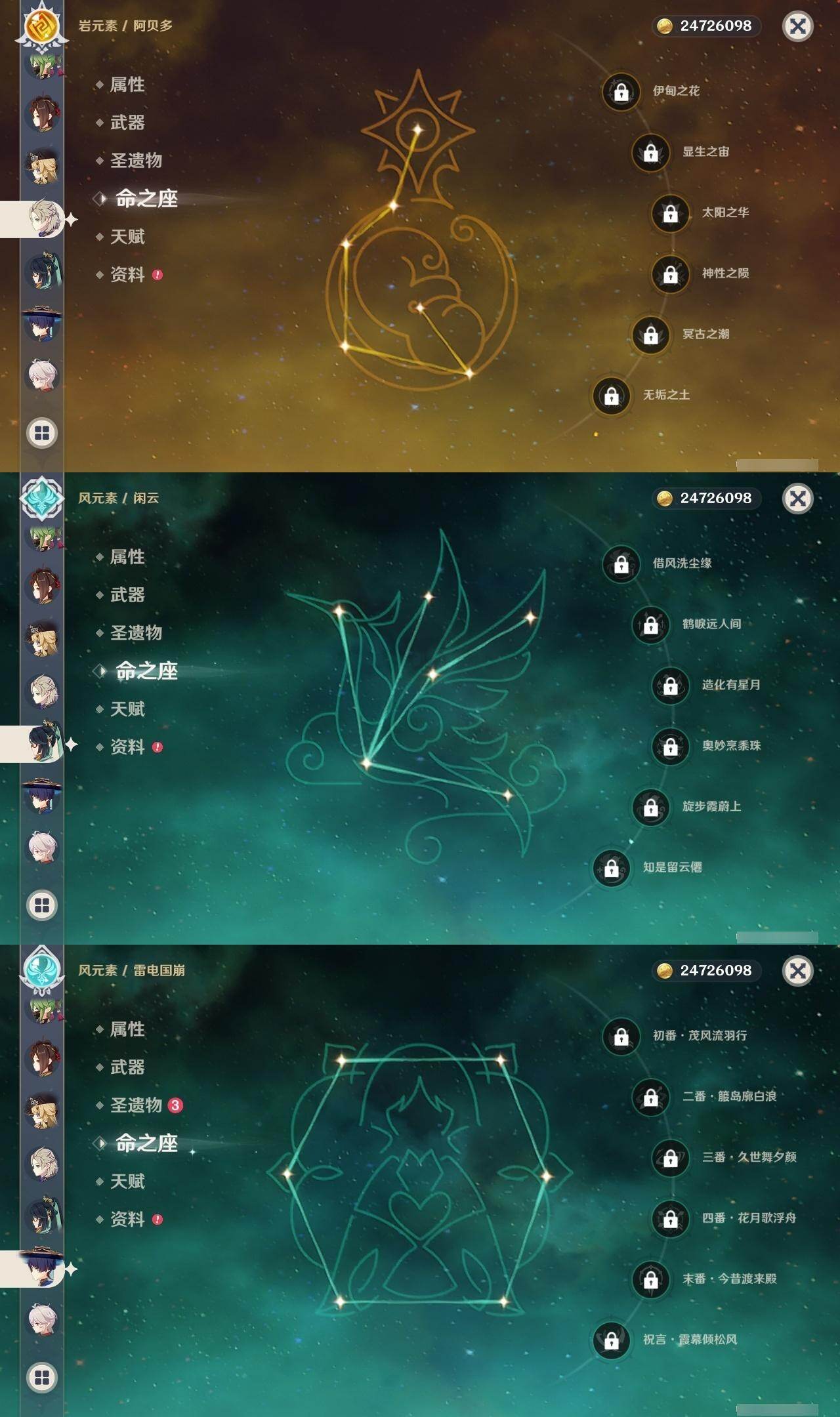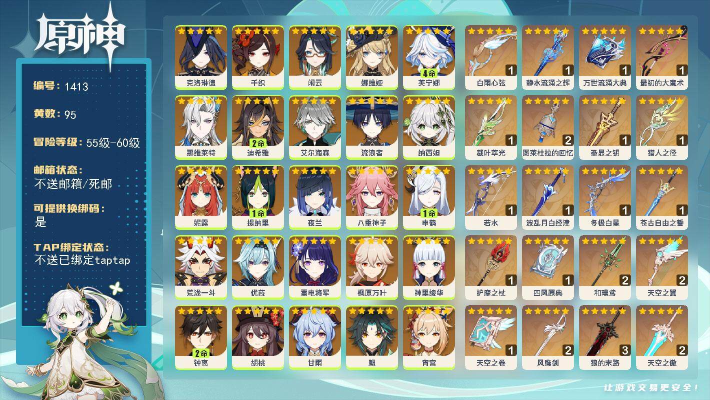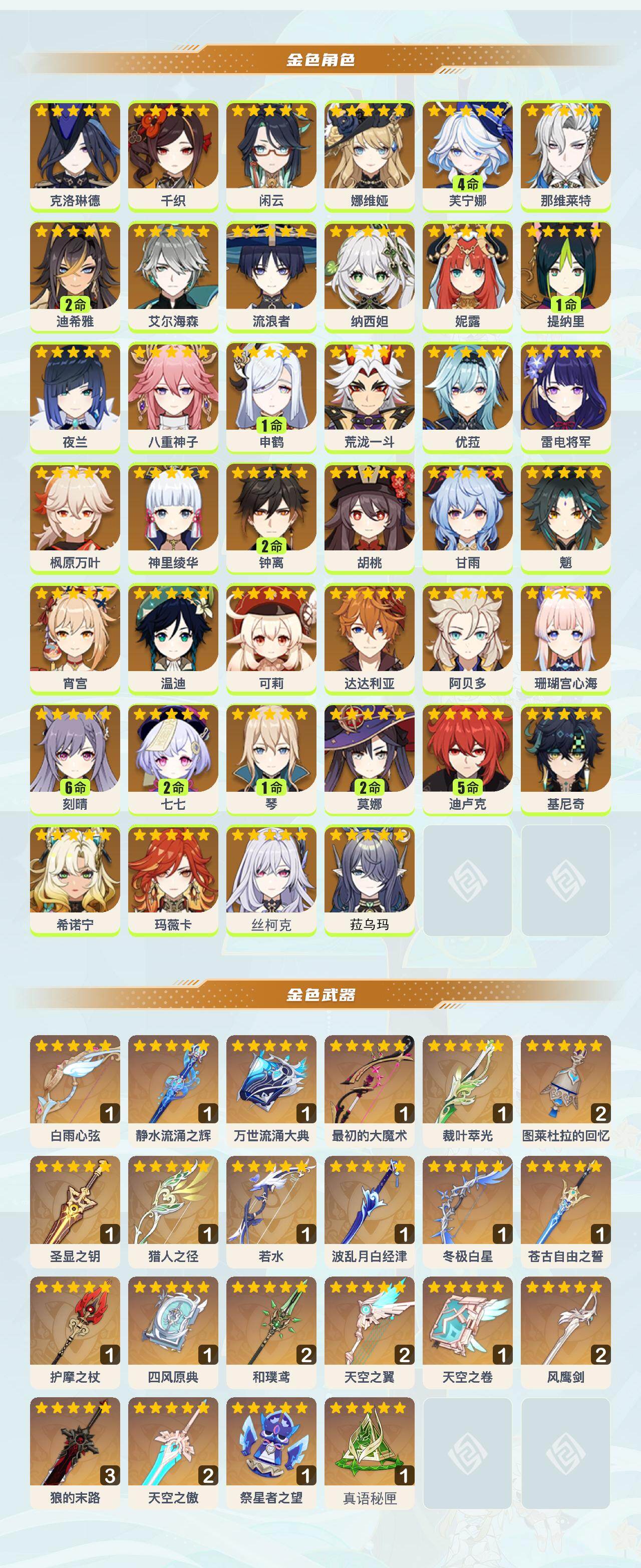[15457388]60级/95黄/女主/40个五星角色/22个五星武器 0命克洛琳德0命千织0命闲云0命娜维娅4命芙宁娜0命那维莱特2命迪希雅0命艾尔海森0命流浪者0命纳西妲0命妮露1命提纳里0命夜兰0命八重神子1命申鹤0命荒泷一斗0命优菈0命雷电将军0命枫原万叶0命神里绫华2命钟离0命胡桃0命甘雨0命魈0命宵宫0命温迪0命可莉0命达达利亚0命阿贝多0命珊瑚宫心海满命刻晴2命七七1命琴2命莫娜5命迪卢克0命基尼奇0命希诺宁0命玛薇卡0命丝柯克0命菈乌玛精1白雨心弦精1静水流涌之辉精1万世流涌大典精1最初的大魔术精1裁叶萃光精2图莱杜拉的回忆精1圣显之钥精1猎人之径精1若水精1波乱月白经津精1冬极白星精1苍古自由之誓精1护摩之杖精1四风原典精2和璞鸢精2天空之翼精1天空之卷精2风鹰剑精3狼的末路精2天空之傲精1祭星者之望精1真语秘匣