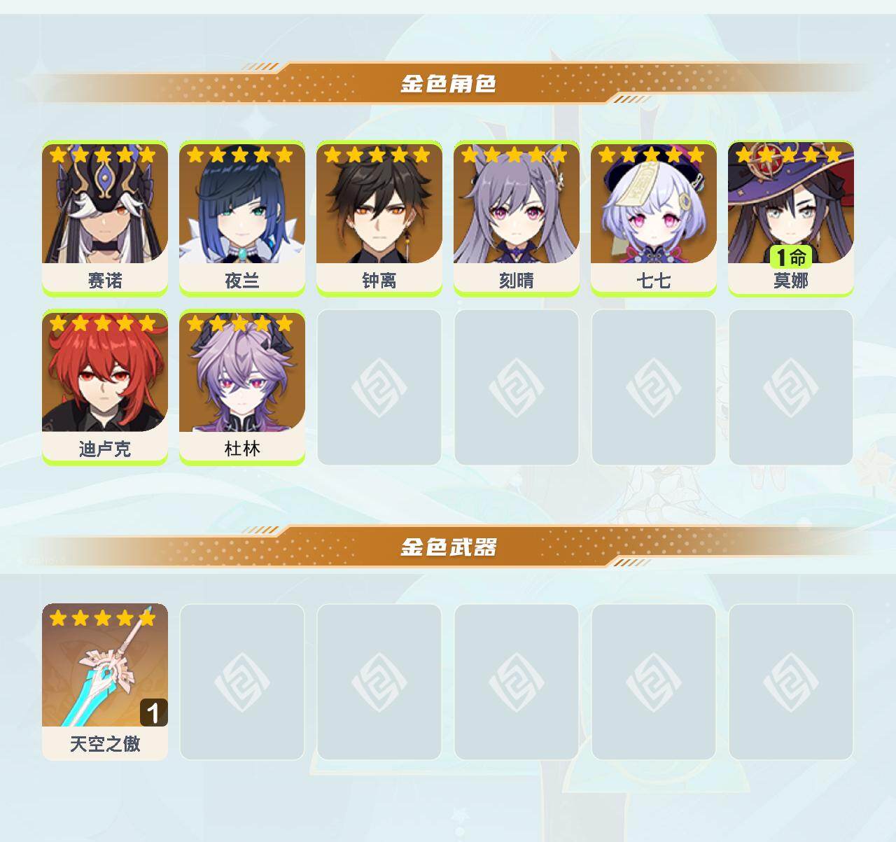 【ysx1632】54级/10黄/女主/8个五星角色/1个五星武器/0命夜兰/0命钟离/0命杜林/0命刻晴/1命莫娜/0命迪卢克/0命赛诺/0命七七/精1天空之傲