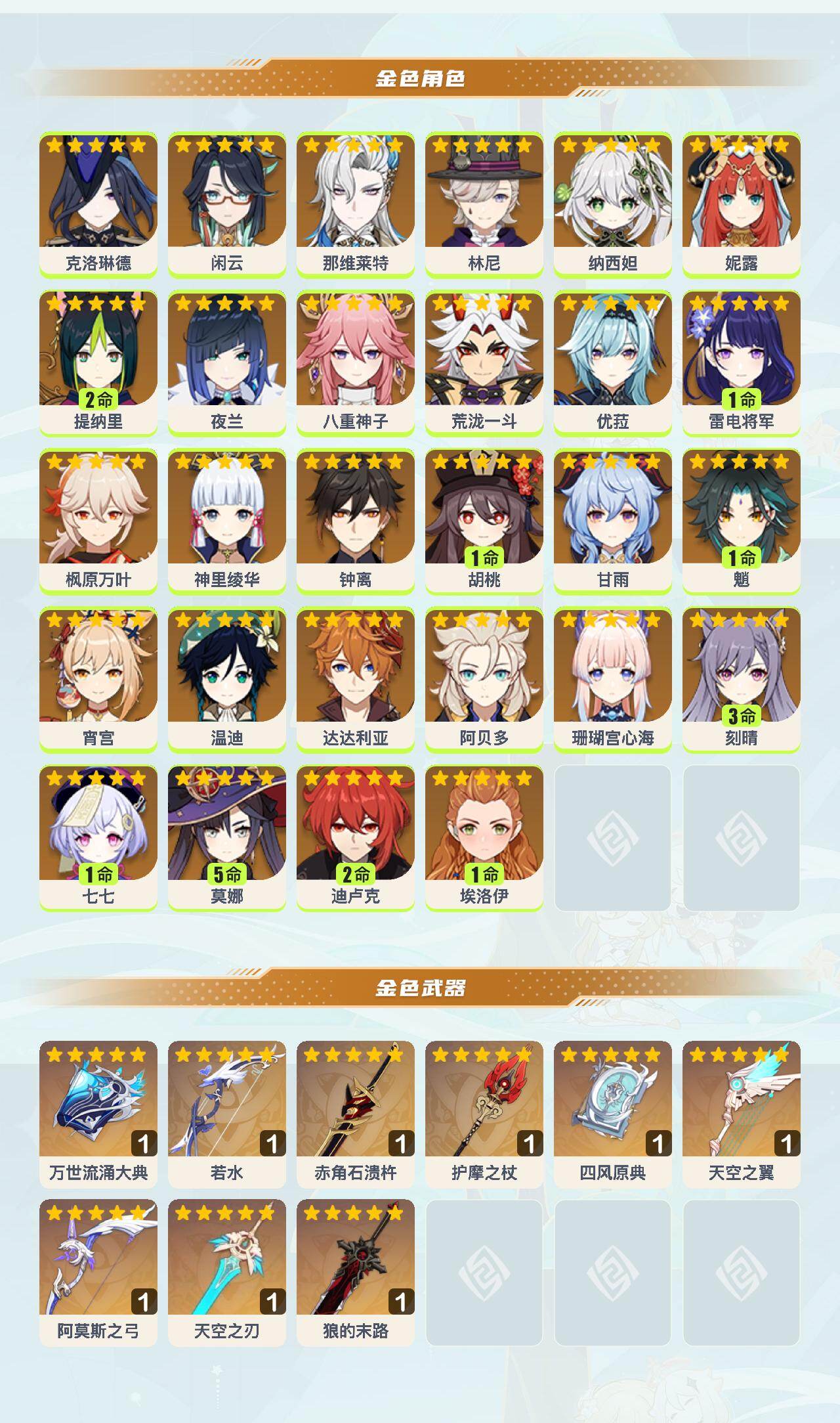 【ysn2305】60级/55黄/女主/28个五星角色/11个五星武器/0命荒泷一斗/0命钟离/0命阿贝多/0命枫原万叶/1命魈/0命甘雨/0命神里绫华/1命雷电将军/0命纳西妲/0命那维莱特/0命妮露/0命夜兰/0命达达利亚/1命胡桃/2命迪卢克/0命温迪/0命八重神子/2命提纳里/0命珊瑚宫心海/0命闲云/1命七七/5命莫娜/0命林尼/0命宵宫/0命优菈/3命刻晴/0命埃洛伊/0命克洛琳德/精1若水/精1阿莫斯之弓/精1万世流涌大典/精1护摩之杖/精1赤角石溃杵/精1天空之刃/精1四风原典/精1狼的末路/精1天空之翼