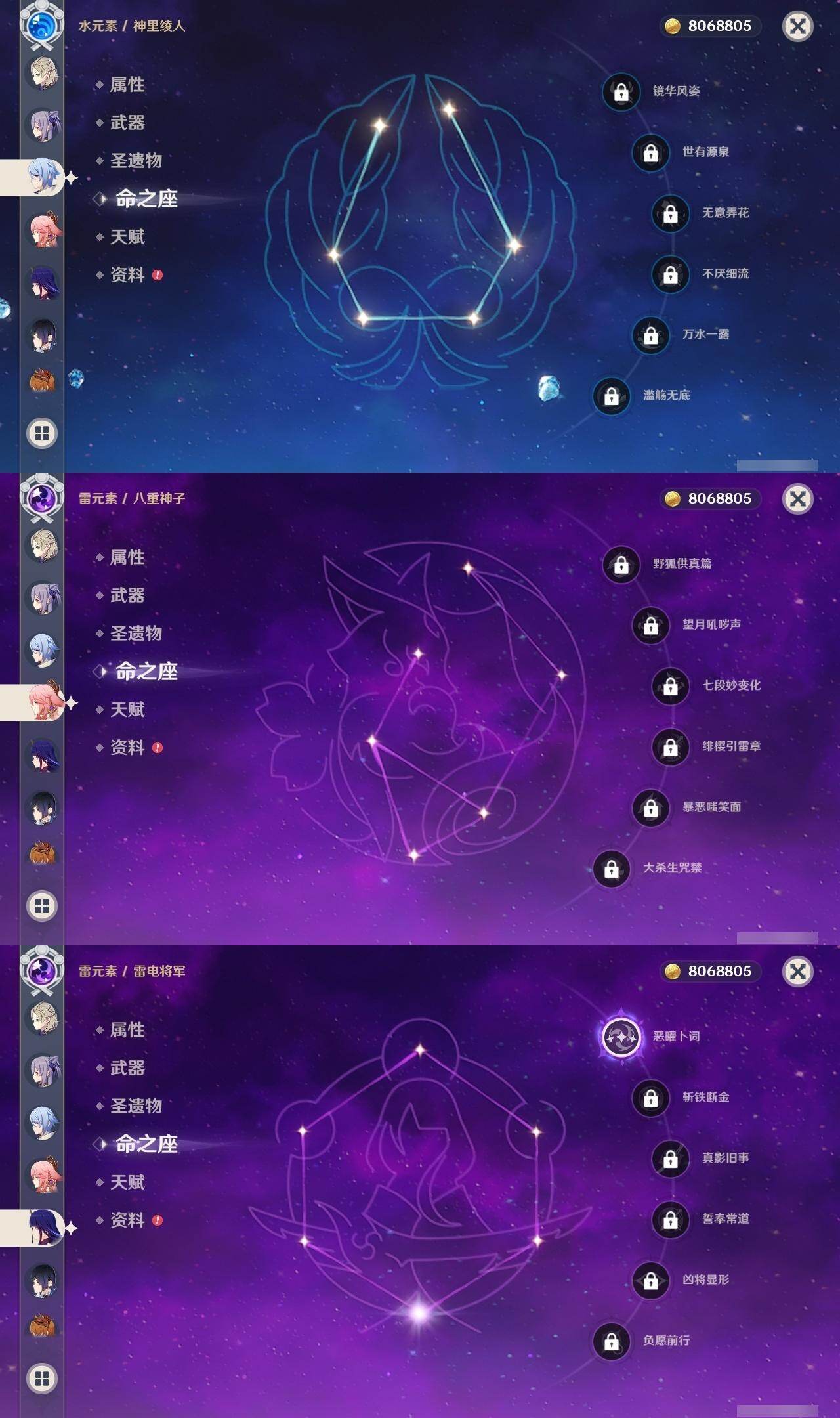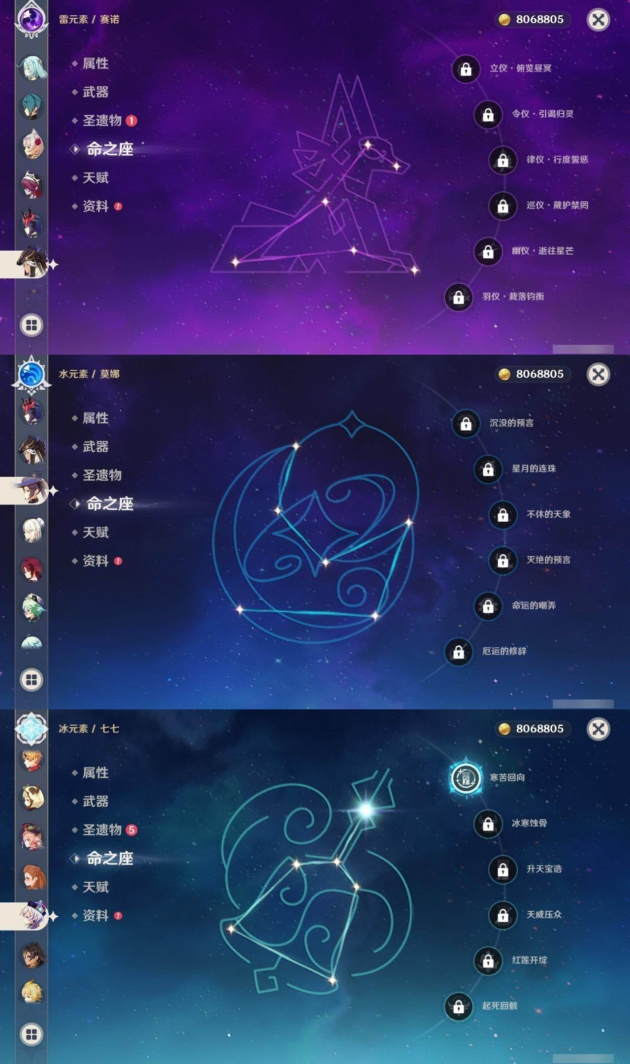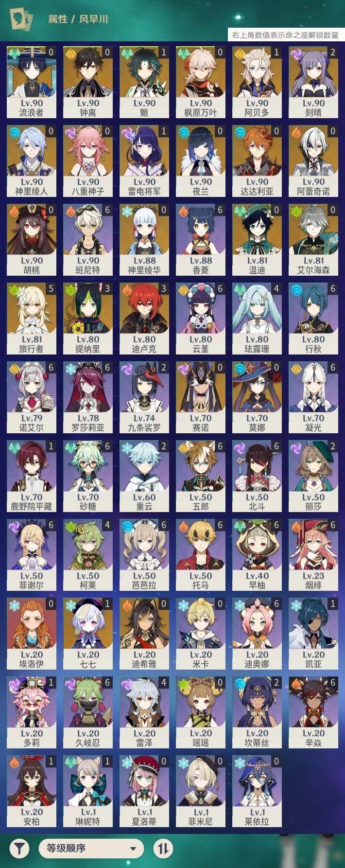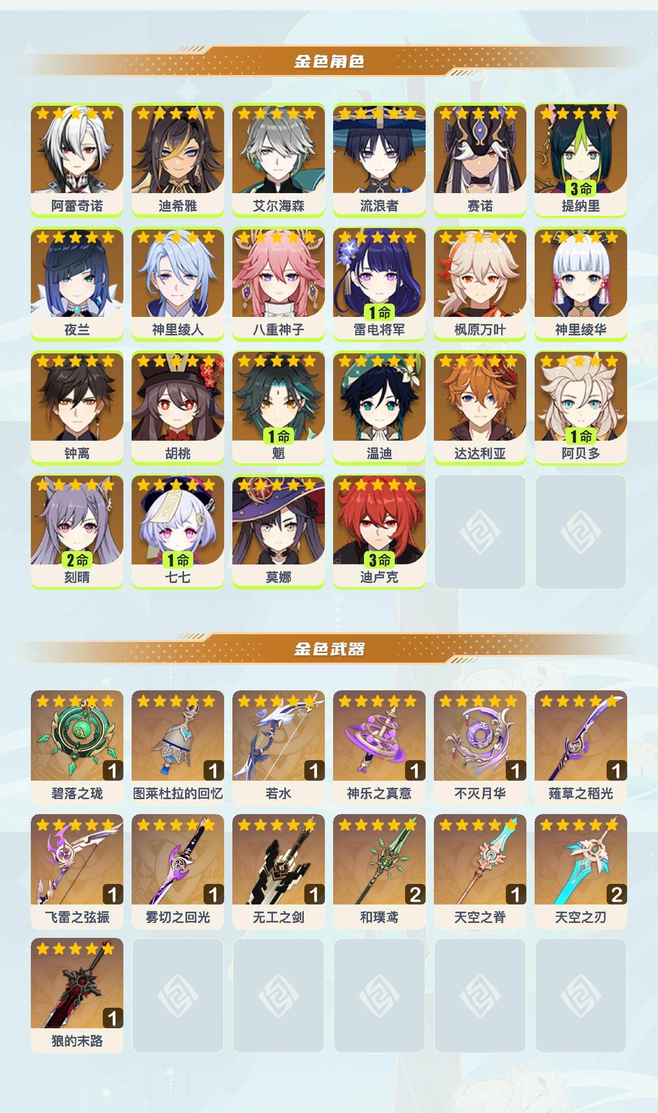 59级/51黄/女主/22个五星角色/15个五星武器 0命阿蕾奇诺0命迪希雅0命艾尔海森0命流浪者0命赛诺3命提纳里0命夜兰0命神里绫人0命八重神子1命雷电将军0命枫原万叶0命神里绫华0命钟离0命胡桃1命魈0命温迪0命达达利亚1命阿贝多2命刻晴1命七七0命莫娜3命迪卢克精1碧落之珑精1图莱杜拉的回忆精1若水精1神乐之真意精1不灭月华精1薙草之稻光精1飞雷之弦振精1雾切之回光精1无工之剑精2和璞鸢精1天空之脊精2天空之刃精1狼的末路