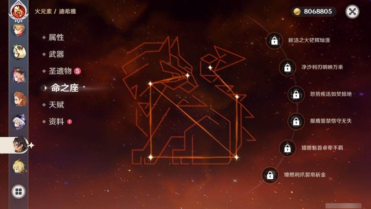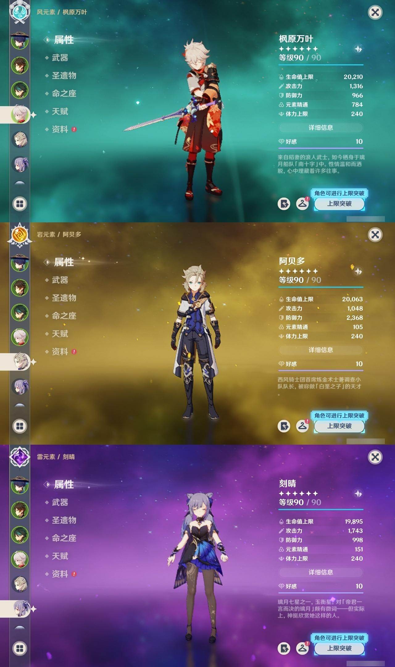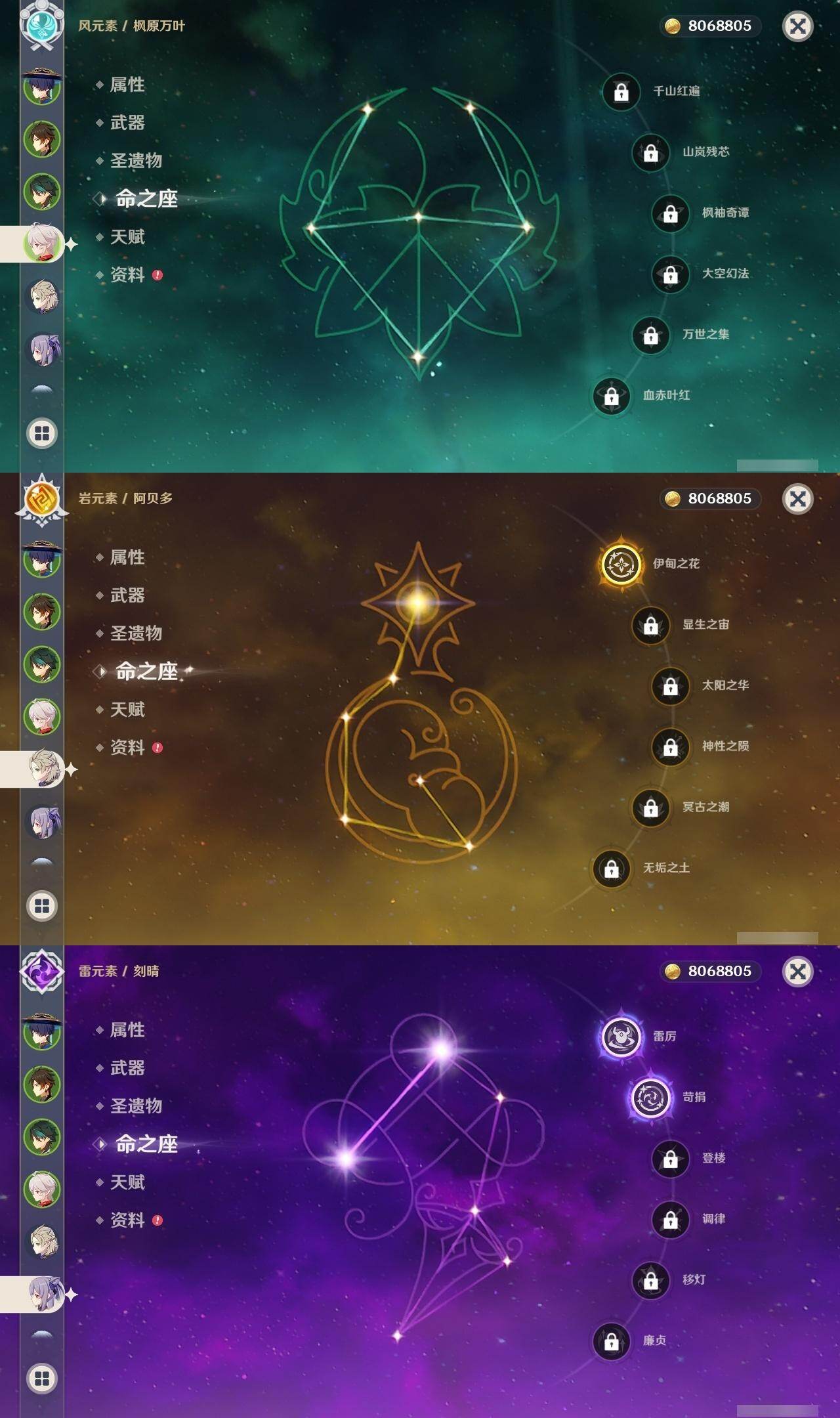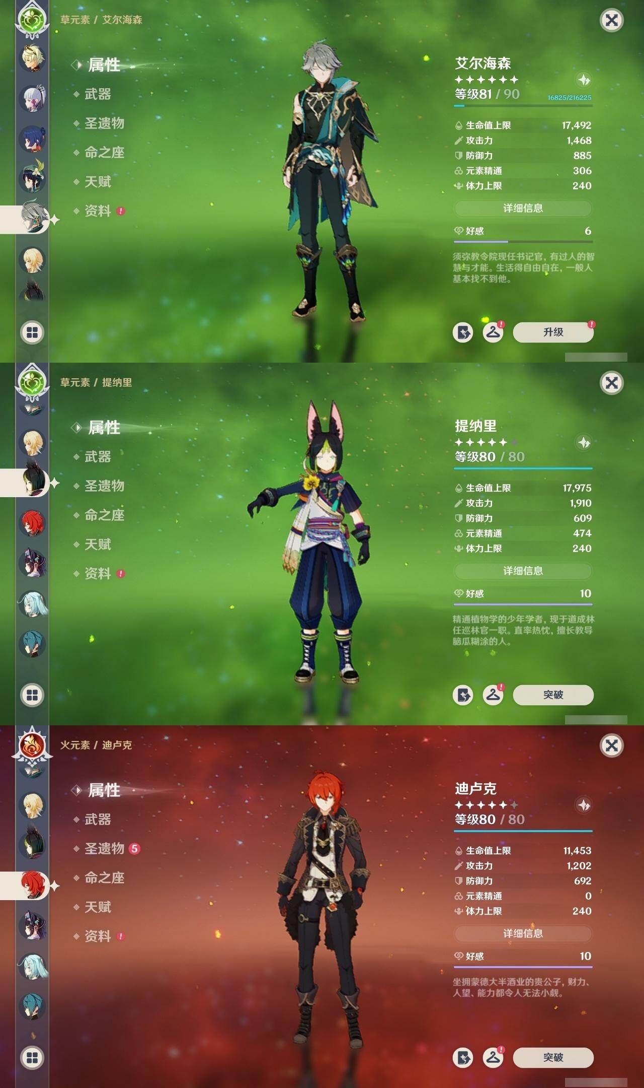 59级/51黄/女主/22个五星角色/15个五星武器 0命阿蕾奇诺0命迪希雅0命艾尔海森0命流浪者0命赛诺3命提纳里0命夜兰0命神里绫人0命八重神子1命雷电将军0命枫原万叶0命神里绫华0命钟离0命胡桃1命魈0命温迪0命达达利亚1命阿贝多2命刻晴1命七七0命莫娜3命迪卢克精1碧落之珑精1图莱杜拉的回忆精1若水精1神乐之真意精1不灭月华精1薙草之稻光精1飞雷之弦振精1雾切之回光精1无工之剑精2和璞鸢精1天空之脊精2天空之刃精1狼的末路