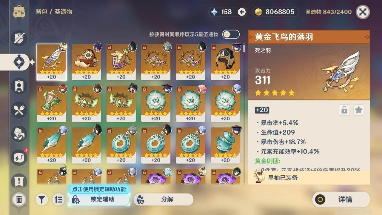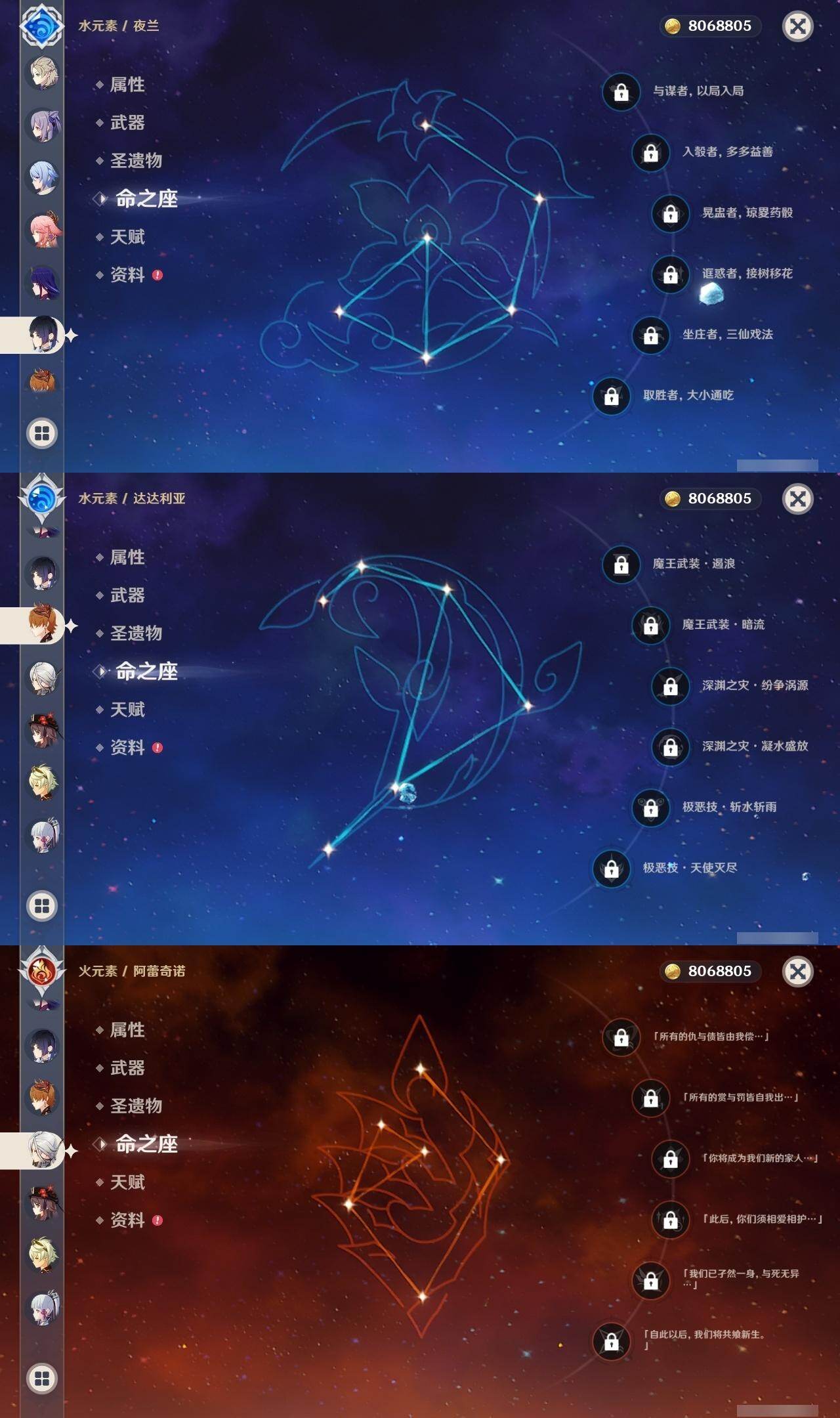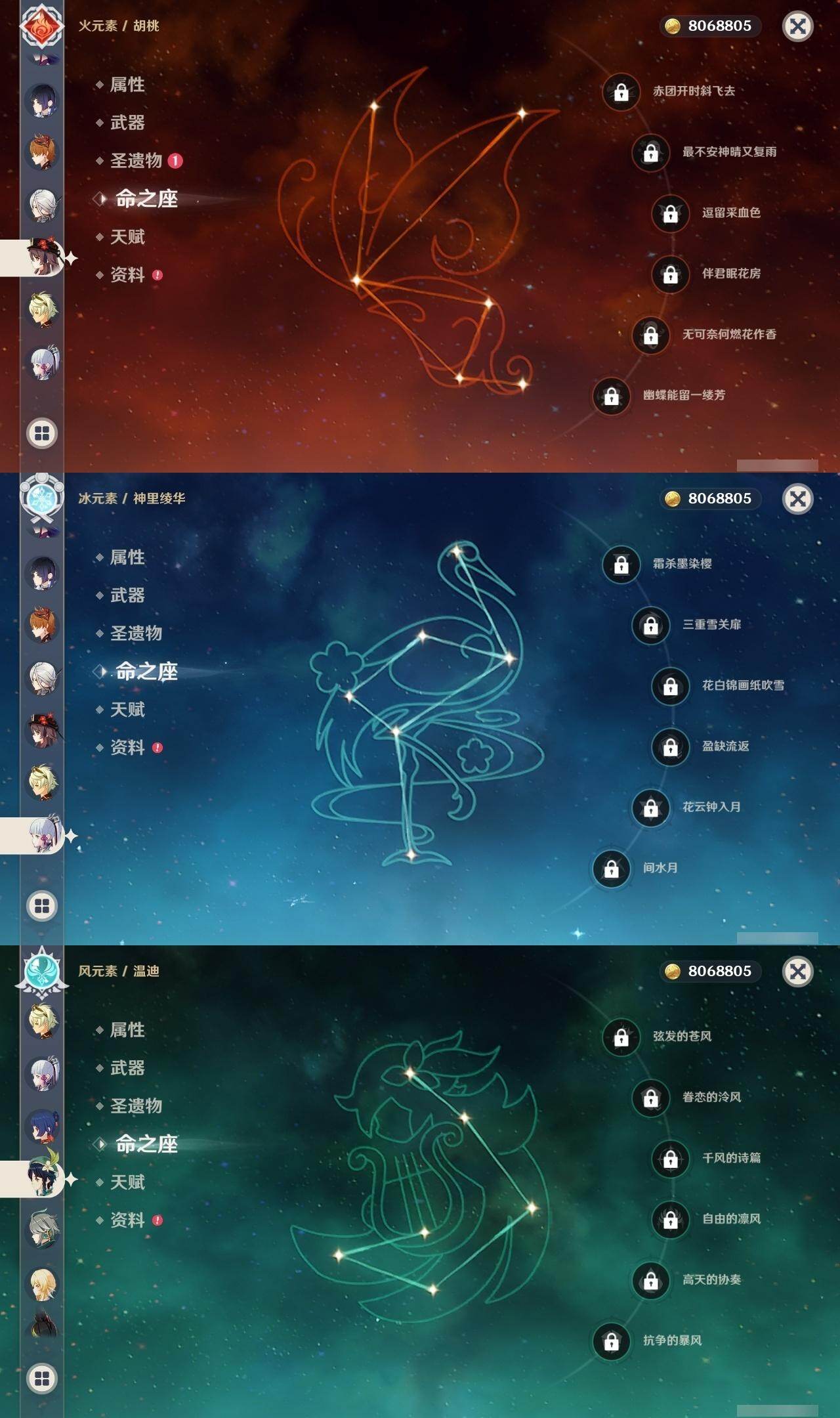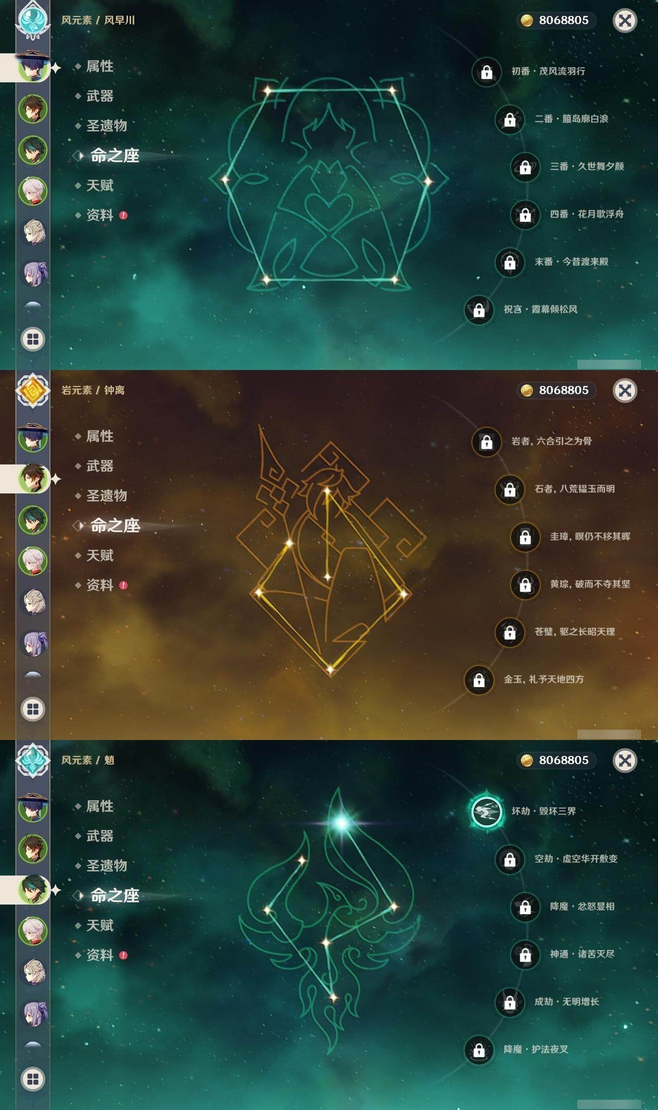 59级/51黄/女主/22个五星角色/15个五星武器 0命阿蕾奇诺0命迪希雅0命艾尔海森0命流浪者0命赛诺3命提纳里0命夜兰0命神里绫人0命八重神子1命雷电将军0命枫原万叶0命神里绫华0命钟离0命胡桃1命魈0命温迪0命达达利亚1命阿贝多2命刻晴1命七七0命莫娜3命迪卢克精1碧落之珑精1图莱杜拉的回忆精1若水精1神乐之真意精1不灭月华精1薙草之稻光精1飞雷之弦振精1雾切之回光精1无工之剑精2和璞鸢精1天空之脊精2天空之刃精1狼的末路