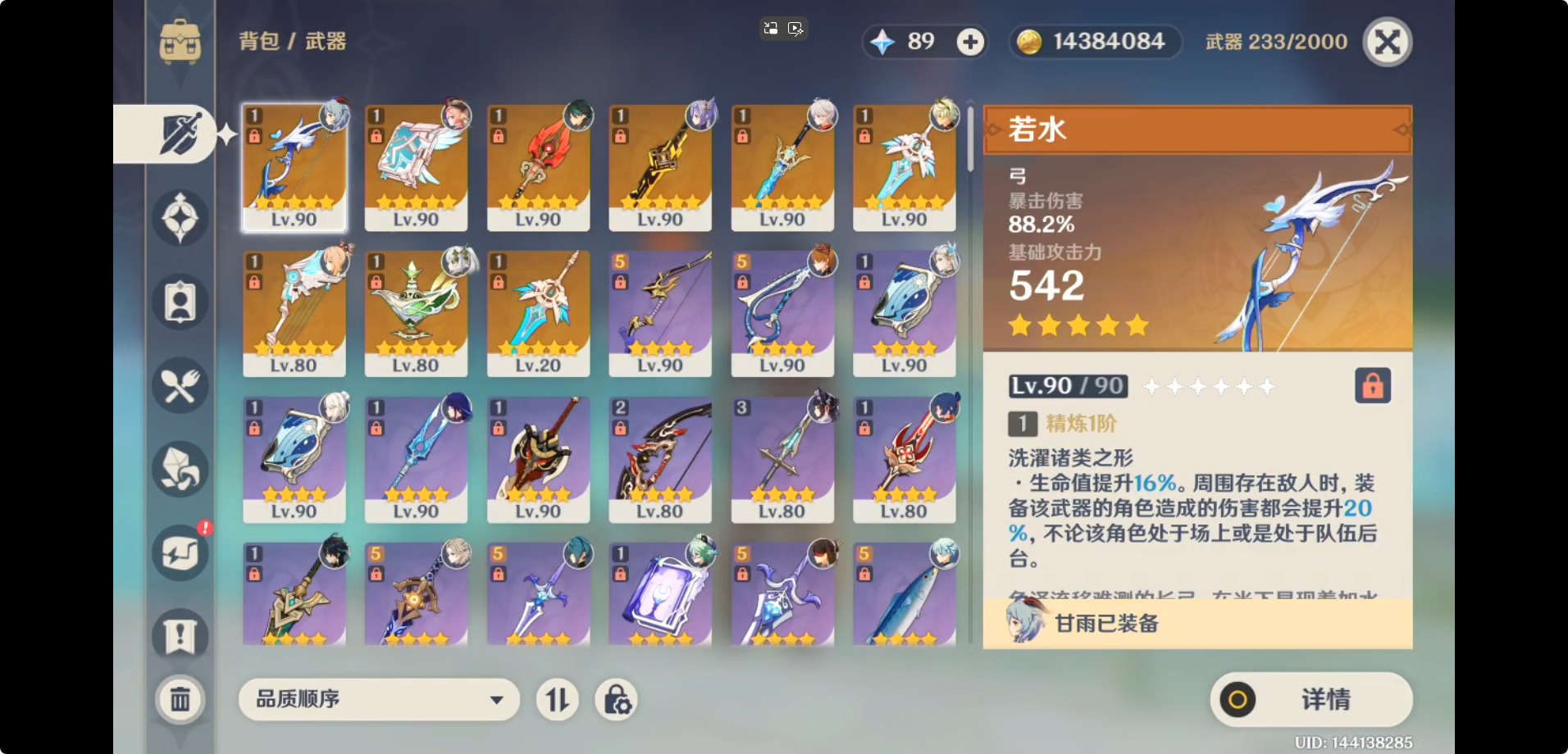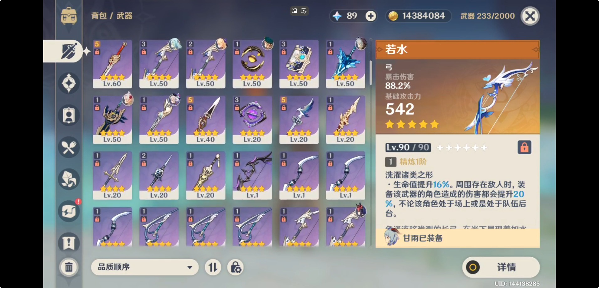 [16406266]【邮箱】未绑定 【总黄数】36 【冒险等级】58 【3命金色角色】三命迪希雅三命刻晴 【2命金色角色】二命七七 【1命金色角色】一命迪卢克一命琴 【0命金色角色】基尼奇那维莱特纳西妲雷电将军宵宫枫原万叶魈甘雨阿贝多钟离达达利亚莫娜 【2精武器】千夜浮梦苍古自由之誓护摩之杖斫峰之刃天空之卷天空之翼天空之刃 【1精武器】若水