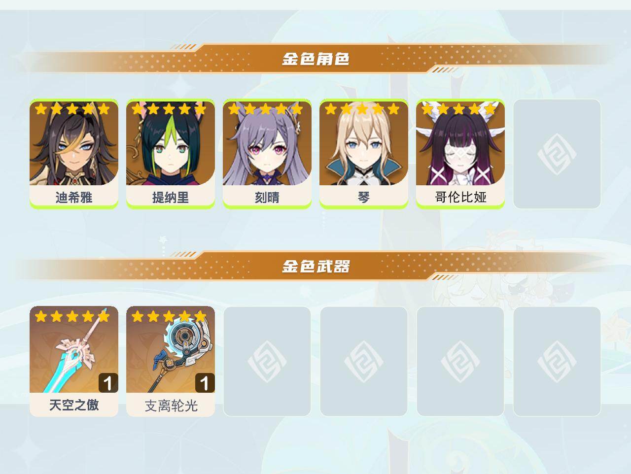 【ysyt768】53级/7黄/女主/5个五星角色/2个五星武器/0命哥伦比娅/0命刻晴/0命迪希雅/0命提纳里/0命琴/精1支离轮光/精1天空之傲