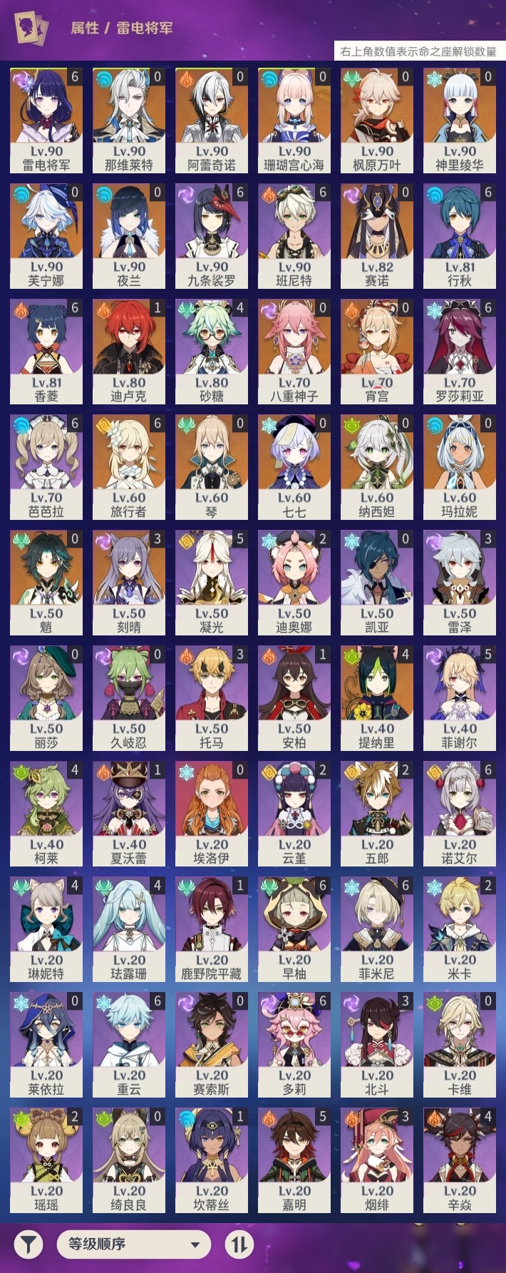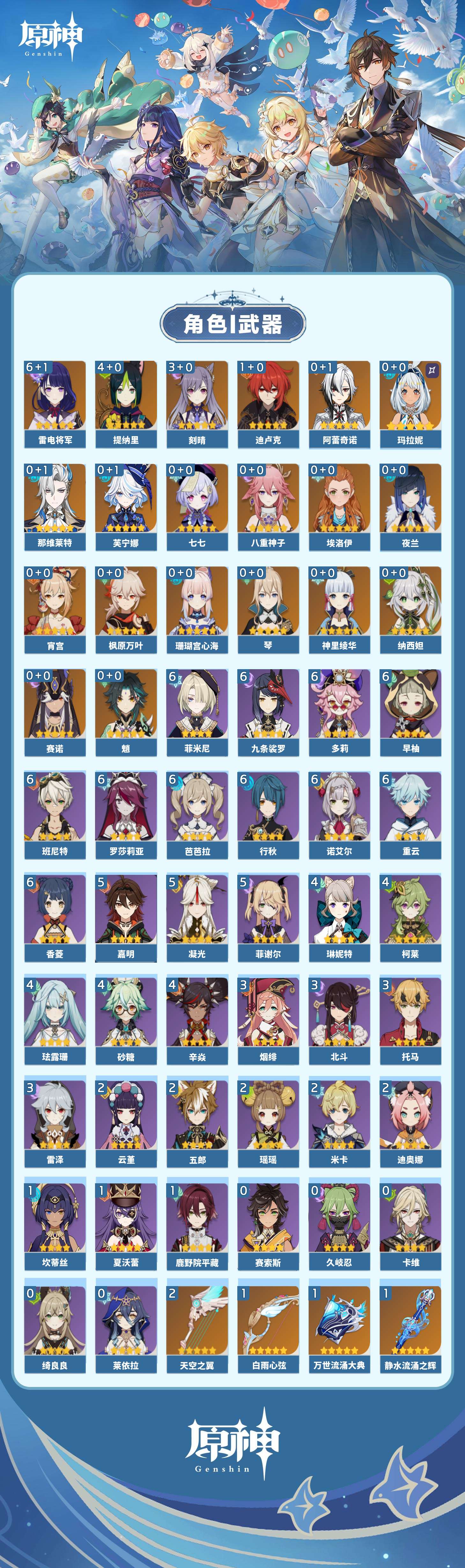 【原神】【lyys11448】冒险等级:58,五星数量:28,五星角色:雷电将军 6命提纳里 4命刻晴 3命迪卢克 1命七七玛拉妮琴珊瑚宫心海神里绫华宵宫八重神子那维莱特夜兰芙宁娜赛诺阿蕾奇诺纳西妲枫原万叶魈__五星武器:天空之翼 2精万世流涌大典静水流涌之辉赤月之形四风原典天空之卷薙草之稻光白雨心弦__四星角色:班尼特 6命行秋 6命九条裟罗 6命香菱 6命多莉 6命芭芭拉 6命早柚 6命重云 6命诺艾尔 6命罗莎莉亚 6命菲米尼 6命凝光 5命菲谢尔 5命嘉明 5命珐露珊 4命砂糖 4命柯莱 4命辛焱 4命琳妮特 4命托马 3命烟绯 3命雷泽 3命北斗 3命迪奥娜 2命瑶瑶 2命米卡 2命云堇 2命五郎 2命鹿野院平藏 1命坎蒂丝 1命夏沃蕾 1命埃洛伊久岐忍绮良良莱依拉卡维赛索斯