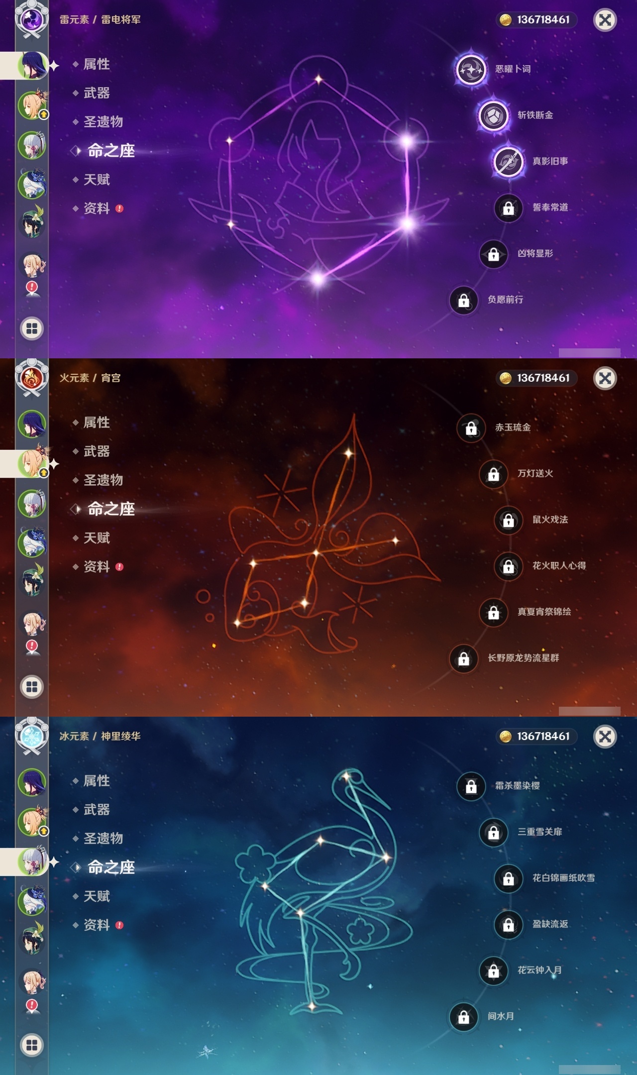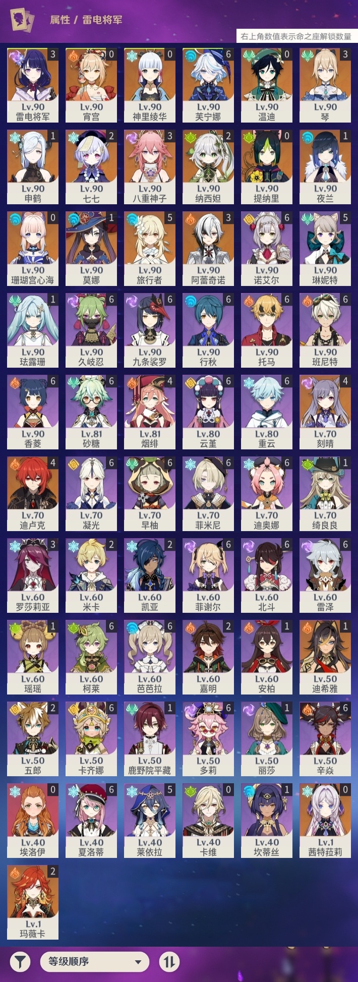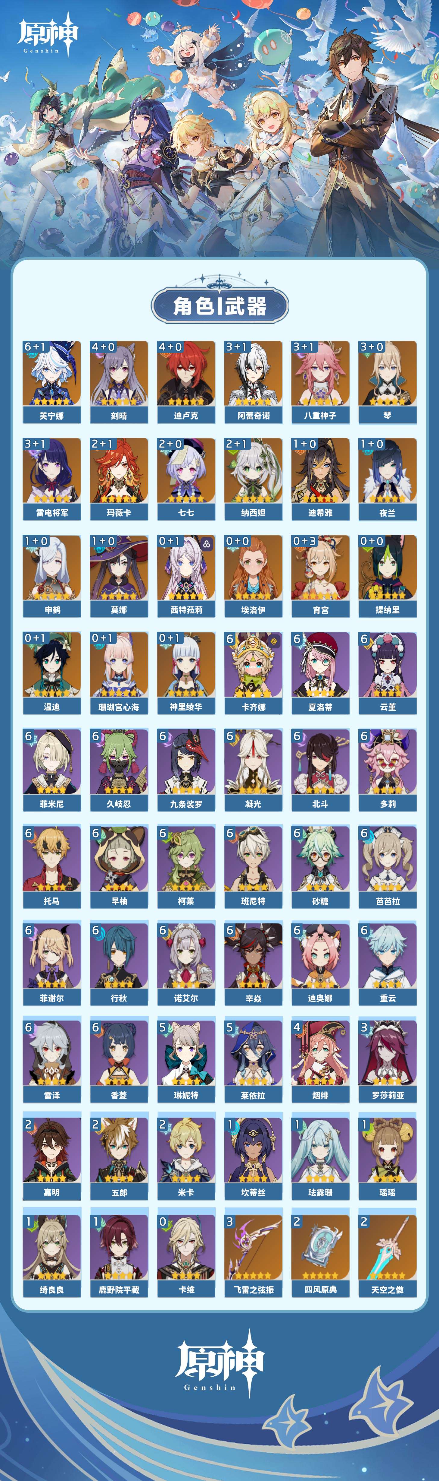 【原神】【lyys11462】冒险等级:60,五星数量:40,五星角色:芙宁娜 6命迪卢克 4命刻晴 4命阿蕾奇诺 3命雷电将军 3命琴 3命八重神子 3命玛薇卡 2命七七 2命纳西妲 2命迪希雅 1命莫娜 1命申鹤 1命夜兰 1命珊瑚宫心海神里绫华温迪茜特菈莉宵宫提纳里__五星武器:飞雷之弦振 3精四风原典 2精天空之傲 2精碧落之珑祭星者之望焚曜千阳静水流涌之辉赤月之形不灭月华风鹰剑和璞鸢护摩之杖天空之翼雾切之回光薙草之稻光终末嗟叹之诗斫峰之刃神乐之真意千夜浮梦__四星角色:卡齐娜 6命班尼特 6命行秋 6命九条裟罗 6命香菱 6命久岐忍 6命凝光 6命迪奥娜 6命砂糖 6命多莉 6命柯莱 6命芭芭拉 6命云堇 6命早柚 6命托马 6命重云 6命辛焱 6命诺艾尔 6命雷泽 6命菲谢尔 6命北斗 6命菲米尼 6命夏洛蒂 6命莱依拉 5命琳妮特 5命烟绯 4命罗莎莉亚 3命米卡 2命五郎 2命嘉明 2命鹿野院平藏 1命珐露珊 1命绮良良 1命瑶瑶 1命坎蒂丝 1命埃洛伊卡维