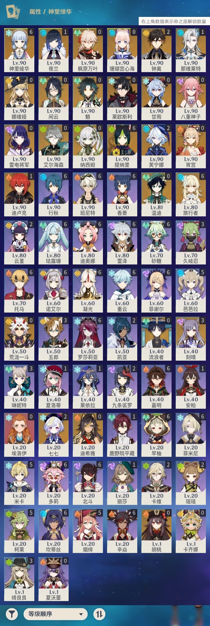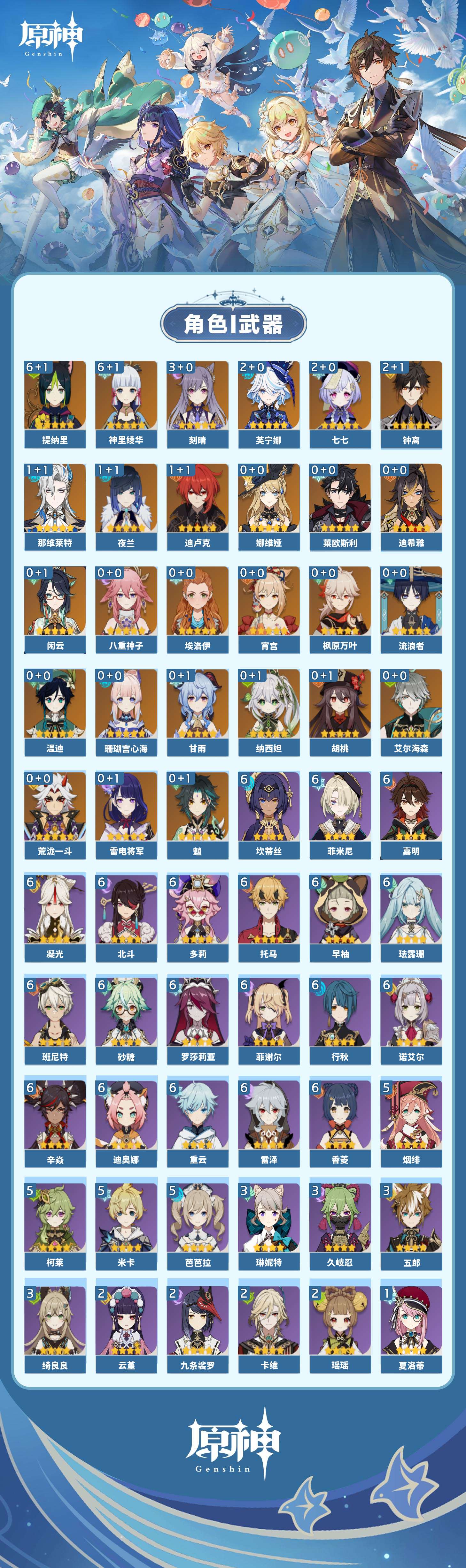 【原神】【lyys11453】冒险等级:60,五星数量:43,五星角色:神里绫华 6命提纳里 6命刻晴 3命芙宁娜 2命七七 2命钟离 2命那维莱特 1命迪卢克 1命夜兰 1命珊瑚宫心海温迪宵宫迪希雅荒泷一斗八重神子莱欧斯利娜维娅闲云纳西妲艾尔海森流浪者枫原万叶甘雨魈胡桃雷电将军__五星武器:碧落之珑万世流涌大典鹤鸣余音阿莫斯之弓和璞鸢护摩之杖狼的末路松籁响起之时天空之刃天空之翼雾切之回光薙草之稻光贯虹之槊若水猎人之径千夜浮梦__四星角色:班尼特 6命行秋 6命香菱 6命珐露珊 6命凝光 6命迪奥娜 6命砂糖 6命坎蒂丝 6命多莉 6命早柚 6命托马 6命重云 6命辛焱 6命诺艾尔 6命罗莎莉亚 6命雷泽 6命菲谢尔 6命北斗 6命菲米尼 6命嘉明 6命米卡 5命柯莱 5命芭芭拉 5命烟绯 5命久岐忍 3命绮良良 3命五郎 3命琳妮特 3命九条裟罗 2命瑶瑶 2命卡维 2命云堇 2命鹿野院平藏 1命莱依拉 1命夏洛蒂 1命埃洛伊卡齐娜夏沃蕾
