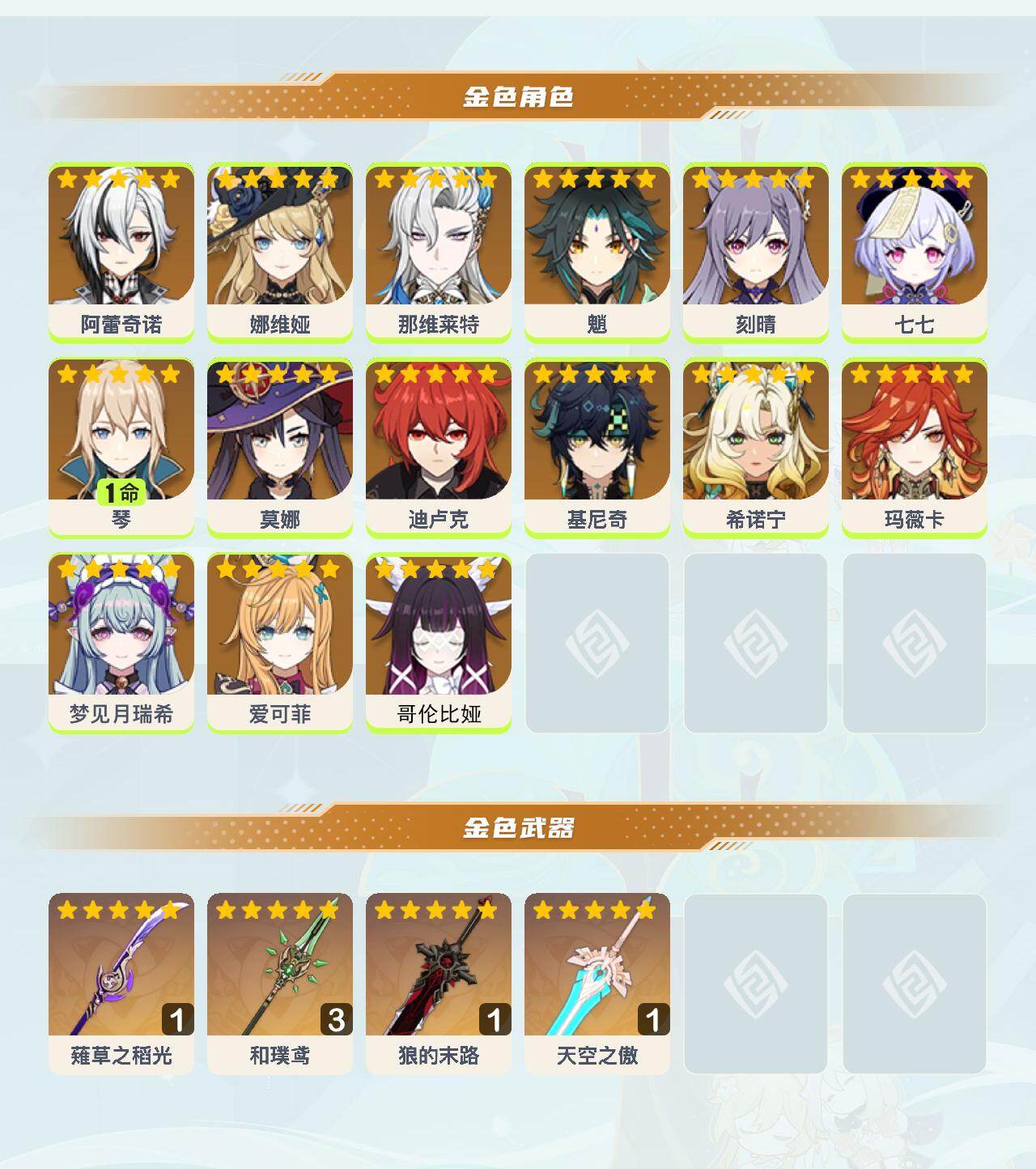 【ysx1637】157级/25黄/女主/15个五星角色/5个五星武器/0命玛薇卡/0命爱可菲/0命希诺宁/0命阿蕾奇诺/0命娜维娅/0命那维莱特/0命魈/0命基尼奇/0命莫娜/0命迪卢克/0命刻晴/0命梦见月瑞希/1命琴/0命七七/0命哥伦比娅/精3和璞鸢/精1天空之傲/精1薙草之稻光/精1狼的末路