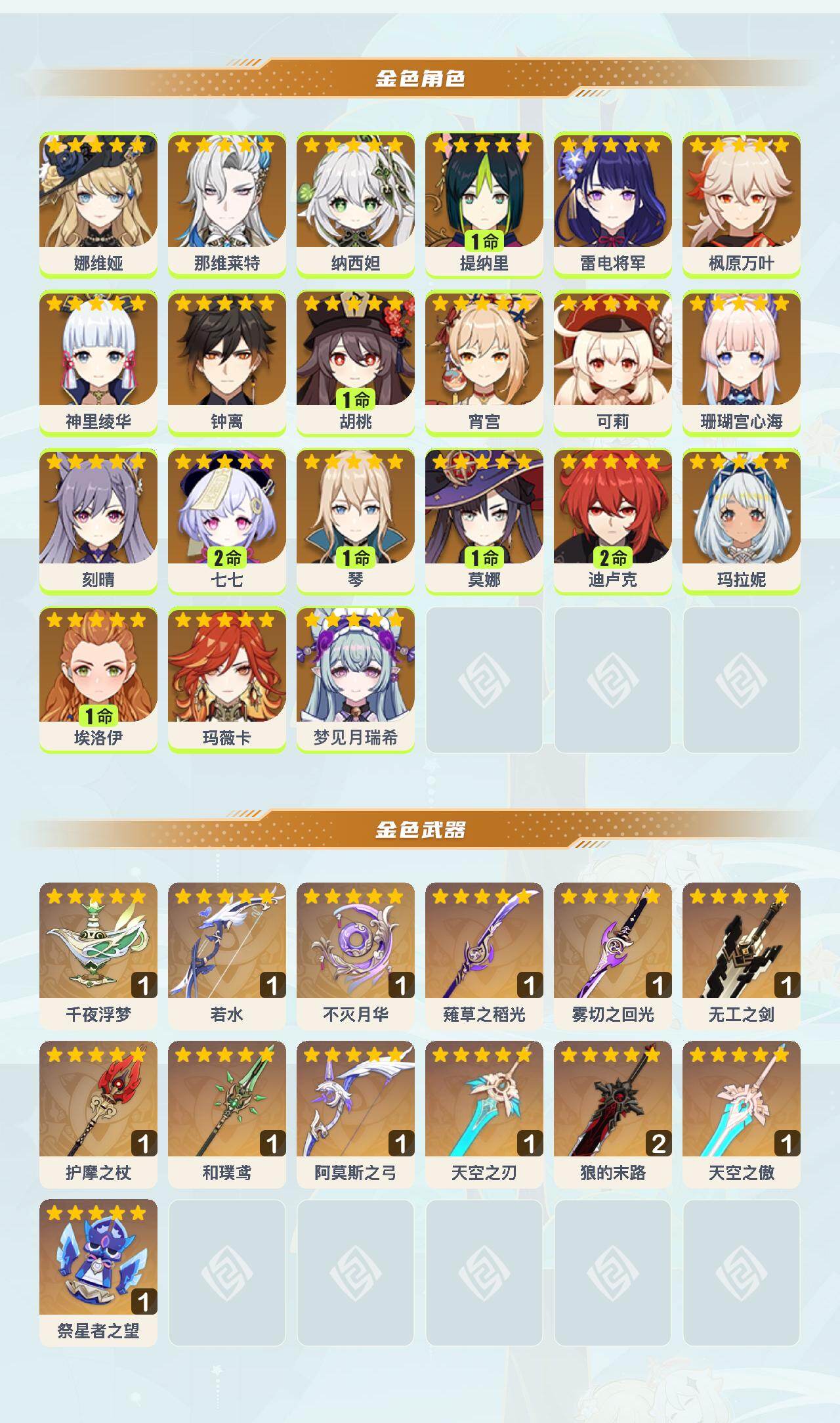【ysx1633】59级/46黄/女主/21个五星角色/16个五星武器/1命提纳里/0命雷电将军/0命玛薇卡/0命钟离/0命娜维娅/0命枫原万叶/0命神里绫华/0命刻晴/0命纳西妲/0命宵宫/1命胡桃/0命可莉/2命迪卢克/0命珊瑚宫心海/1命琴/1命莫娜/2命七七/0命那维莱特/0命玛拉妮/0命埃洛伊/0命梦见月瑞希/精1阿莫斯之弓/精1千夜浮梦/精1薙草之稻光/精1和璞鸢/精1护摩之杖/精1雾切之回光/精1若水/精2狼的末路/精1不灭月华/精1无工之剑/精1天空之刃/精1祭星者之望/精1天空之傲