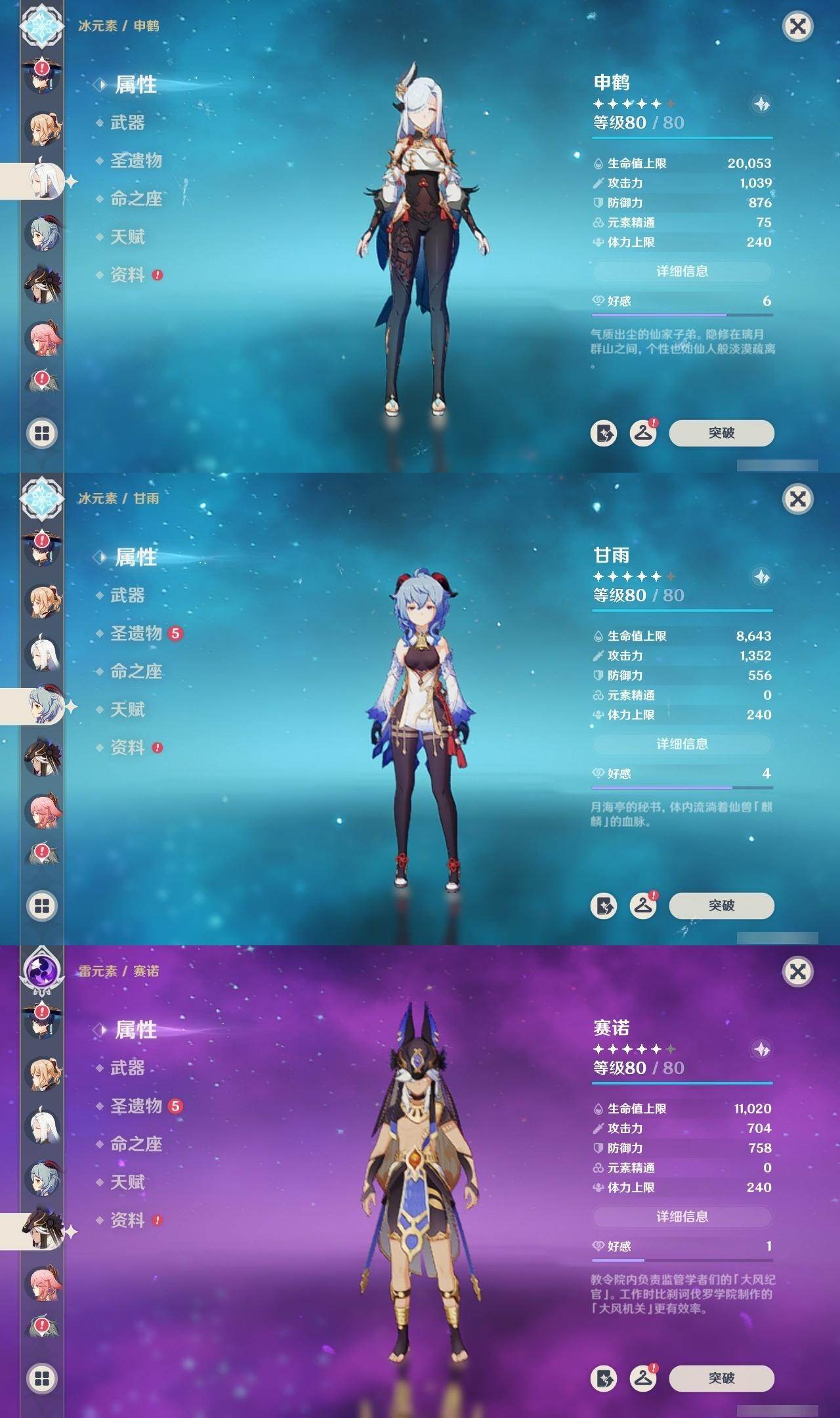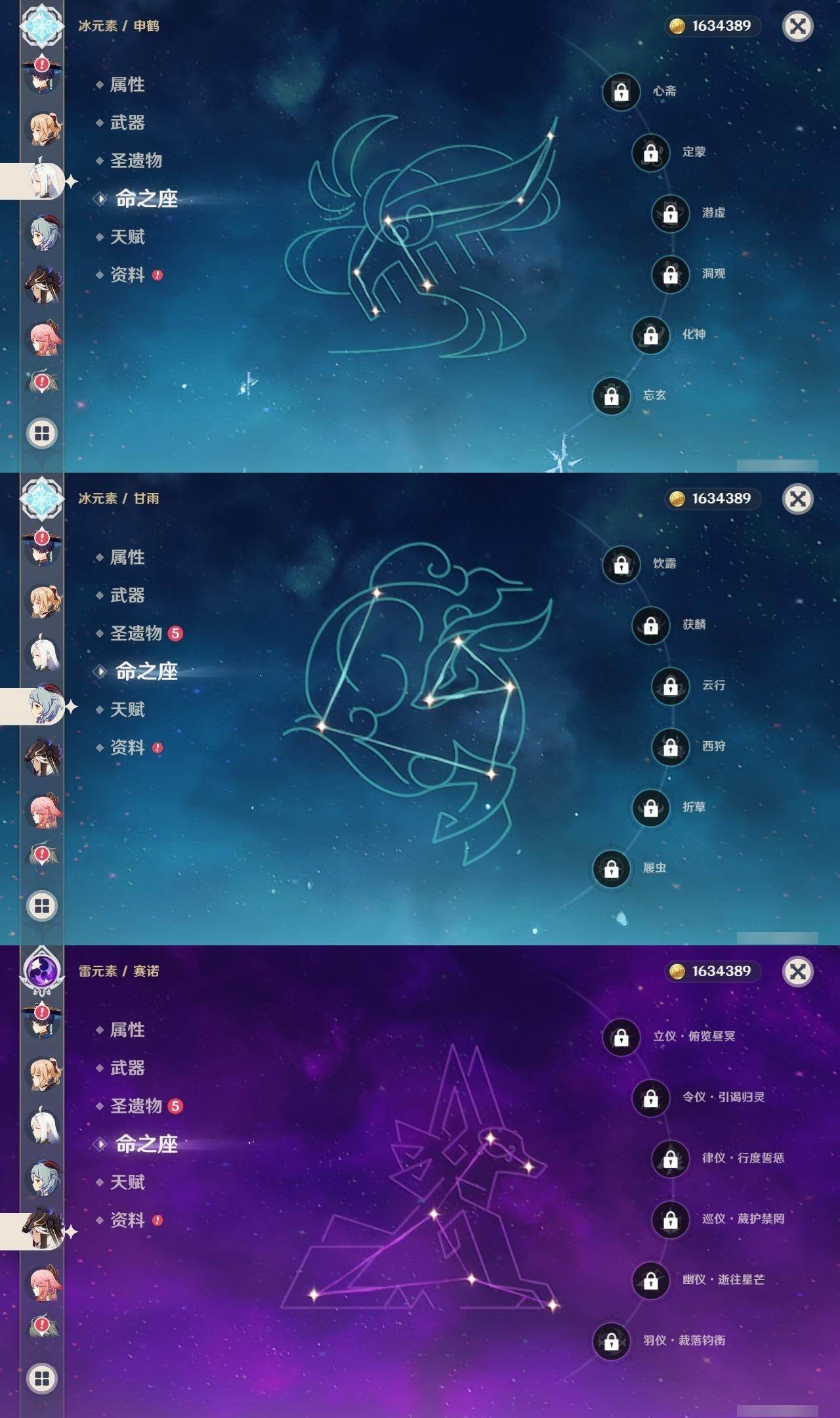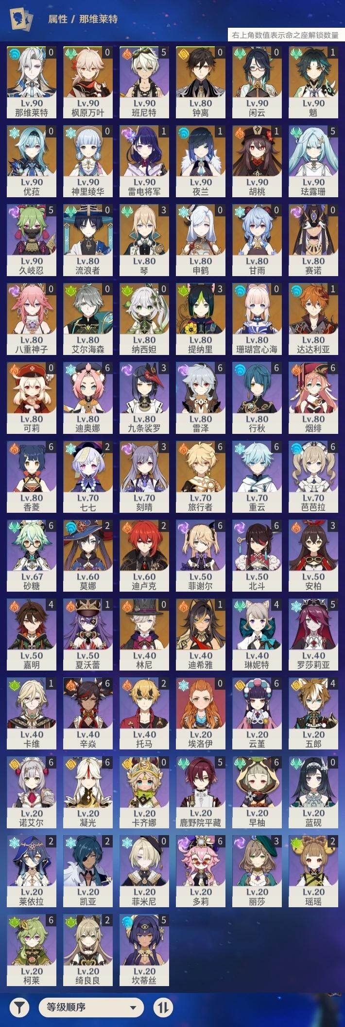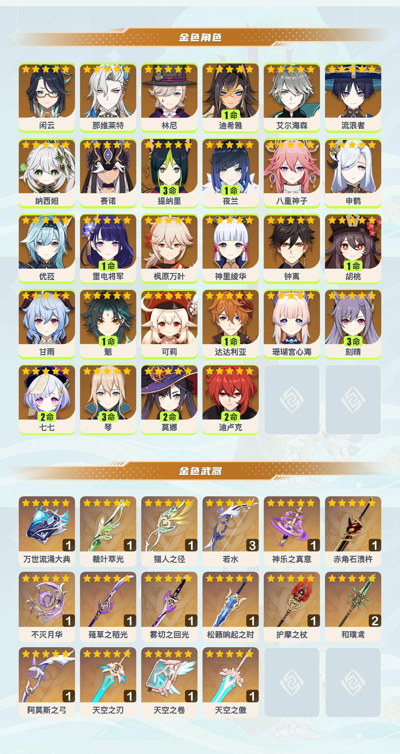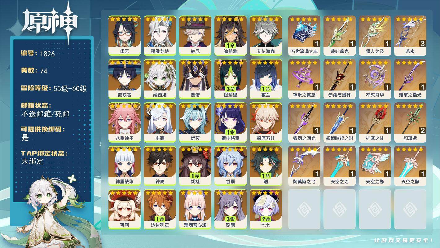 [16422282]59级/74黄/男主/28个五星角色/22个五星武器 0命闲云0命那维莱特0命林尼1命迪希雅0命艾尔海森0命流浪者0命纳西妲0命赛诺3命提纳里1命夜兰0命八重神子0命申鹤0命优菈1命雷电将军0命枫原万叶0命神里绫华0命钟离1命胡桃0命甘雨1命魈0命可莉1命达达利亚0命珊瑚宫心海3命刻晴2命七七3命琴2命莫娜2命迪卢克精1万世流涌大典精1裁叶萃光精1猎人之径精3若水精1神乐之真意精1赤角石溃杵精1不灭月华精1薙草之稻光精1雾切之回光精1松籁响起之时精1护摩之杖精2和璞鸢精1阿莫斯之弓精1天空之刃精1天空之卷精1天空之傲