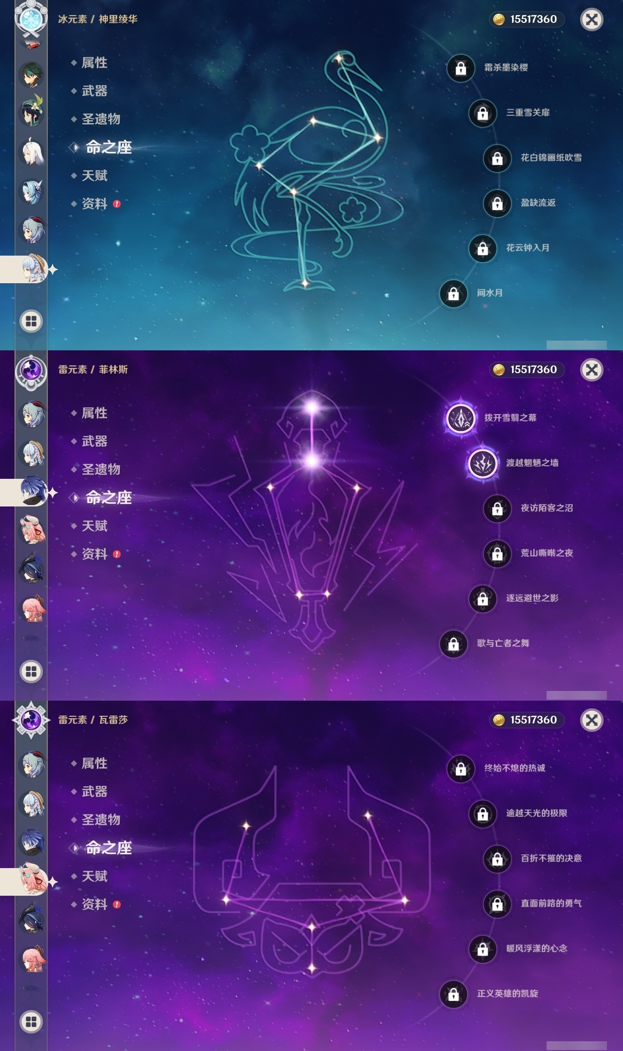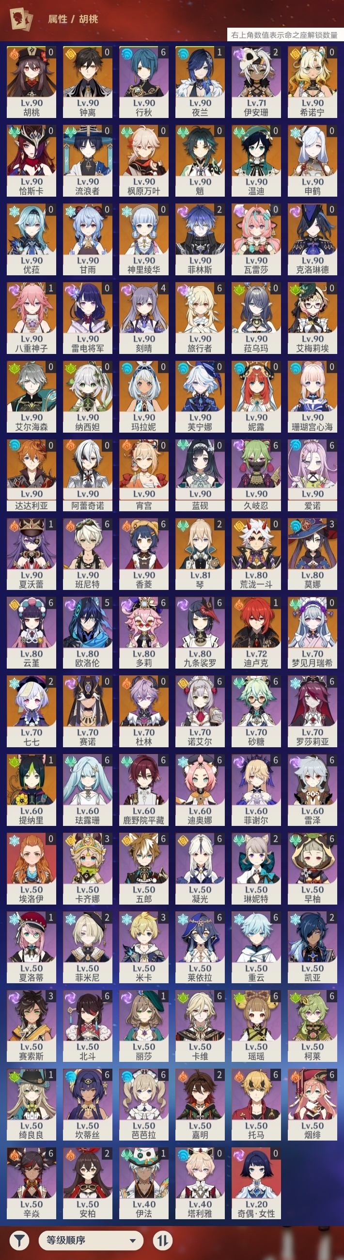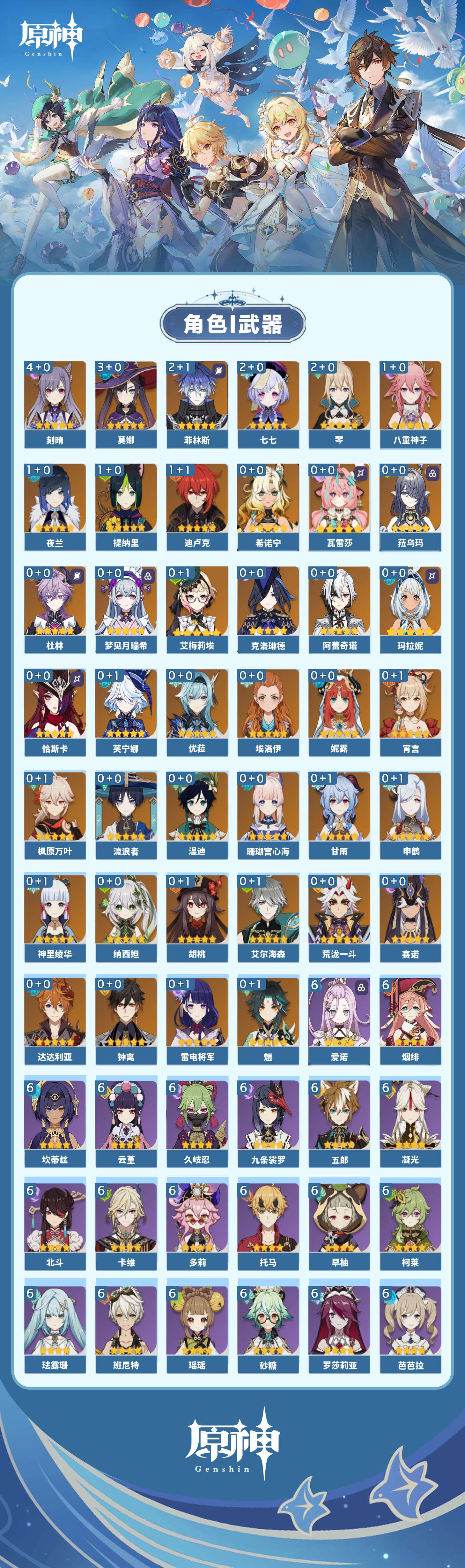 【原神】【lyys11485】冒险等级:60,五星数量:63,五星角色:刻晴 4命莫娜 3命菲林斯 2命七七 2命琴 2命迪卢克 1命八重神子 1命夜兰 1命提纳里 1命艾梅莉埃玛拉妮珊瑚宫心海希诺宁神里绫华温迪恰斯卡宵宫优菈钟离荒泷一斗达达利亚梦见月瑞希申鹤瓦雷莎芙宁娜赛诺阿蕾奇诺妮露纳西妲菈乌玛艾尔海森流浪者杜林枫原万叶甘雨魈胡桃克洛琳德雷电将军__五星武器:柔灯挽歌碧落之珑苇海信标最初的大魔术静水流涌之辉血染荒城裁叶萃光阿莫斯之弓苍古自由之誓飞雷之弦振风鹰剑和璞鸢护摩之杖狼的末路天空之脊天空之刃天空之翼无工之剑雾切之回光薙草之稻光斫峰之刃息灾__四星角色:班尼特 6命行秋 6命九条裟罗 6命香菱 6命久岐忍 6命鹿野院平藏 6命珐露珊 6命凝光 6命迪奥娜 6命砂糖 6命瑶瑶 6命莱依拉 6命坎蒂丝 6命多莉 6命柯莱 6命卡维 6命芭芭拉 6命云堇 6命早柚 6命托马 6命五郎 6命烟绯 6命重云 6命辛焱 6命诺艾尔 6命罗莎莉亚 6命雷泽 6命菲谢尔 6命北斗 6命爱诺 6命欧洛伦 5命卡齐娜 3命米卡 3命赛索斯 3命菲米尼 2命琳妮特 2命嘉明 2命伊安珊 2命绮良良 1命夏洛蒂 1命夏沃蕾 1命伊法 1命埃洛伊奇偶·女性蓝砚塔利雅
