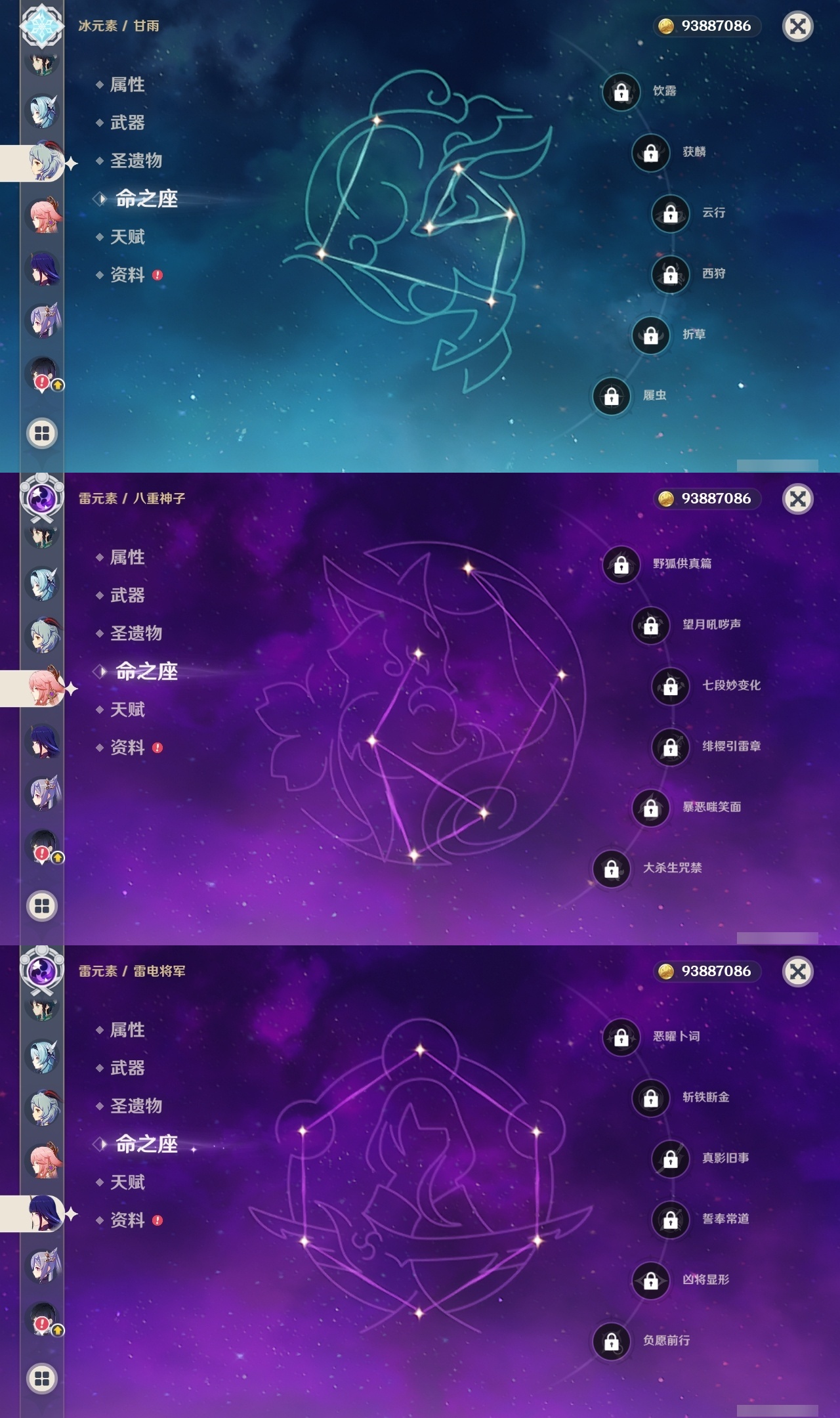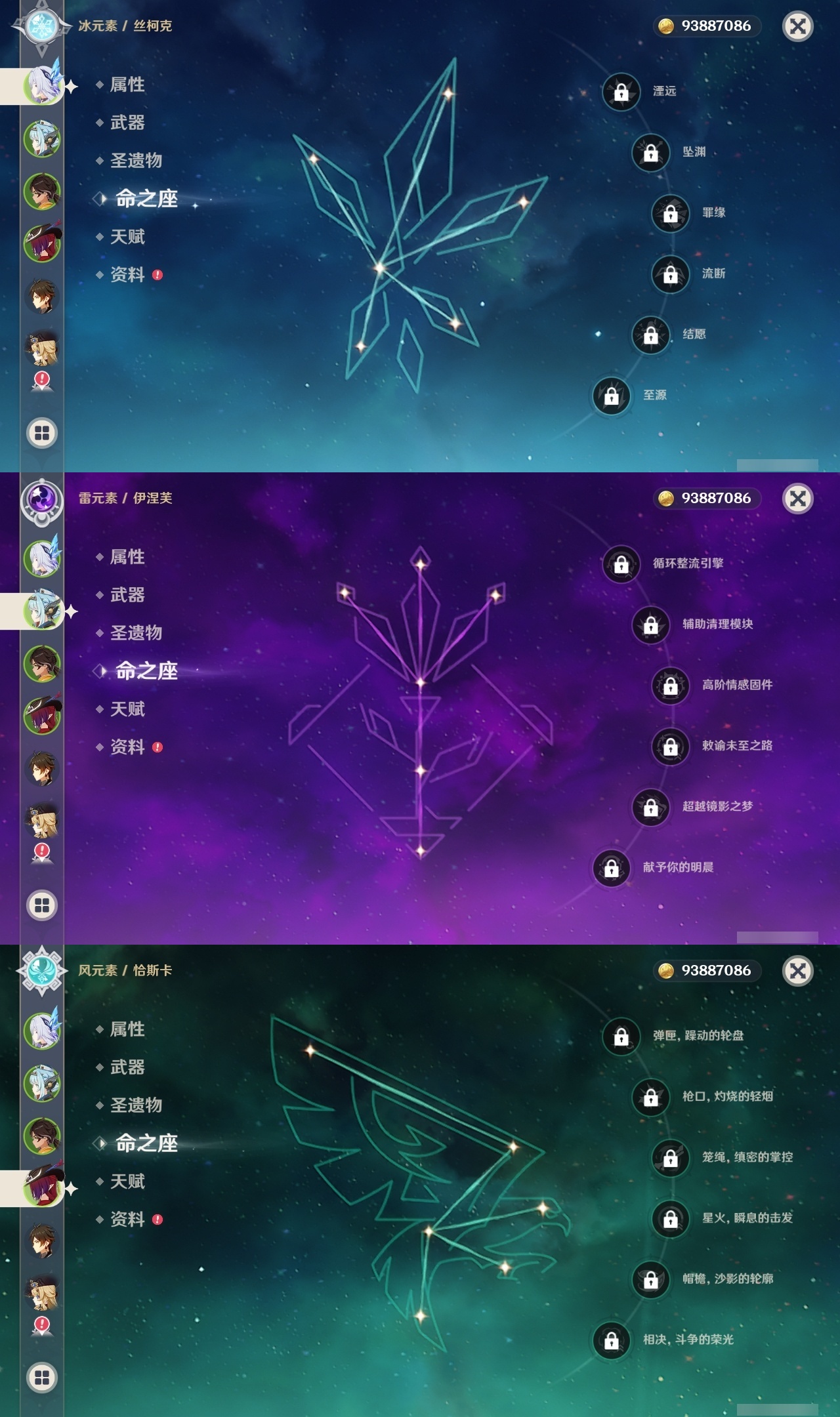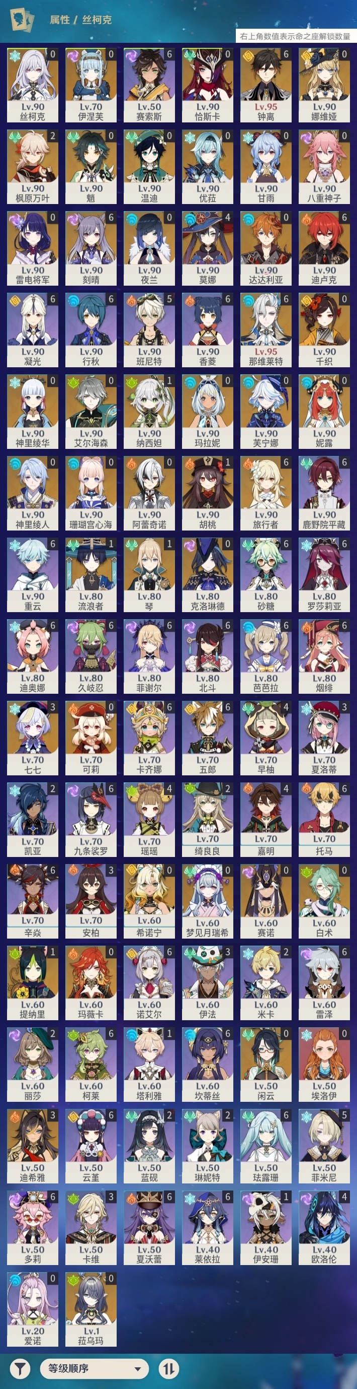【原神】满命,冒险等级:60,五星数量:71,五星角色:那维莱特 6命迪卢克 6命刻晴 6命钟离 6命莫娜 4命迪希雅 3命七七 3命枫原万叶 2命胡桃 1命琴 1命提纳里 1命纳西妲 1命流浪者 1命玛拉妮珊瑚宫心海希诺宁白术神里绫华温迪恰斯卡玛薇卡优菈达达利亚梦见月瑞希八重神子神里绫人夜兰芙宁娜娜维娅闲云千织赛诺阿蕾奇诺丝柯克妮露伊涅芙菈乌玛艾尔海森甘雨魈克洛琳德可莉雷电将军__五星武器:风鹰剑 3精护摩之杖 3精狼的末路 3精天空之翼 3精星鹫赤羽 2精阿莫斯之弓 2精苍古自由之誓 2精天空之傲 2精天空之卷 2精若水 2精冲浪时光焚曜千阳万世流涌大典裁断图莱杜拉的回忆和璞鸢磐岩结绿松籁响起之时天空之脊天空之刃雾切之回光终末嗟叹之诗冬极白星息灾神乐之真意贯虹之槊赦罪__四星角色:卡齐娜 6命行秋 6命九条裟罗 6命香菱 6命久岐忍 6命鹿野院平藏 6命珐露珊 6命凝光 6命迪奥娜 6命砂糖 6命莱依拉 6命坎蒂丝 6命多莉 6命柯莱 6命芭芭拉 6命云堇 6命托马 6命五郎 6命烟绯 6命重云 6命辛焱 6命诺艾尔 6命罗莎莉亚 6命雷泽 6命菲谢尔 6命北斗 6命夏沃蕾 6命赛索斯 6命班尼特 5命菲米尼 5命瑶瑶 4命欧洛伦 4命早柚 4命嘉明 4命卡维 3命夏洛蒂 3命伊法 3命绮良良 2命米卡 2命蓝砚 2命琳妮特 2命伊安珊 1命塔利雅 1命埃洛伊爱诺