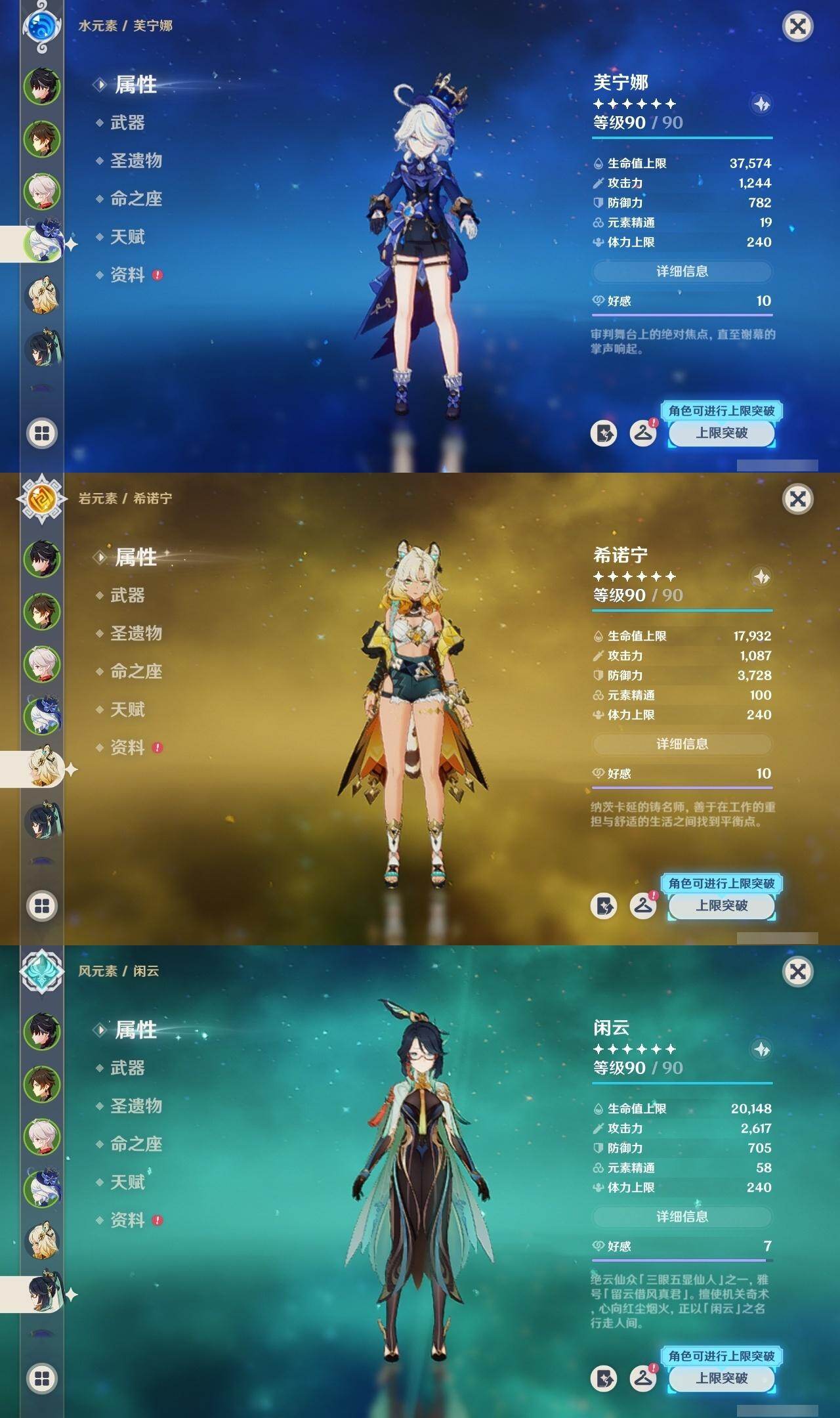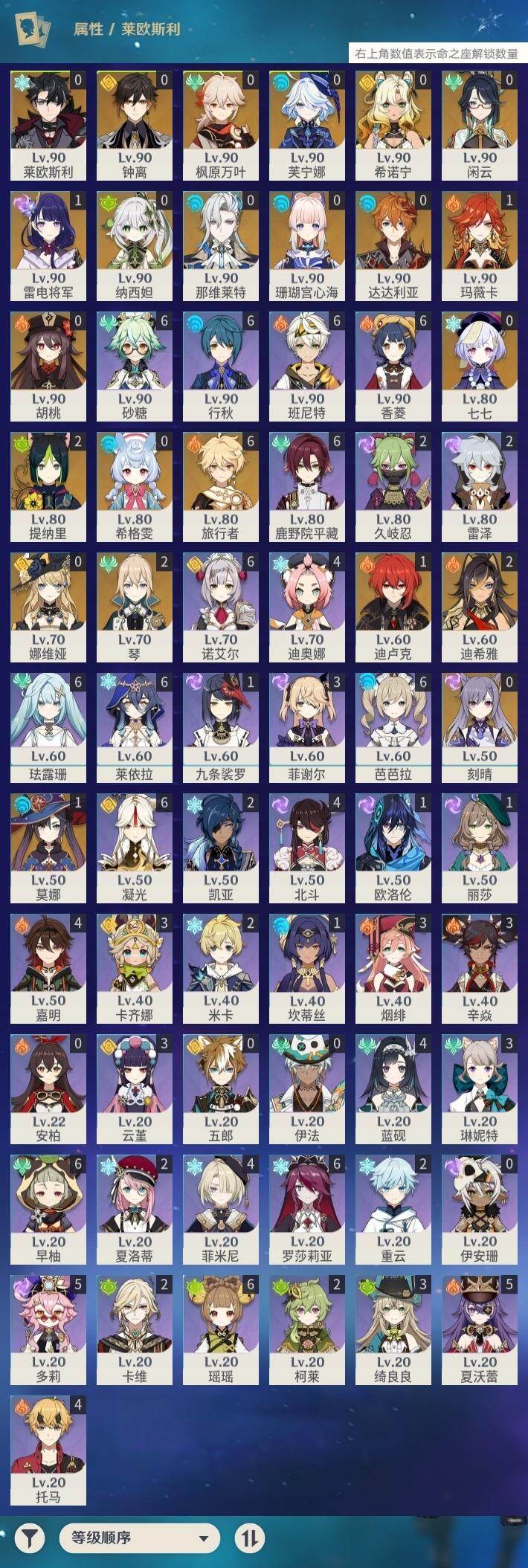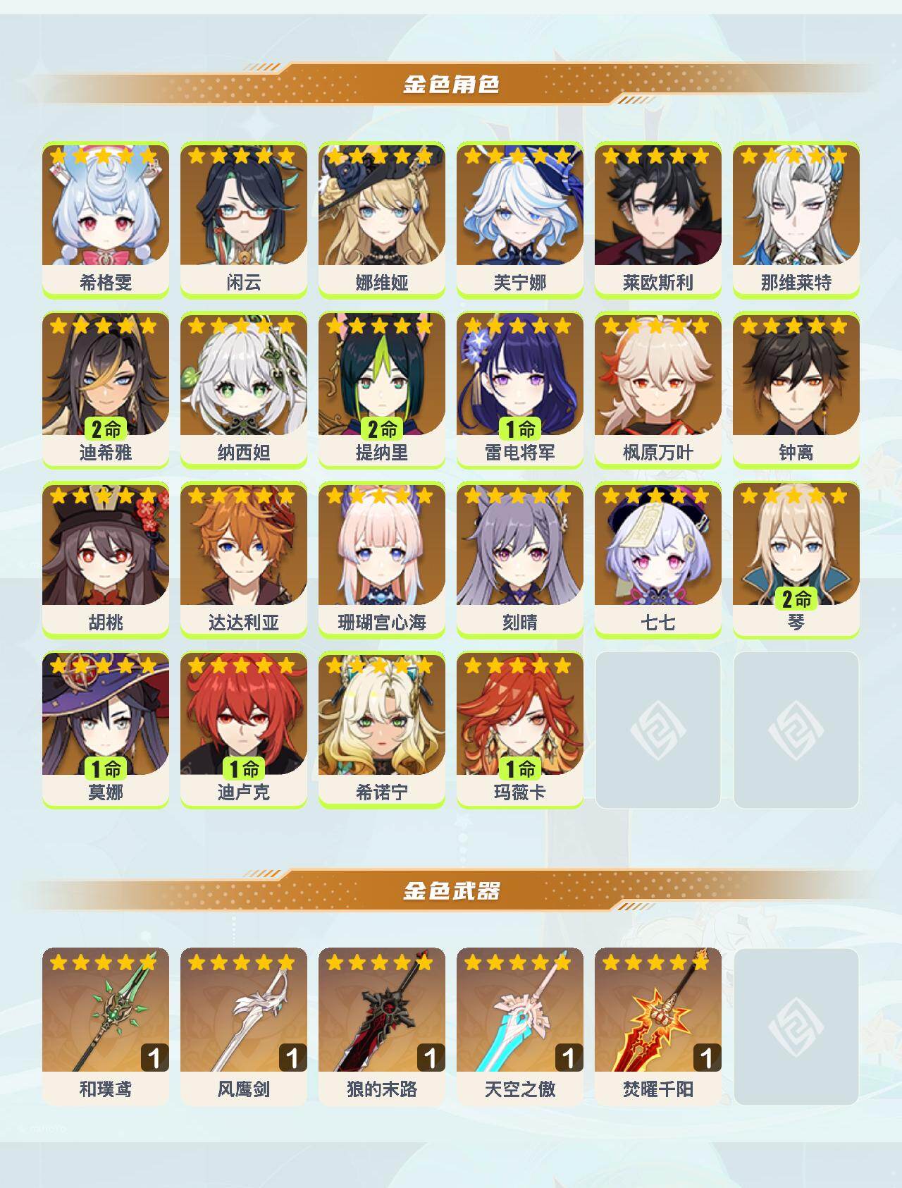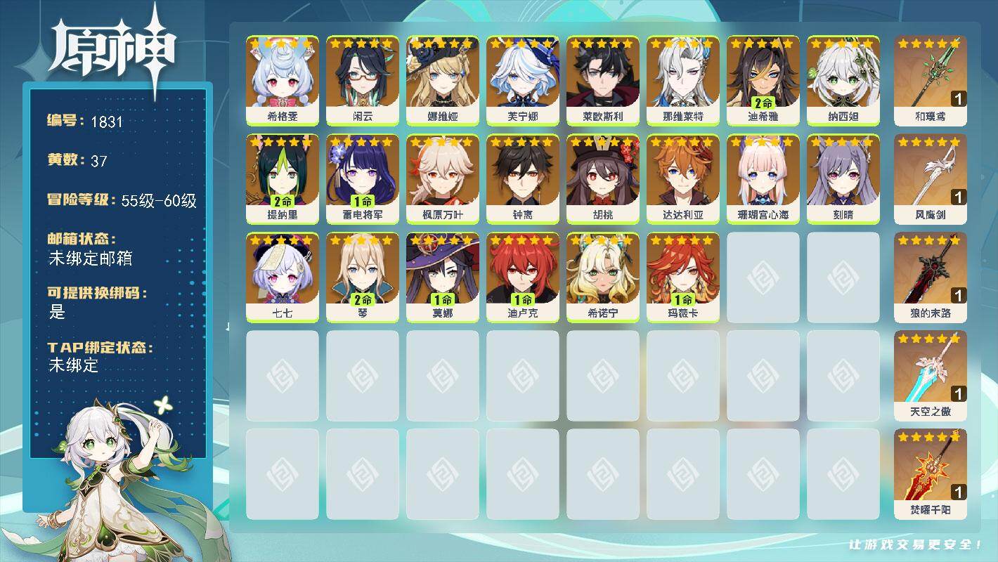 [16422512]59级/37黄/男主/22个五星角色/5个五星武器 0命希格雯0命闲云0命娜维娅0命芙宁娜0命莱欧斯利0命那维莱特2命迪希雅0命纳西妲2命提纳里1命雷电将军0命枫原万叶0命钟离0命胡桃0命达达利亚0命珊瑚宫心海0命刻晴0命七七2命琴1命莫娜1命迪卢克0命希诺宁1命玛薇卡精1和璞鸢精1风鹰剑精1狼的末路精1天空之傲精1焚曜千阳