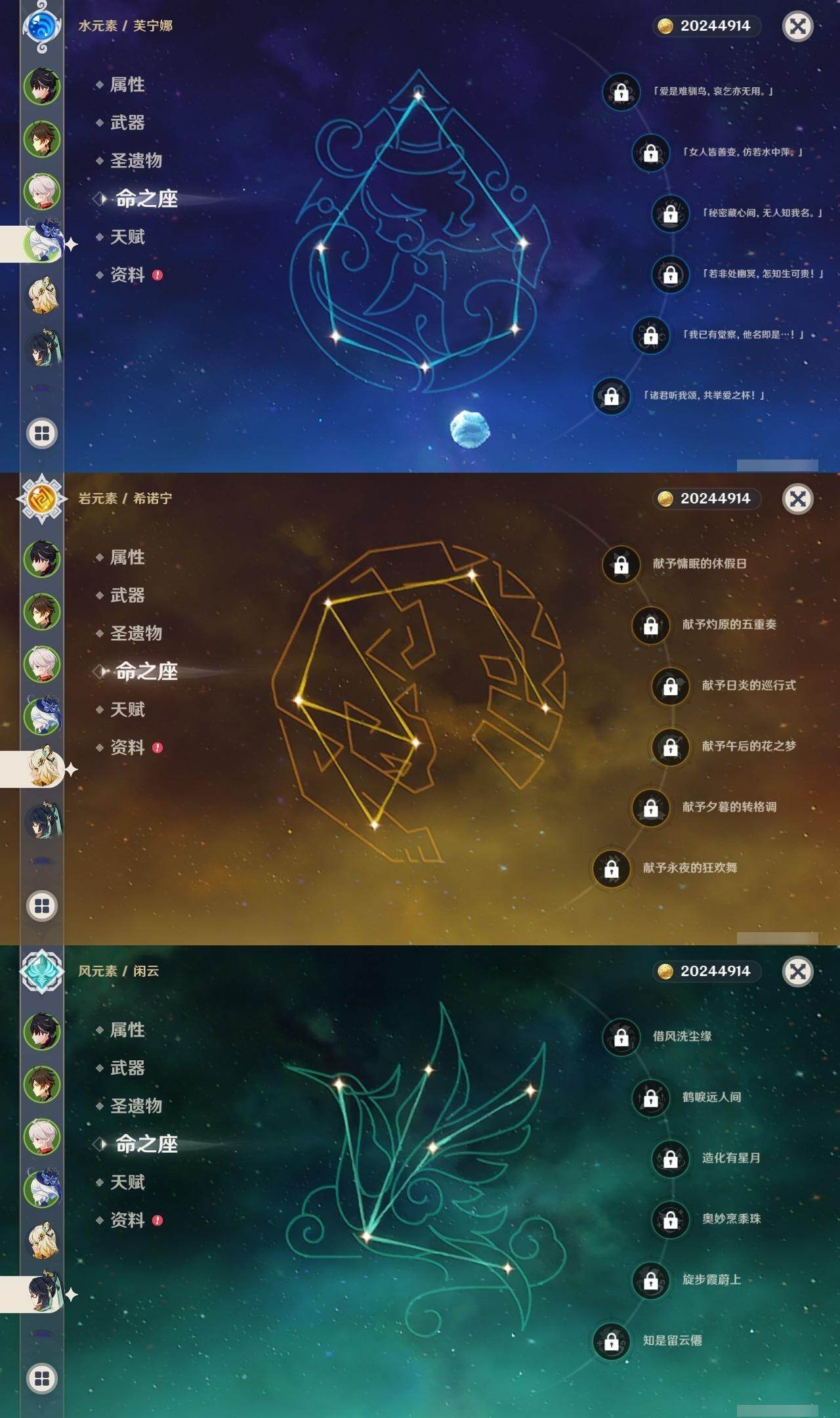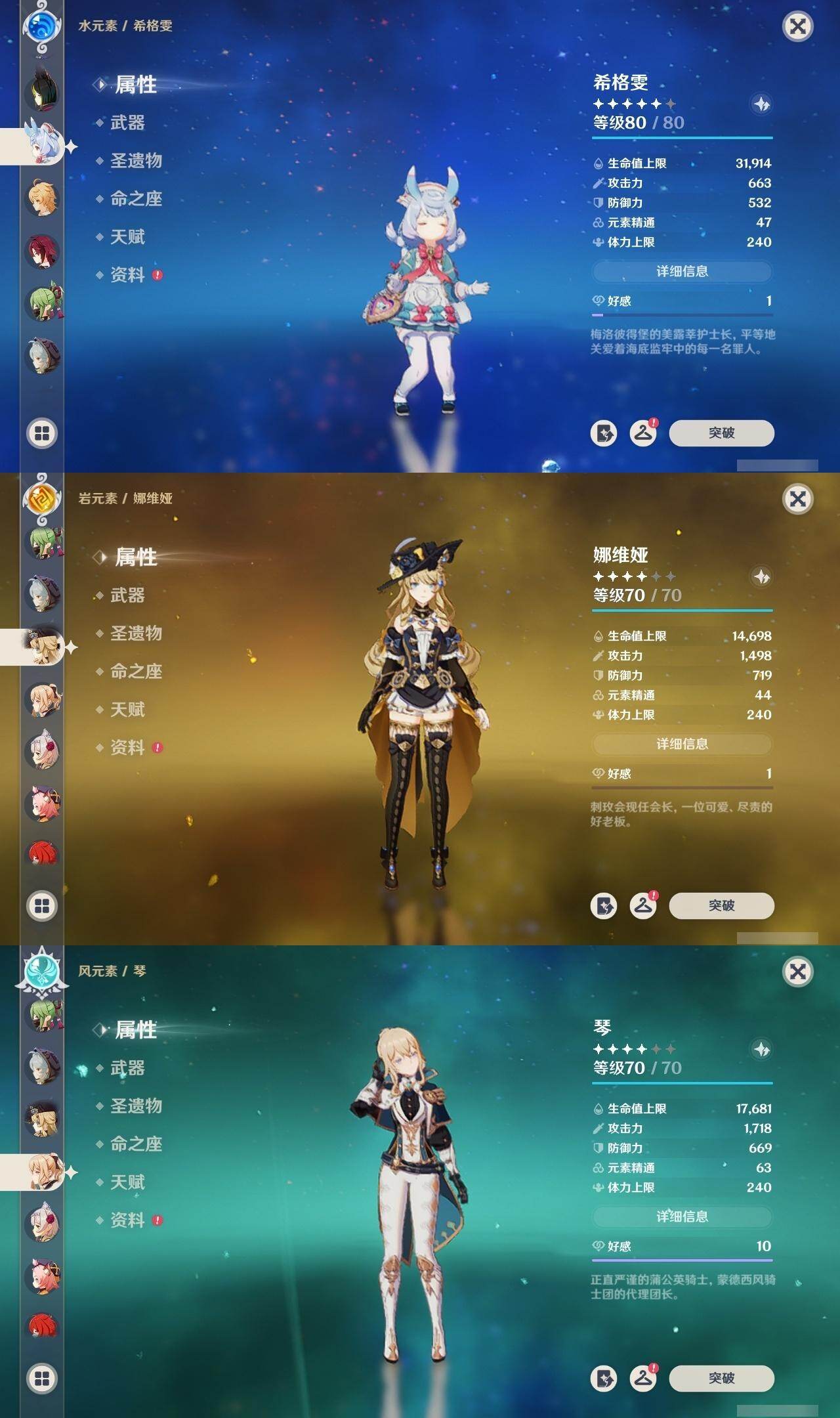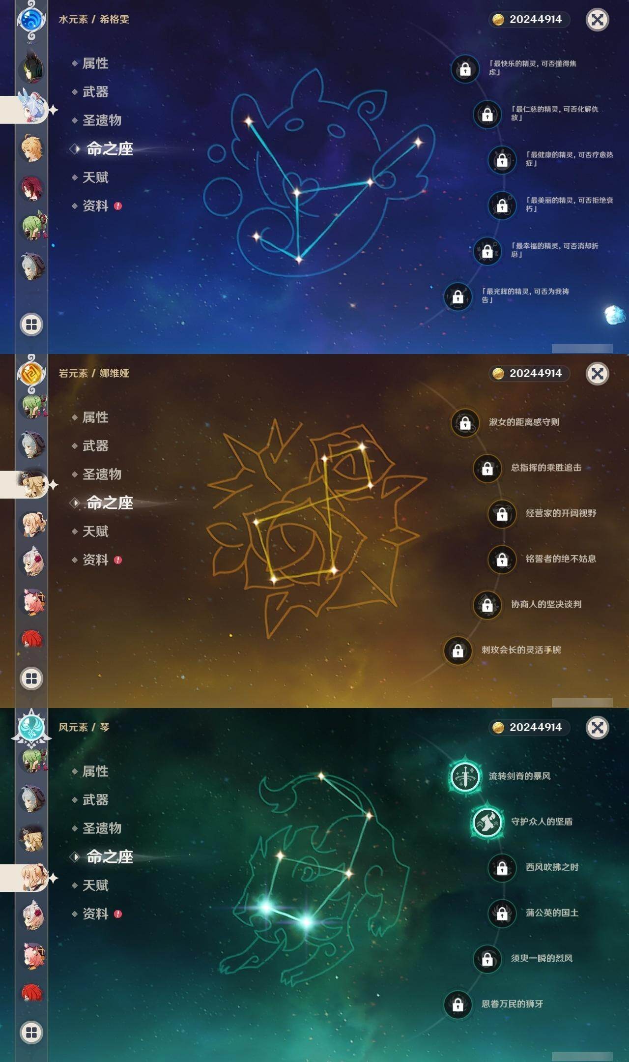 [16422512]59级/37黄/男主/22个五星角色/5个五星武器 0命希格雯0命闲云0命娜维娅0命芙宁娜0命莱欧斯利0命那维莱特2命迪希雅0命纳西妲2命提纳里1命雷电将军0命枫原万叶0命钟离0命胡桃0命达达利亚0命珊瑚宫心海0命刻晴0命七七2命琴1命莫娜1命迪卢克0命希诺宁1命玛薇卡精1和璞鸢精1风鹰剑精1狼的末路精1天空之傲精1焚曜千阳