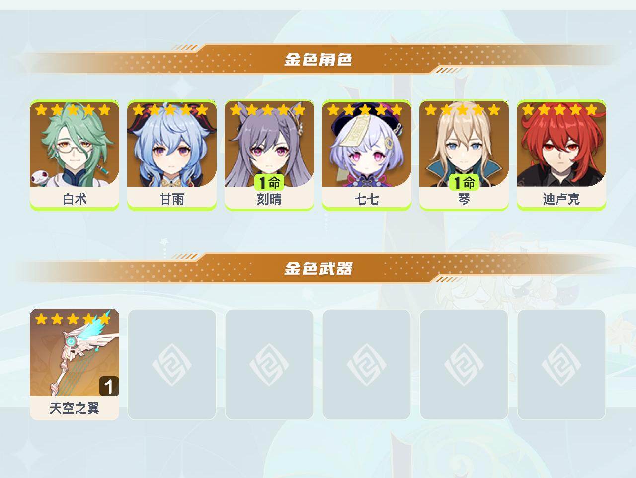 【ysyt785】55级/9黄/女主/6个五星角色/1个五星武器/0命甘雨/1命琴/0命迪卢克/0命白术/0命七七/1命刻晴/精1天空之翼